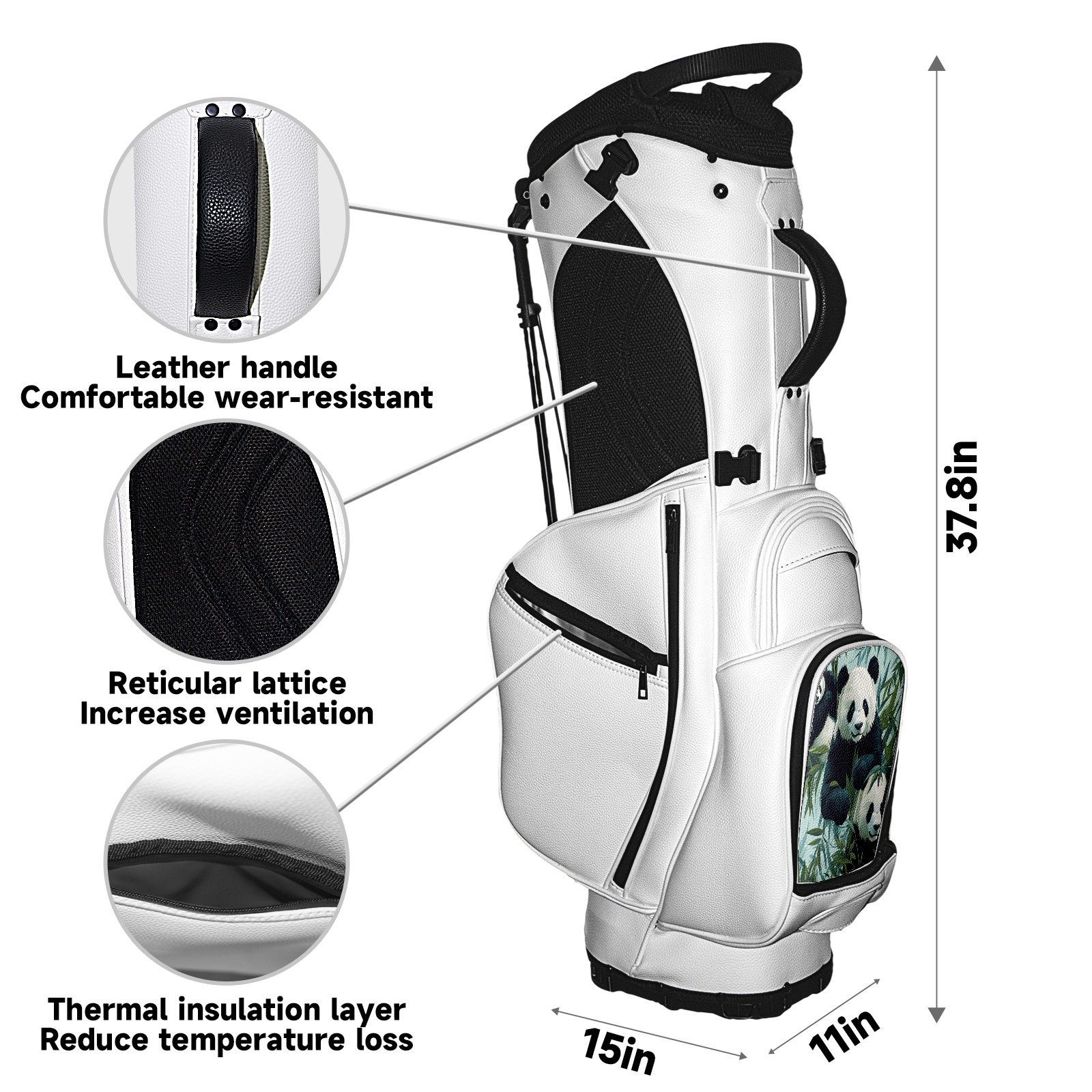 <p>This golf bag combines style, durability, and practicality: crafted from premium waterproof PU leather, its classic white design suits both golf and business occasions; a 5-way full-length top divider allows for organized club storage, preventing scratches and making it suitable for daily practice and tournaments; the front pocket and rain cover have a 15x15cm embroidery area for personalization, showcasing a unique style; it features an adjustable shoulder strap and is compatible with golf carts for easy carrying; and an internal umbrella holder and rain/dust cover, along with hooks, loops, and zipper closures, provide all-around protection for clubs and personal belongings in the rain. It's a Unisex golf gear piece that balances aesthetics and performance.</p>
