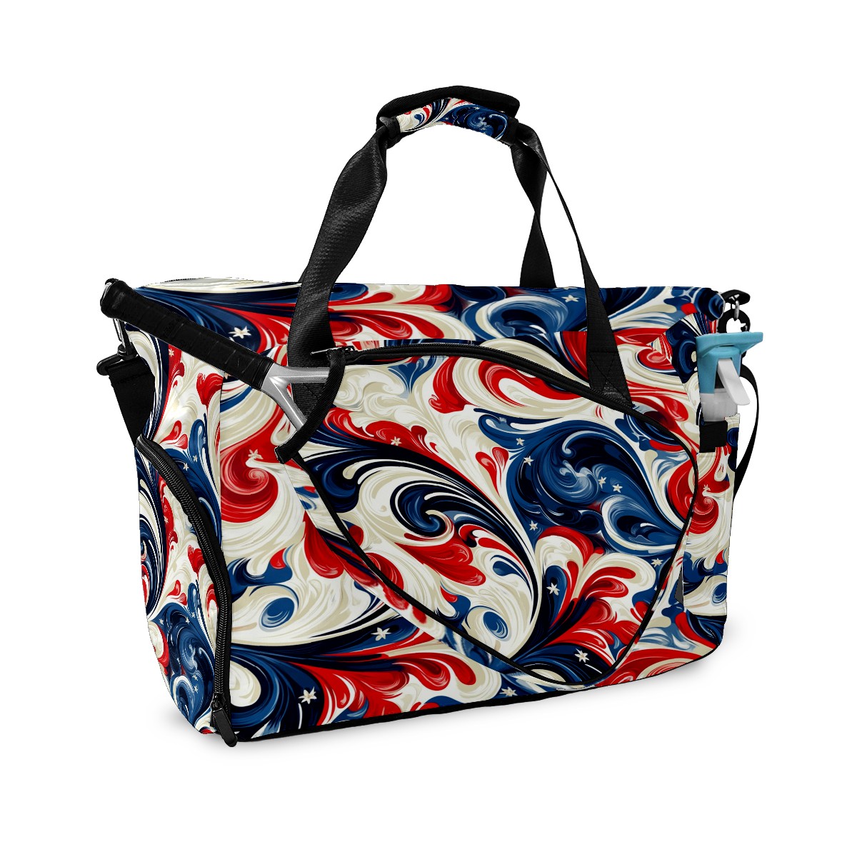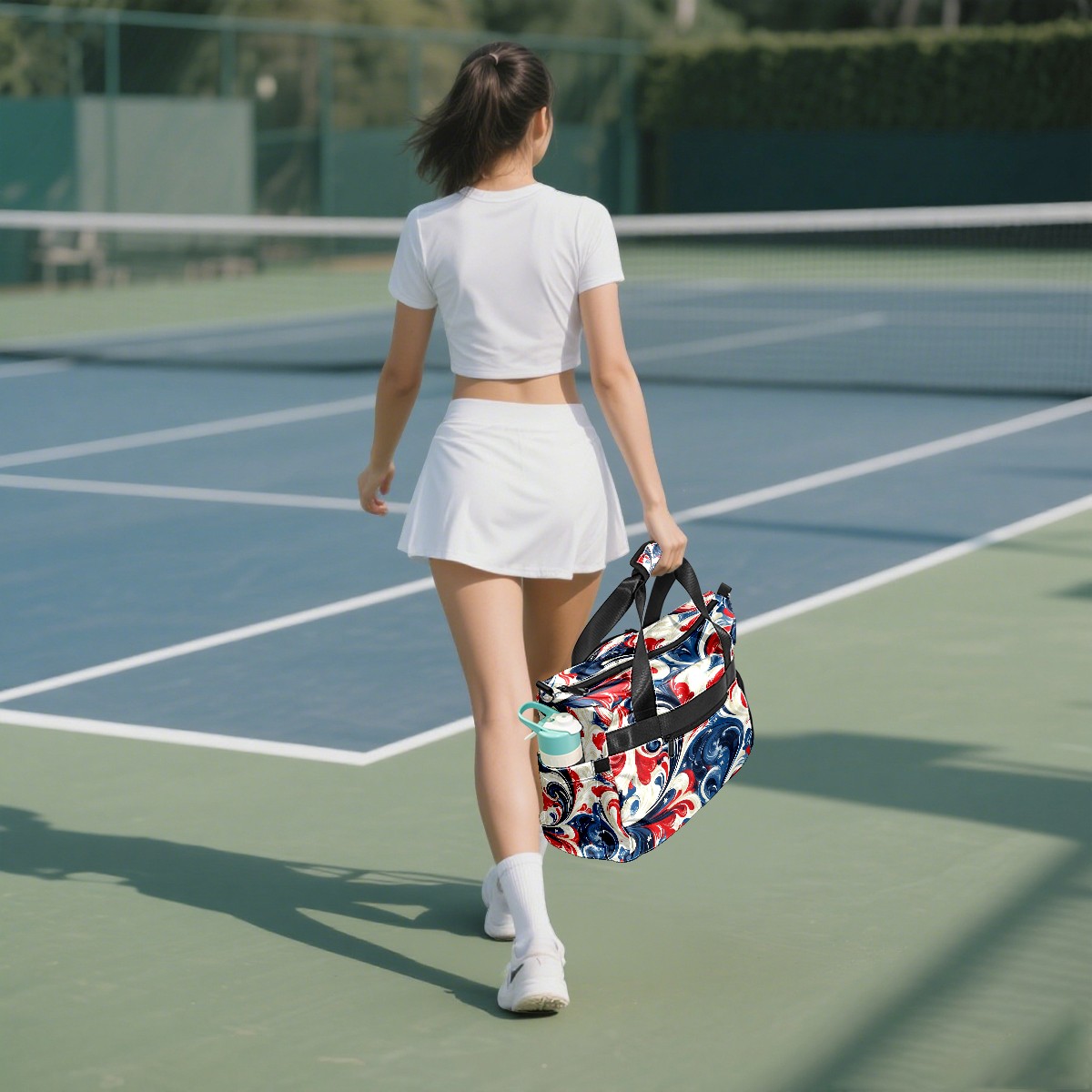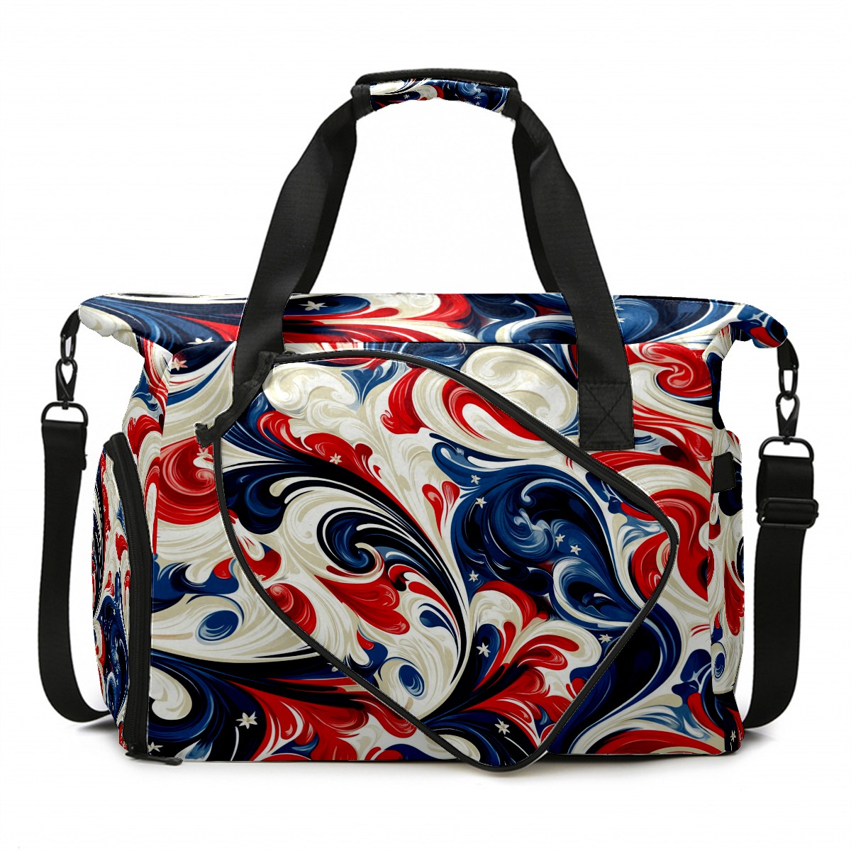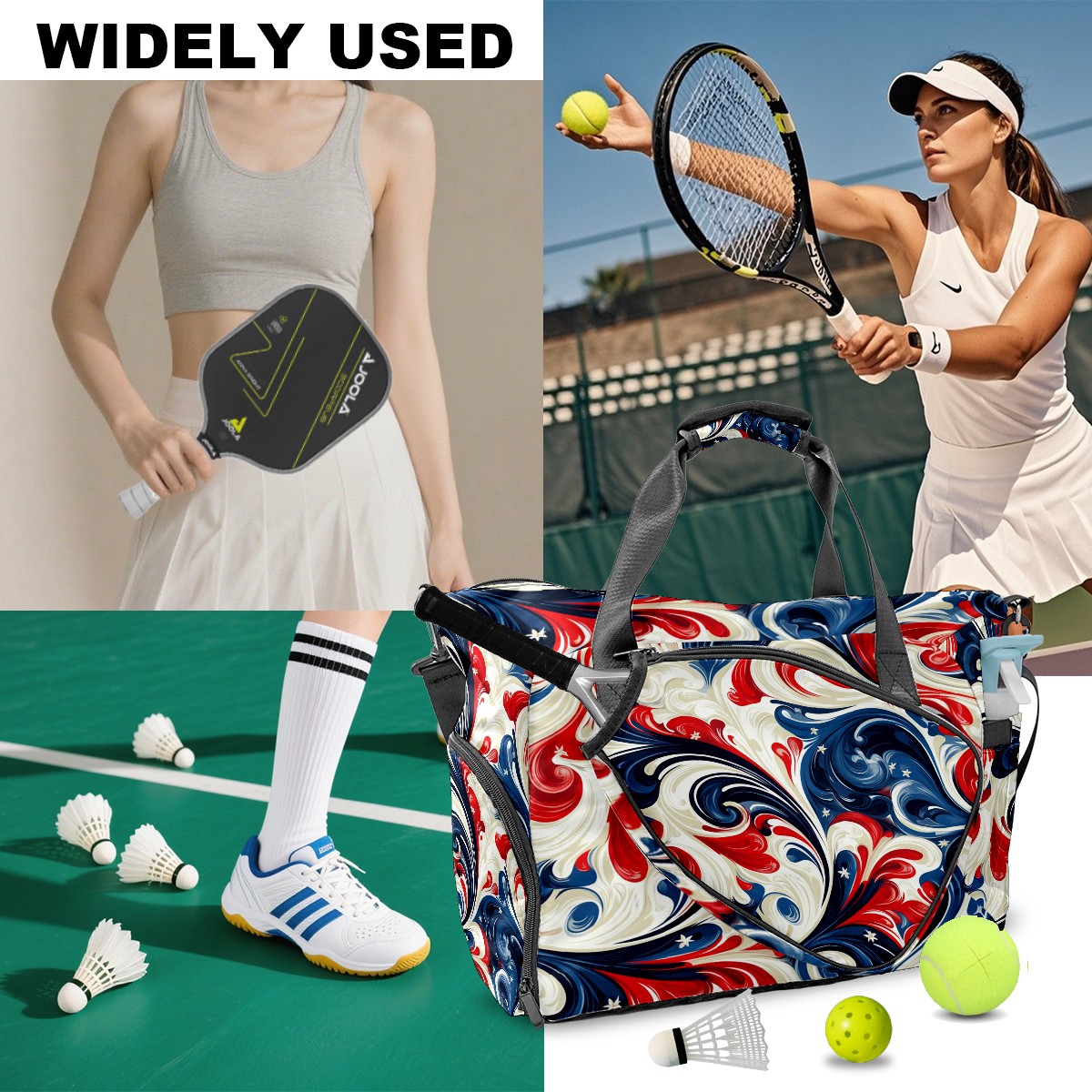 Lightweight Pickleball Tote Bag with Large Capacity, Shoe Compartment, Large Paddle Storage, Water Bottle Holder & Fence Hook for Women & Men Red Blue Swirling Pattern