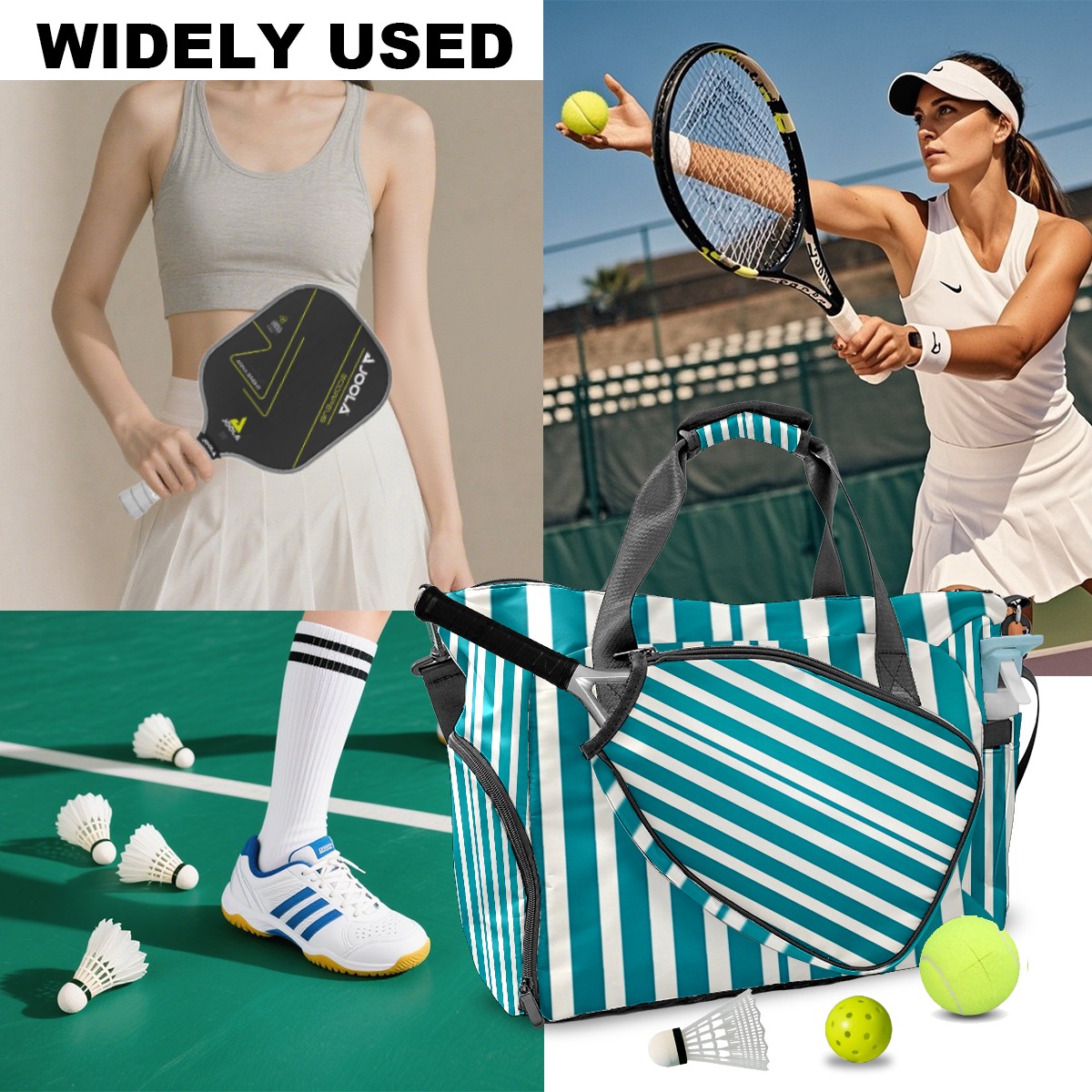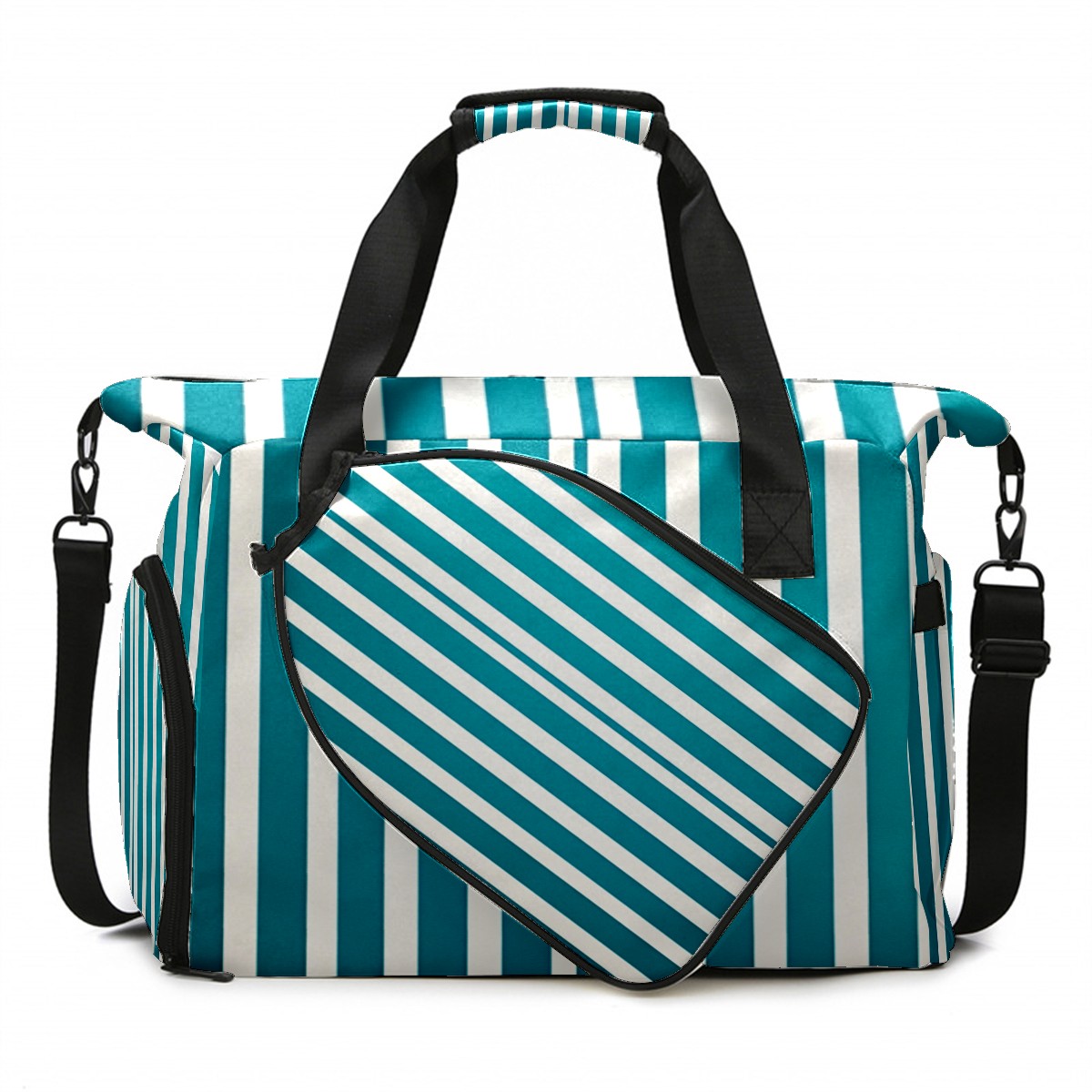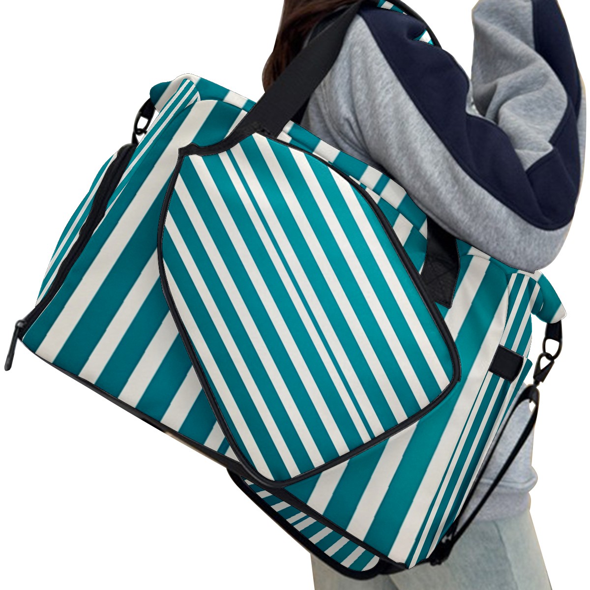 Lightweight Pickleball Tote Bag with Large Capacity, Shoe Compartment, Large Paddle Storage, Water Bottle Holder & Fence Hook for Women & Men Blue White Striped Pattern