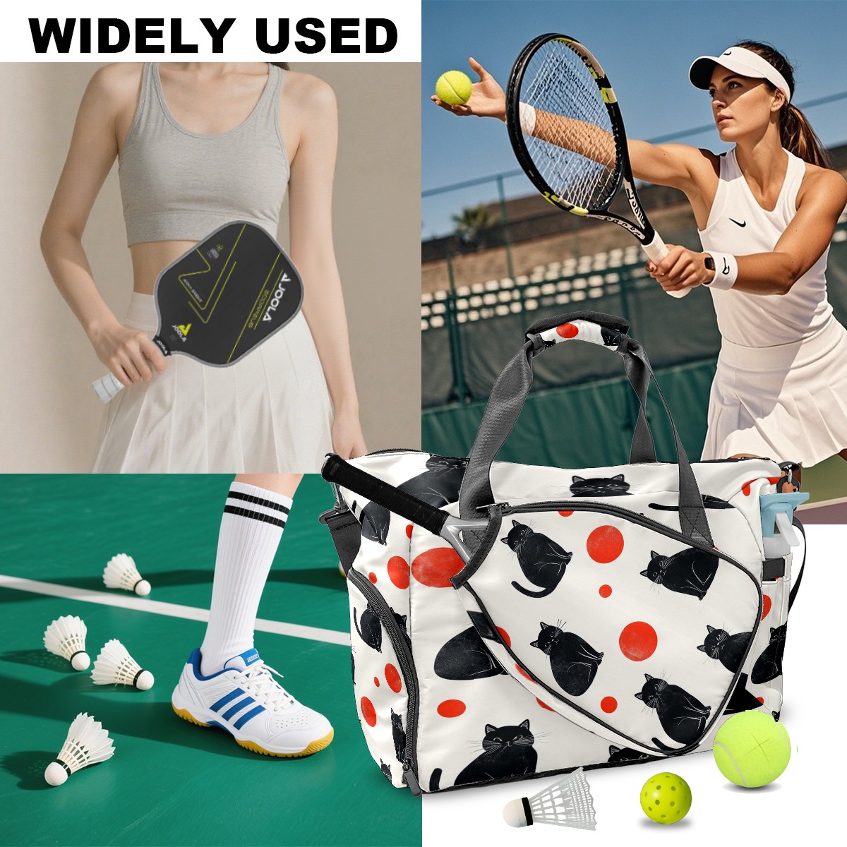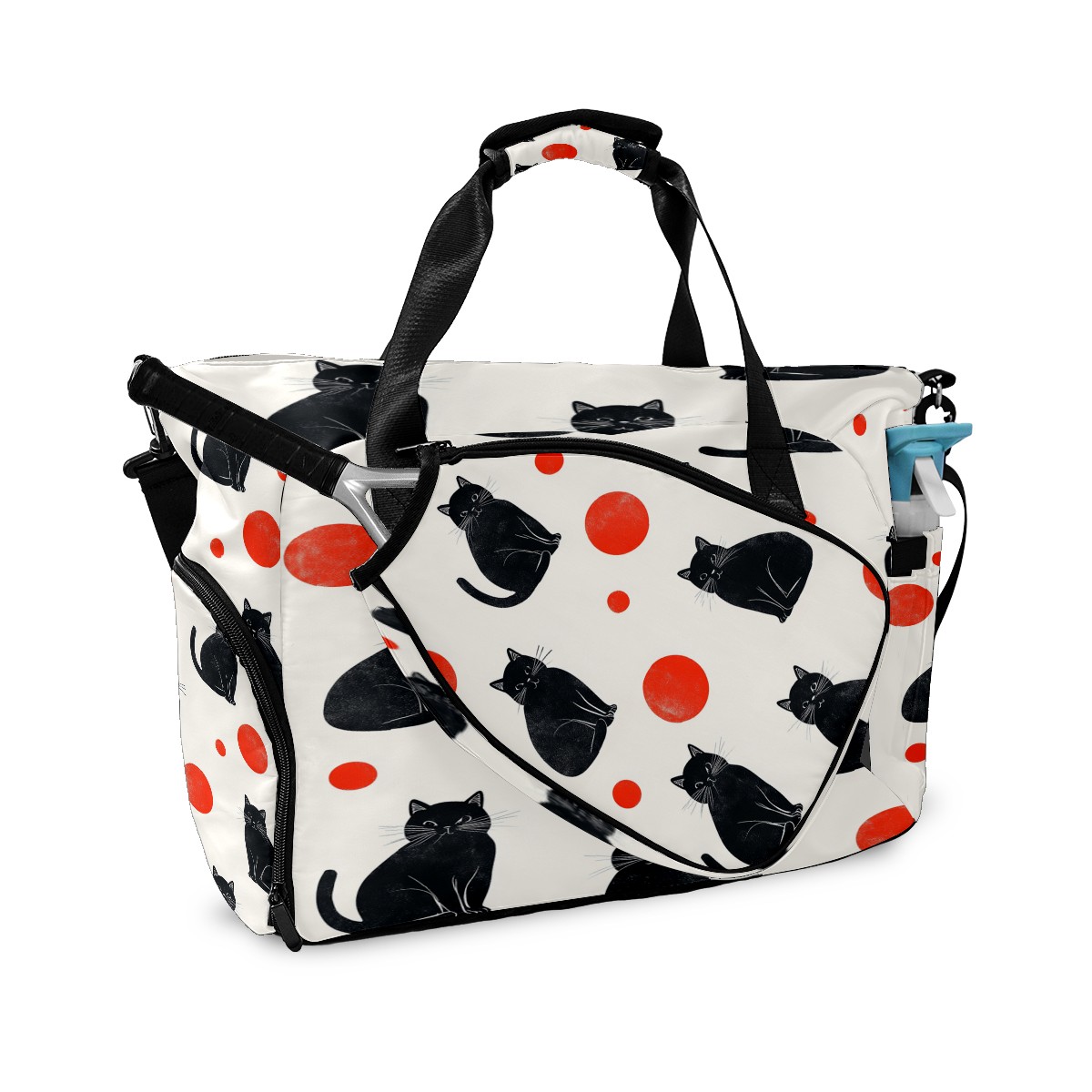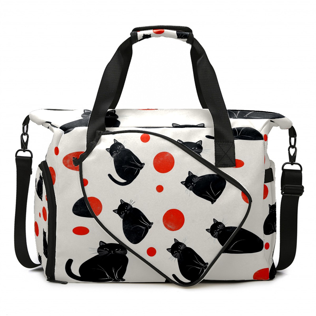 Lightweight Pickleball Tote Bag with Large Capacity, Shoe Compartment, Large Paddle Storage, Water Bottle Holder & Fence Hook for Women & Men Black Cats Red Dots