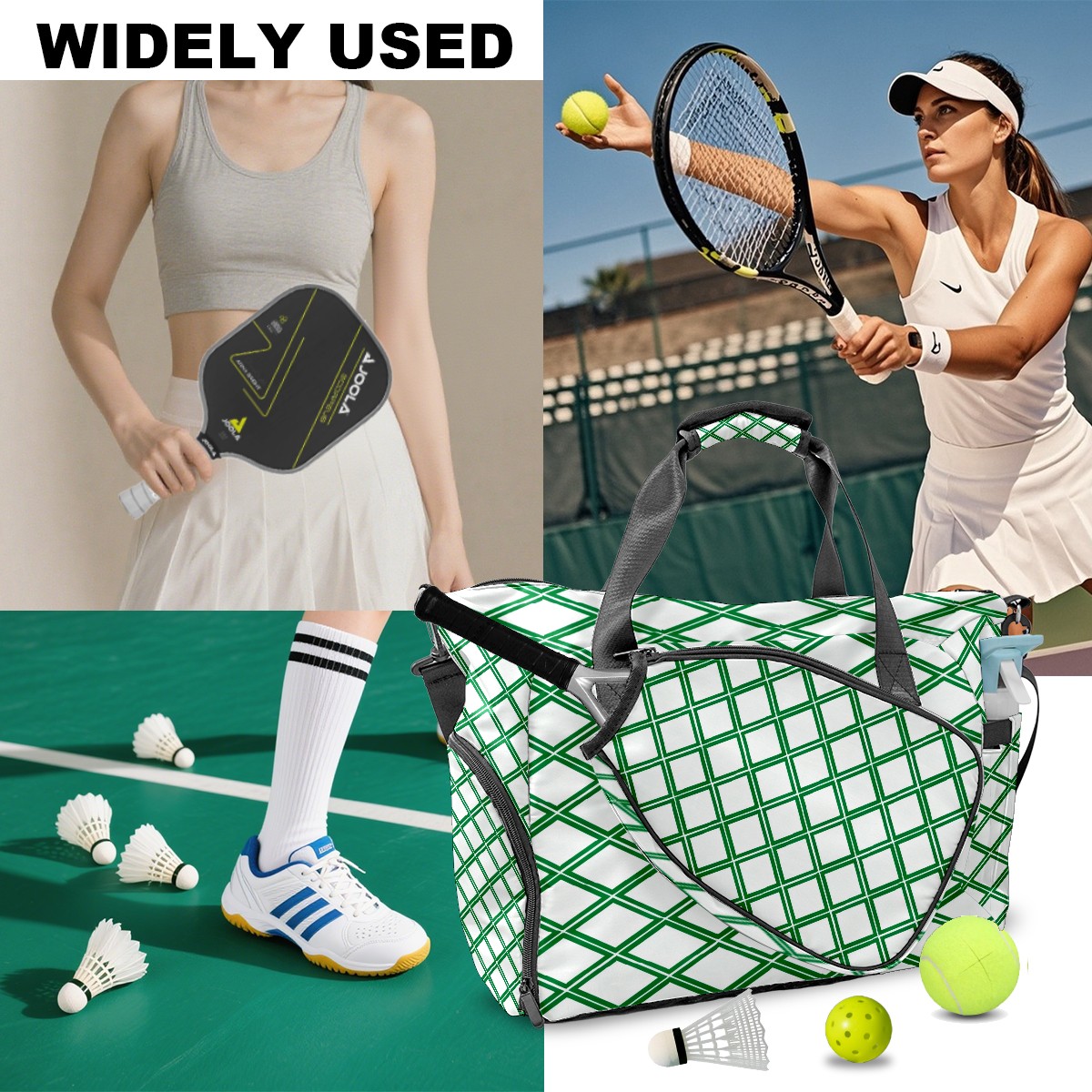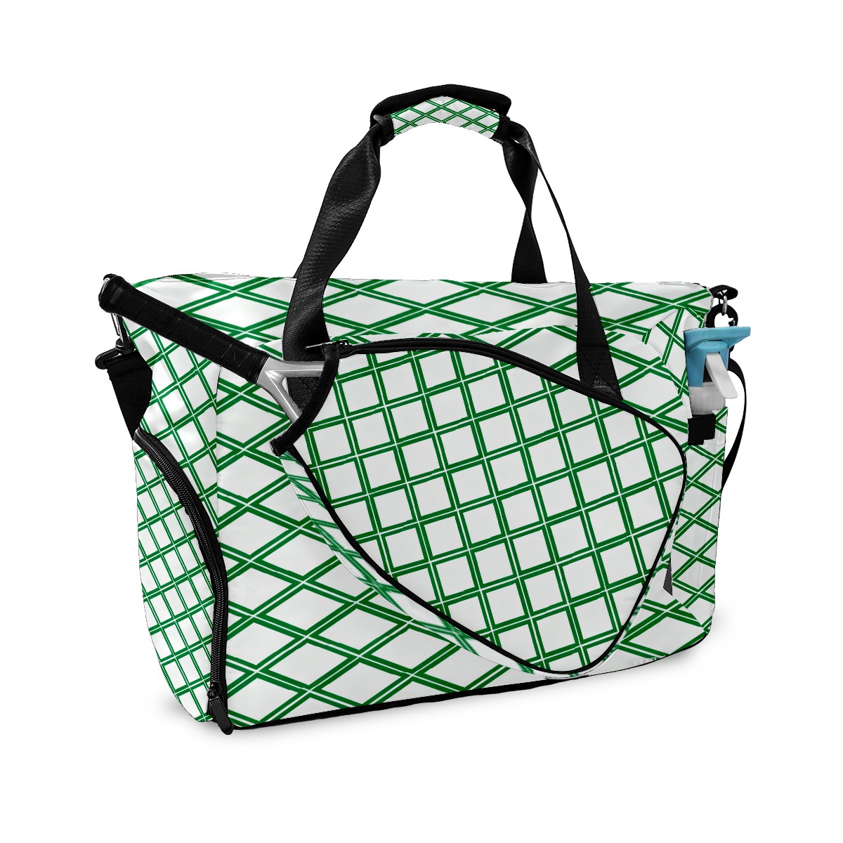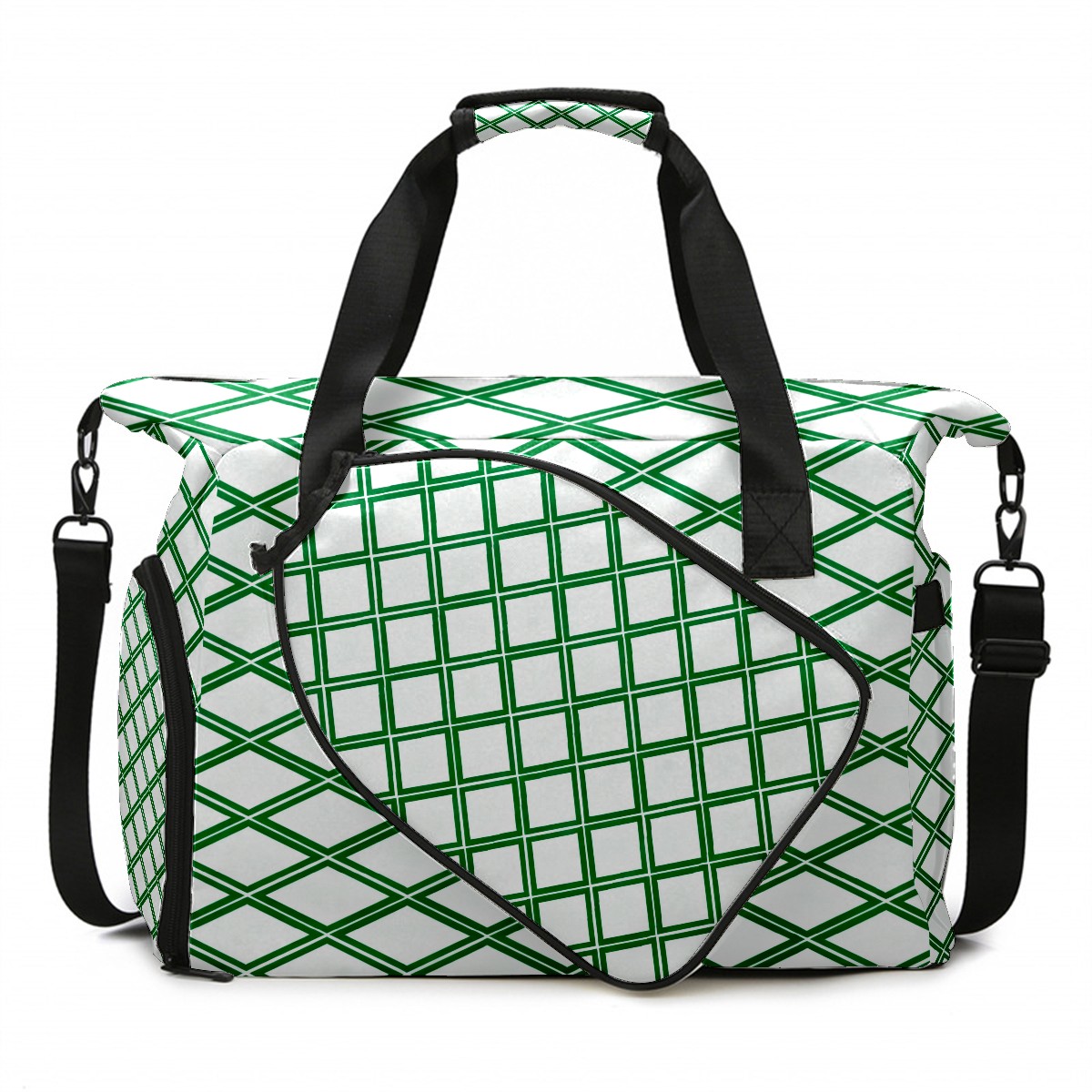 Lightweight Pickleball Tote Bag with Large Capacity, Shoe Compartment, Large Paddle Storage, Water Bottle Holder & Fence Hook for Women & Men Green Geometric Pattern