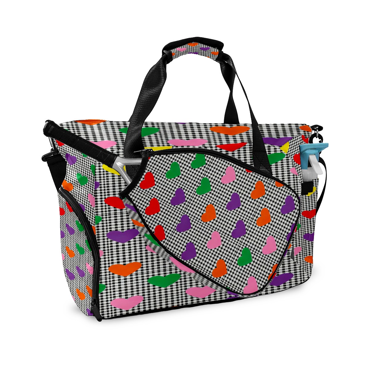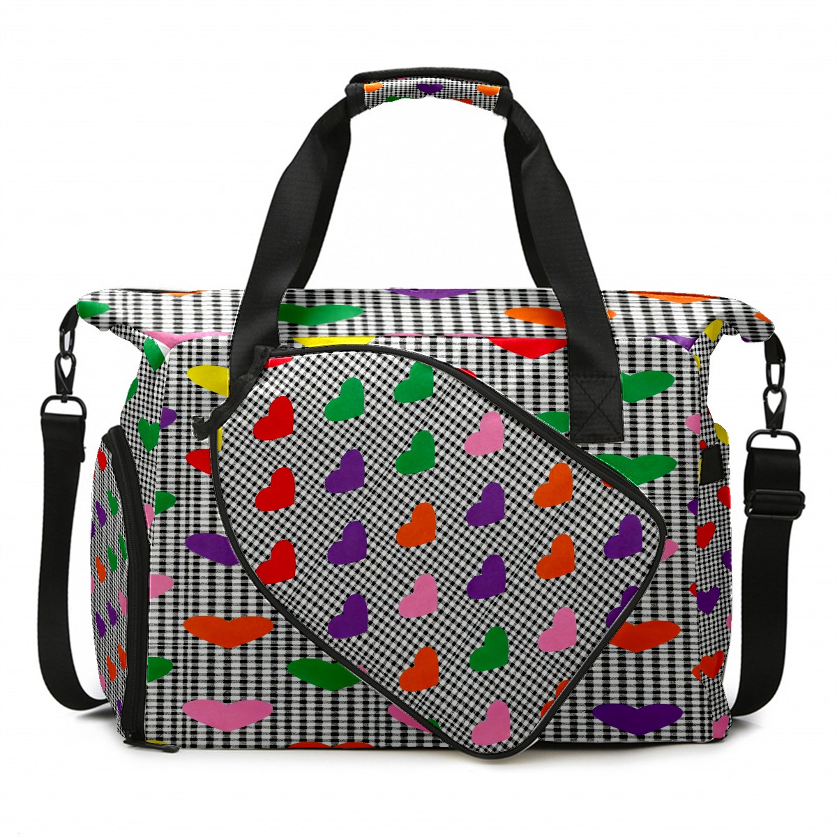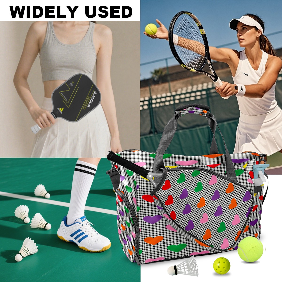 Lightweight Pickleball Tote Bag with Large Capacity, Shoe Compartment, Large Paddle Storage, Water Bottle Holder & Fence Hook for Women & Men Checkered Heart Pattern