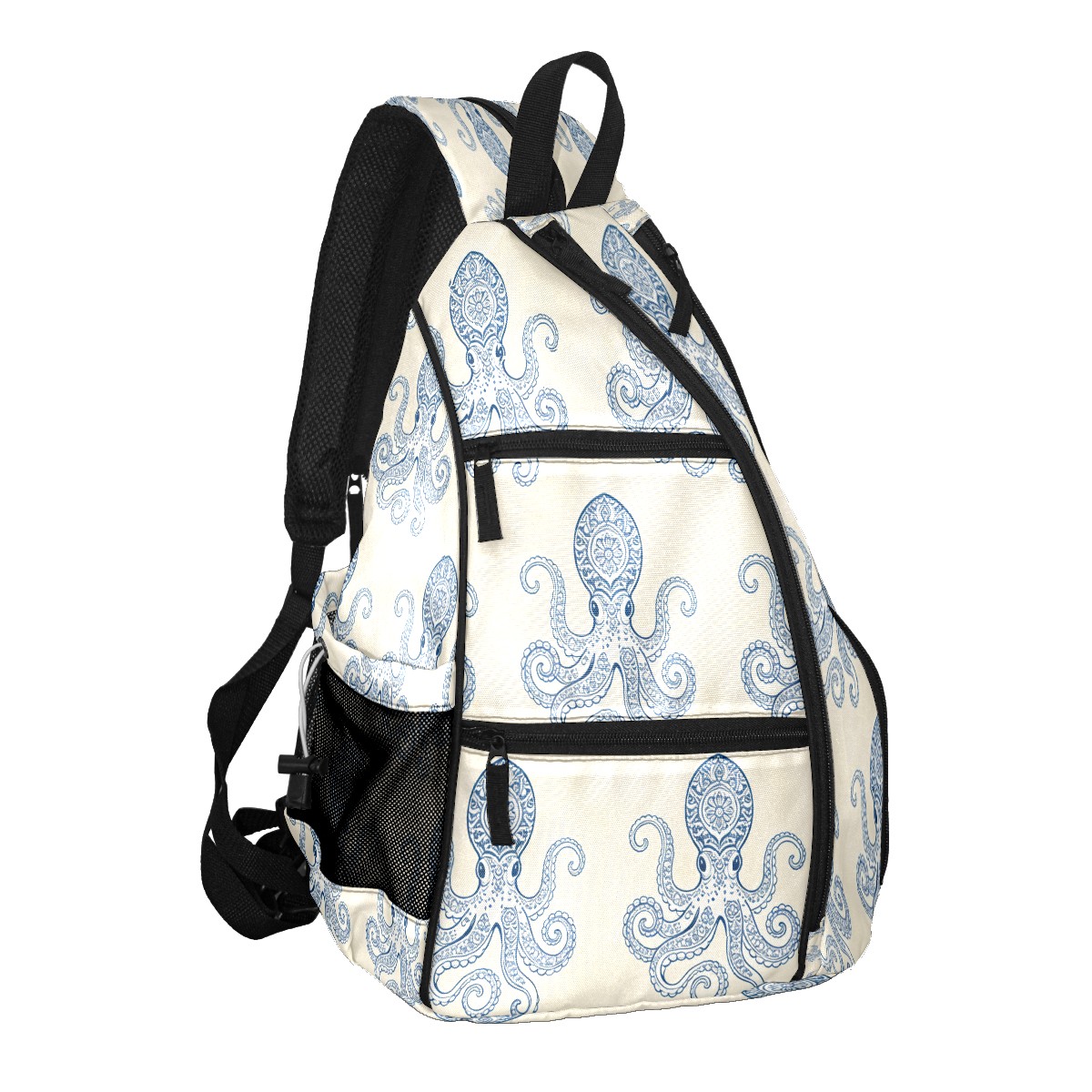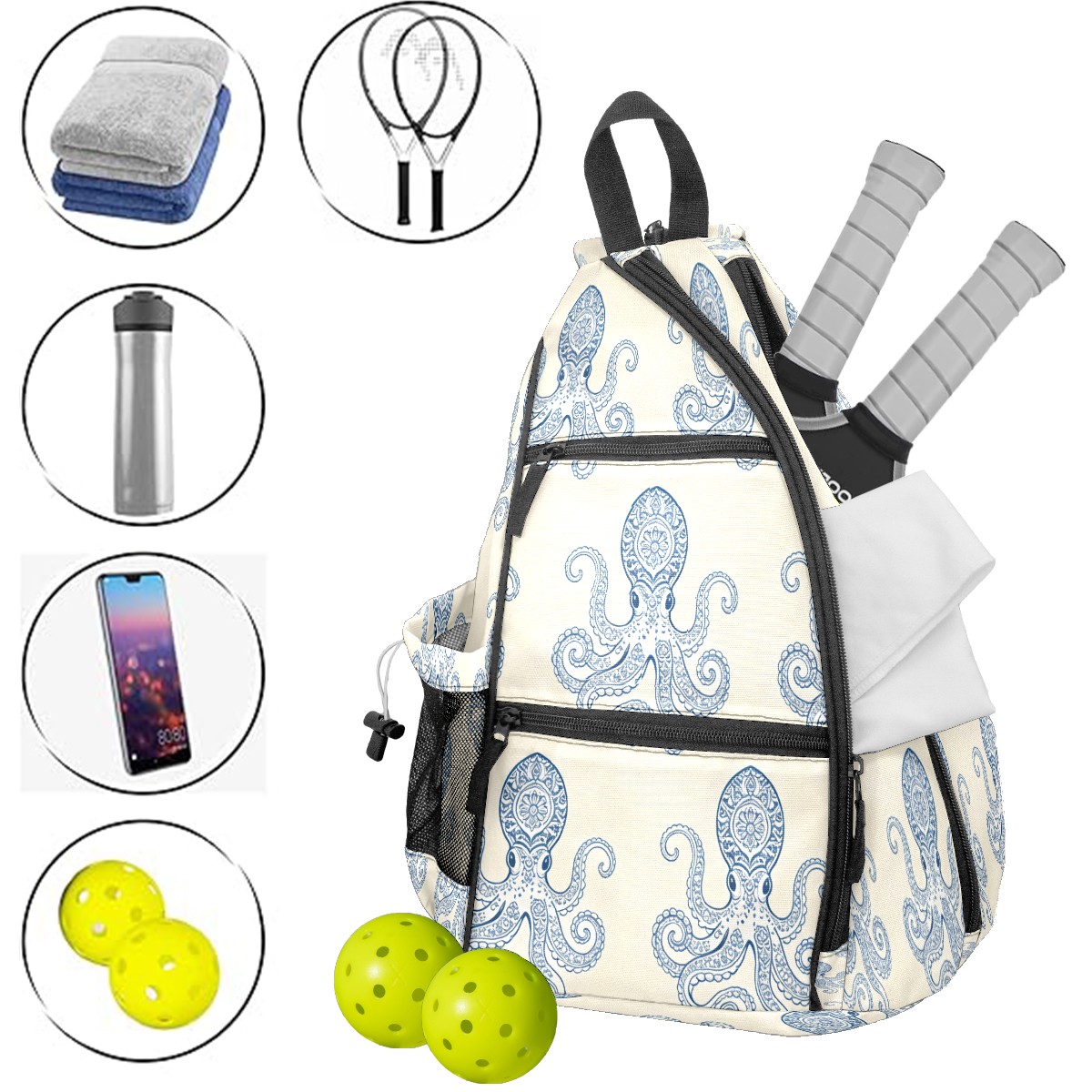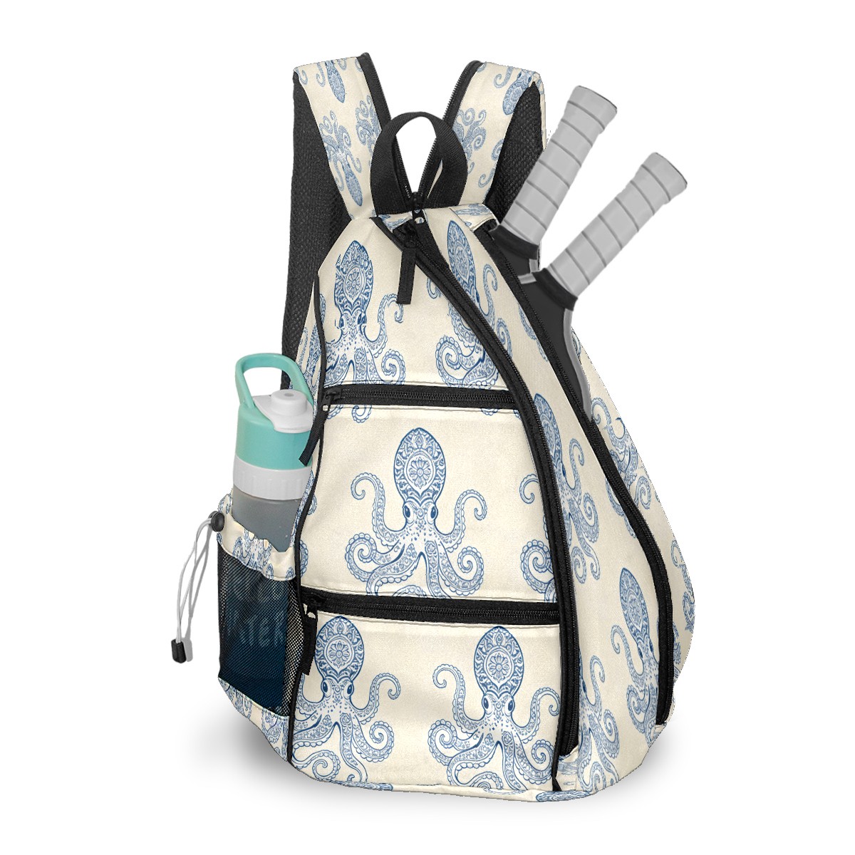 Unisex Pickleball Bag, Waterproof and Large Capacity, with Water Bottle Holder and Adjustable Shoulder Strap,Pickleball Bag Equipment and Gift Blue-striped Octopus