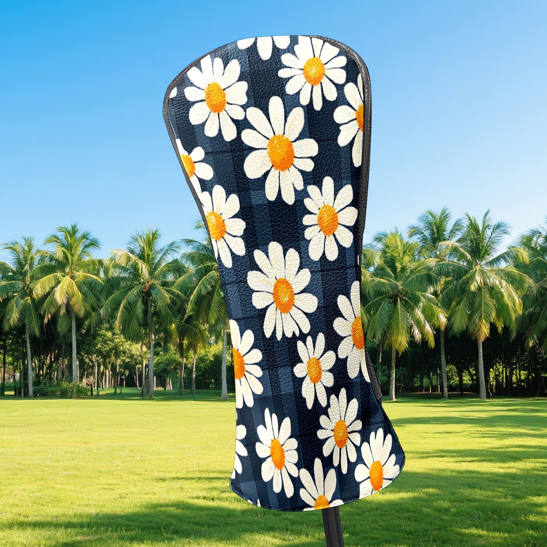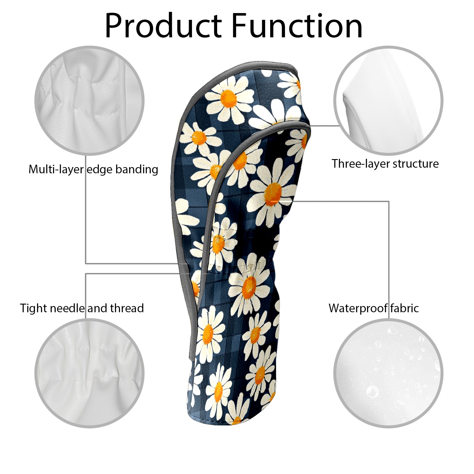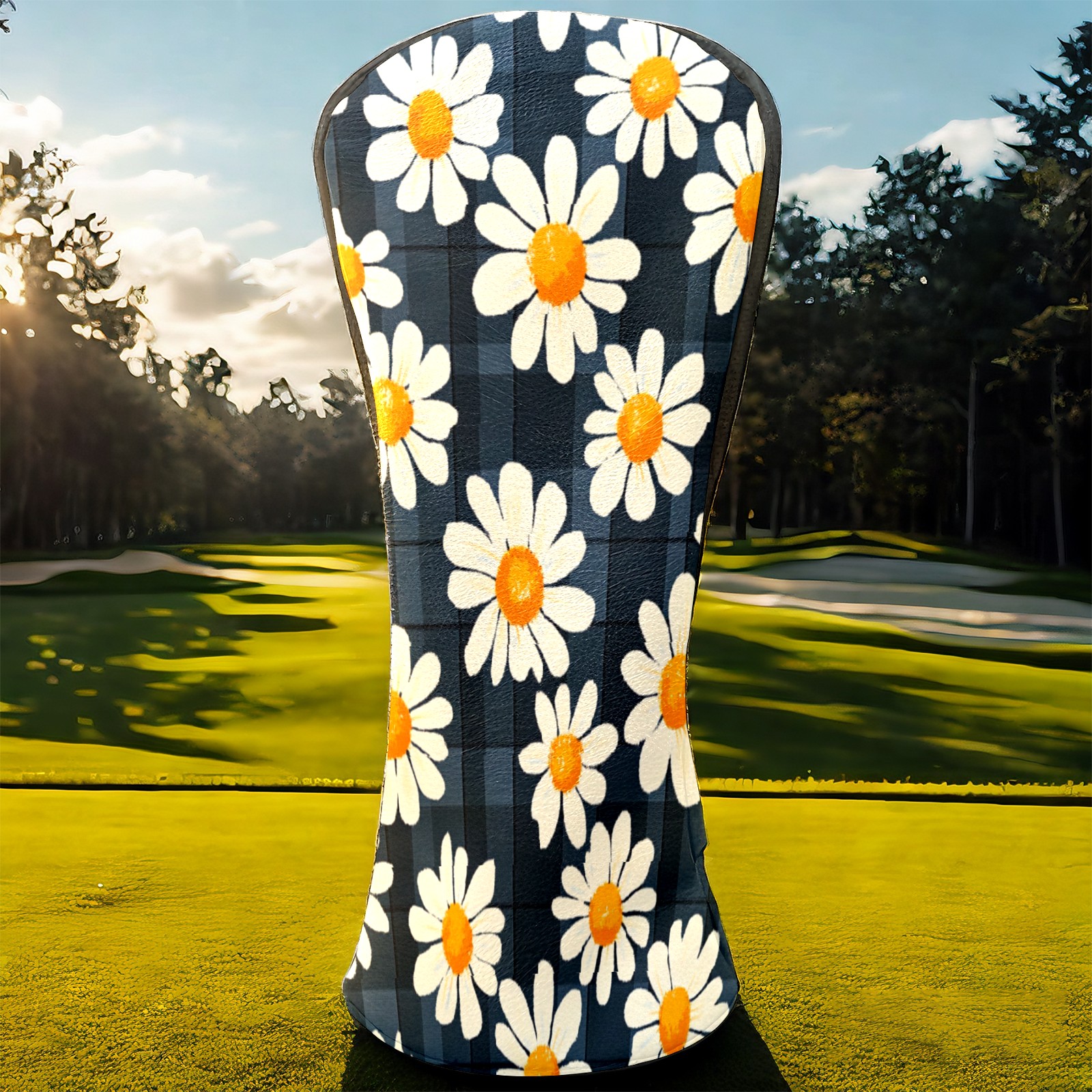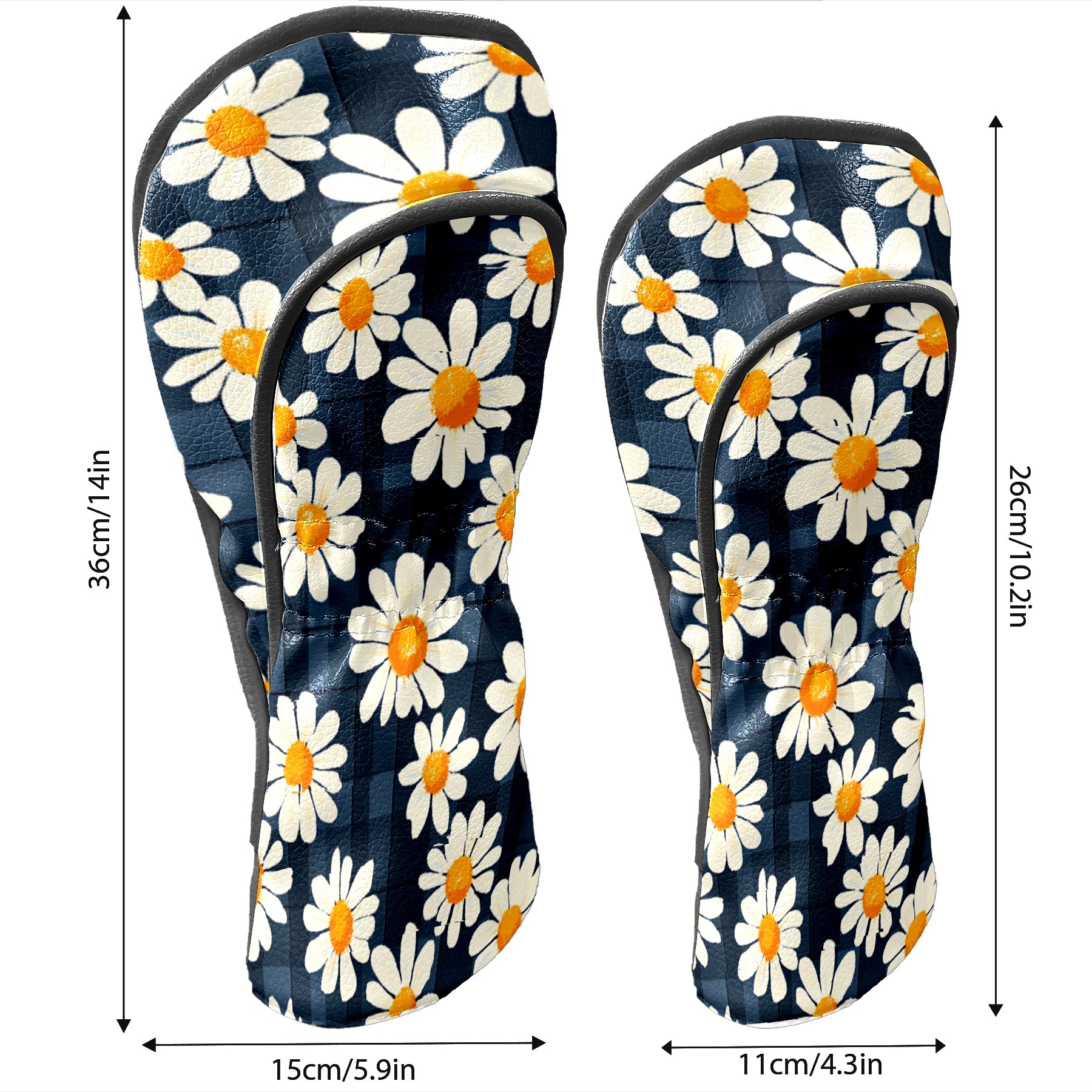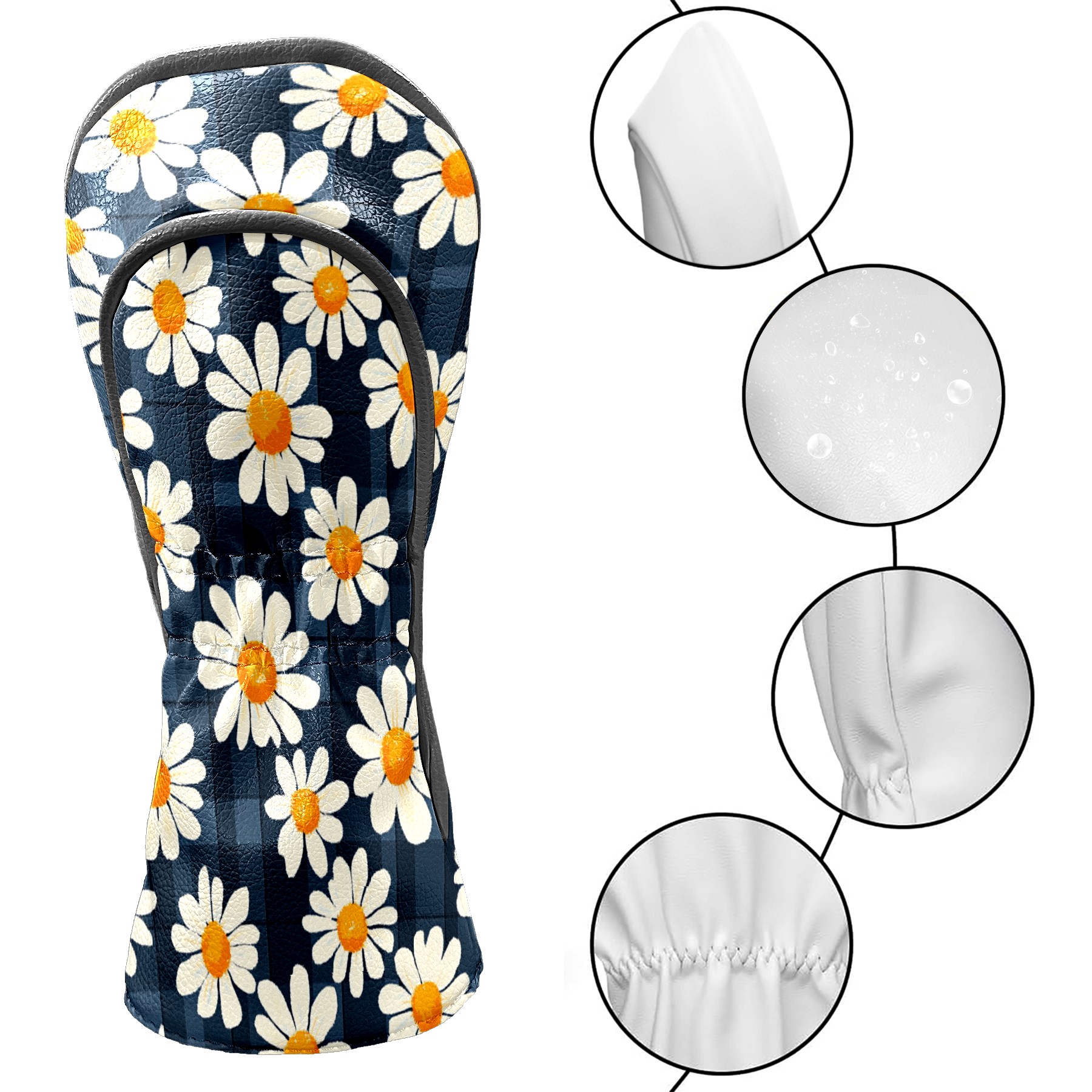 PU Leather Golf Head Covers Set – Fits Drivers/Fairway Woods/Hybrids, Ideal Gifts for Male & Female Golfers Retro Daisies Checkered Pattern