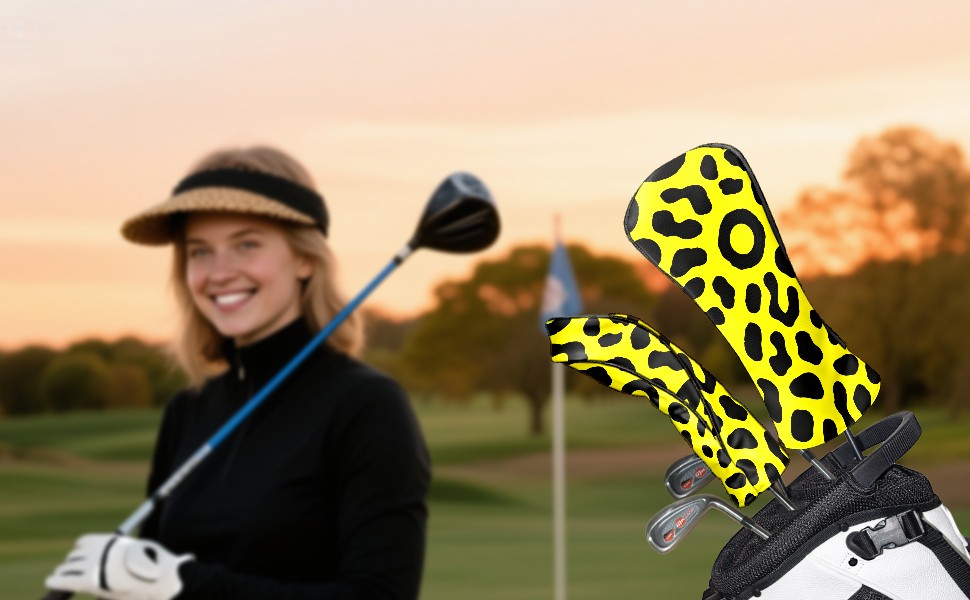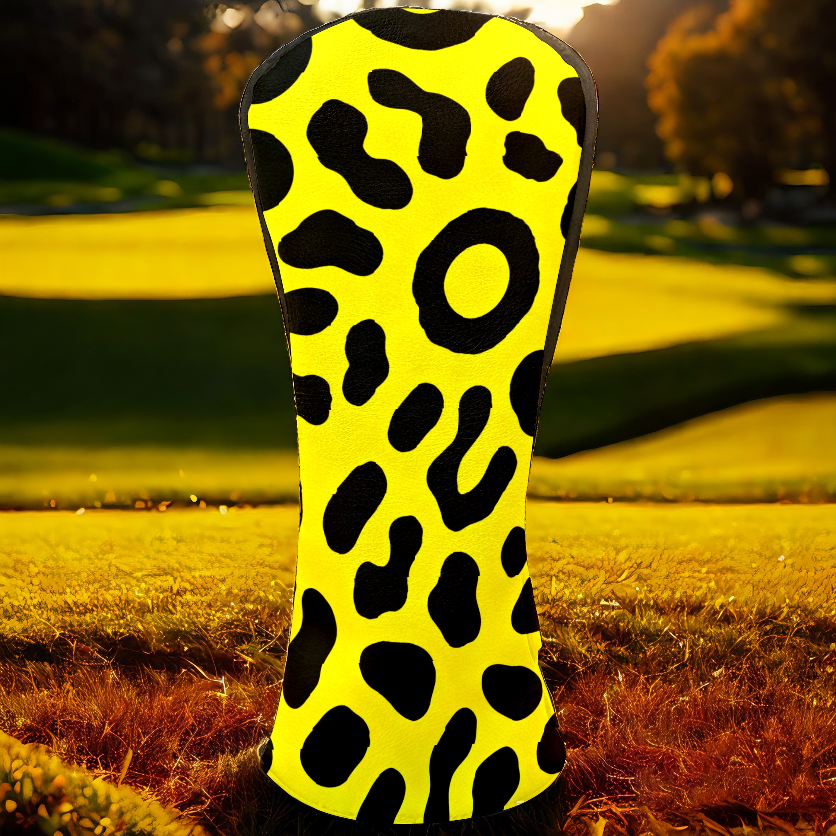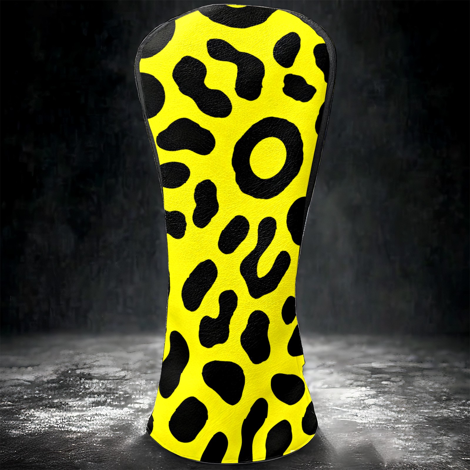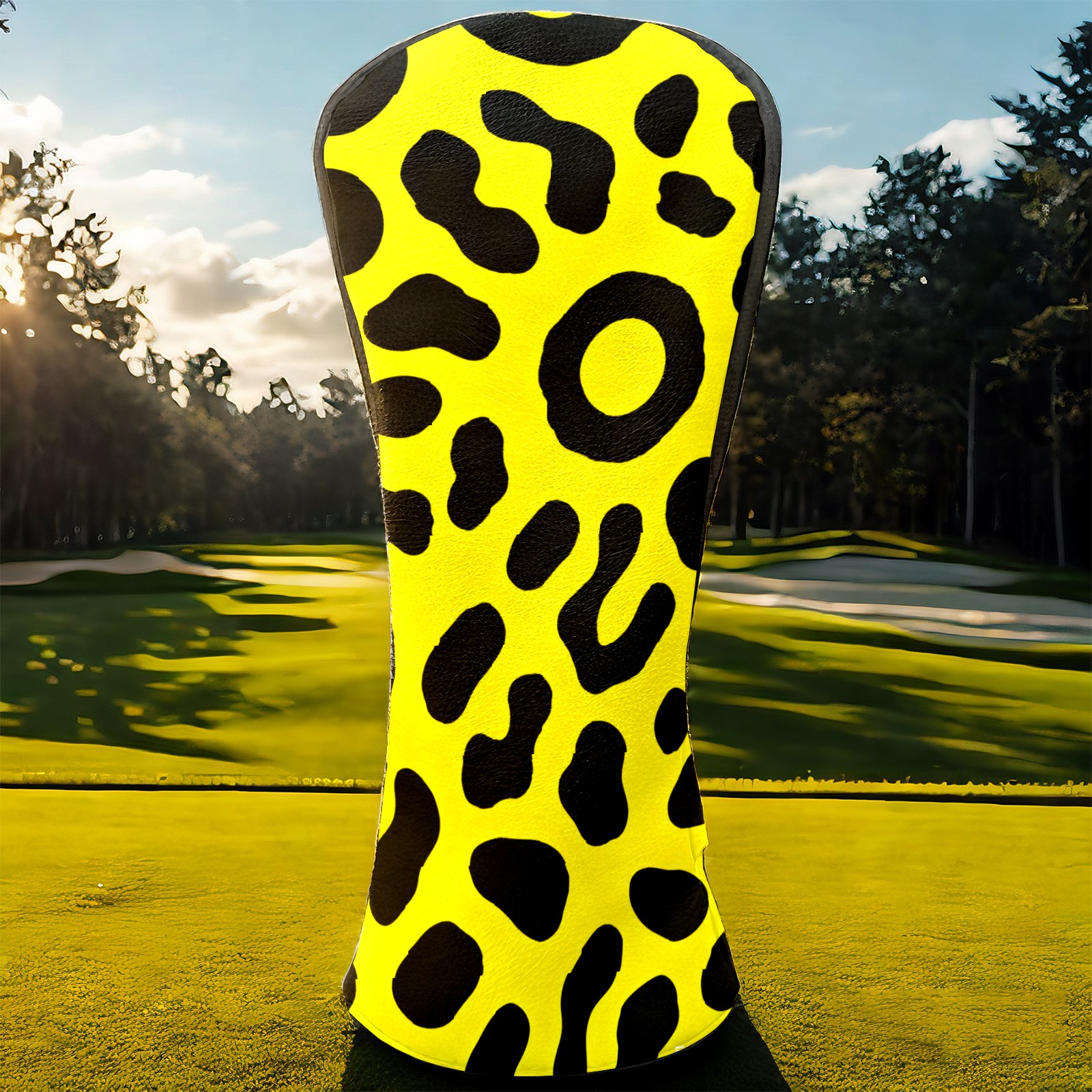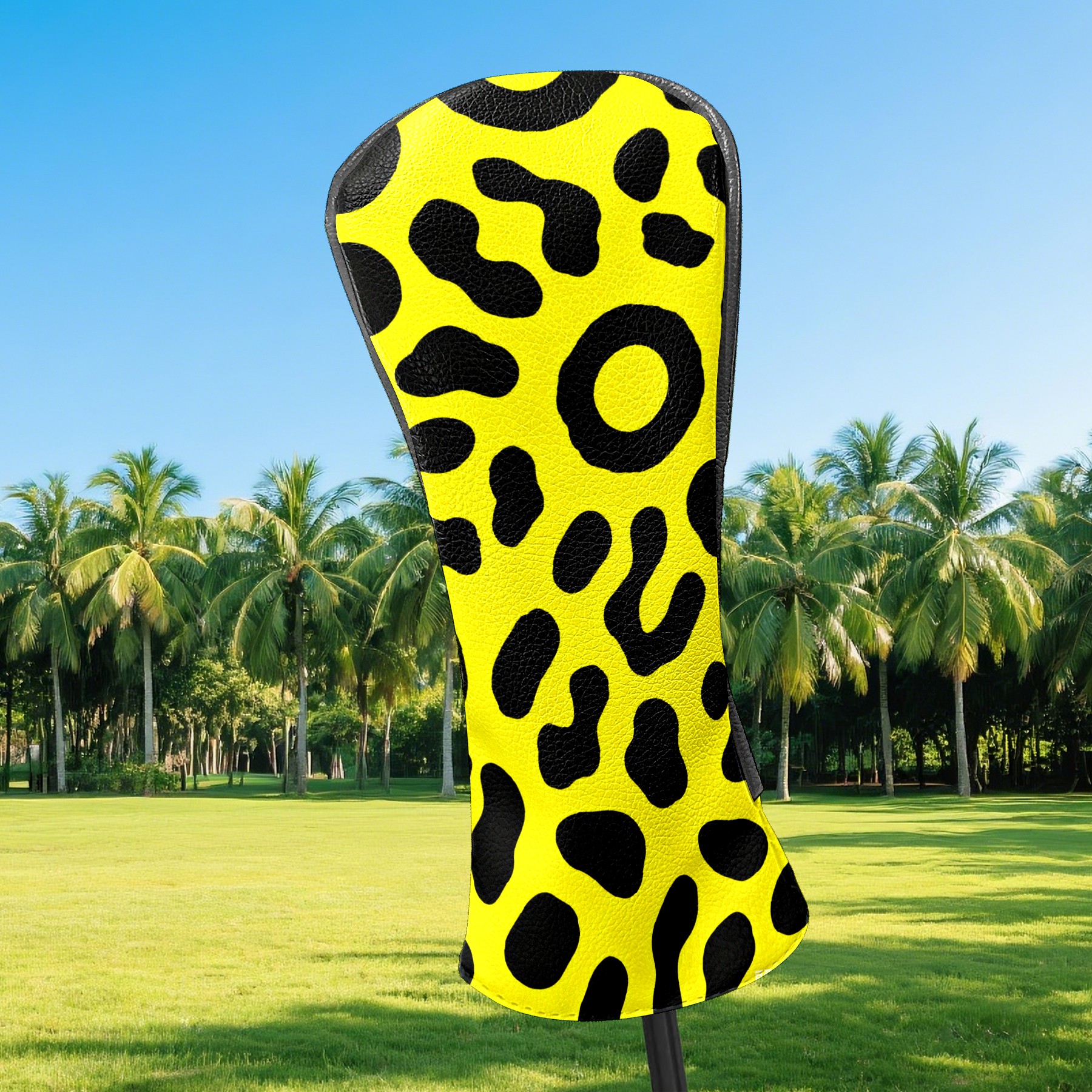 PU Leather Golf Head Covers Set – Fits Drivers/Fairway Woods/Hybrids, Ideal Gifts for Male & Female Golfers Black Yellow Leopard Print Pattern