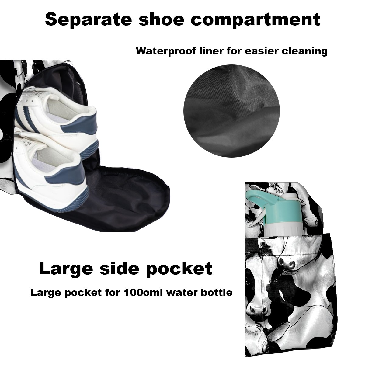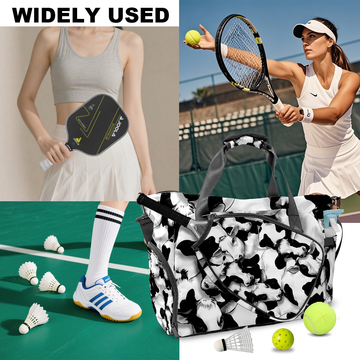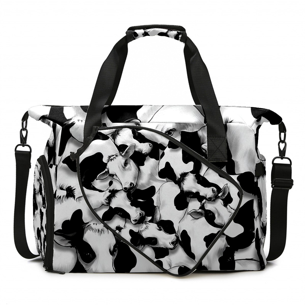 Women's Tennis Bag Large Capacity - Ventilated Shoe Compartment & Waterproof Wet Pocket, Multi-Functional Gym Duffel Bag for Tennis, Yoga, Travel (Trendy Black White Cow)
