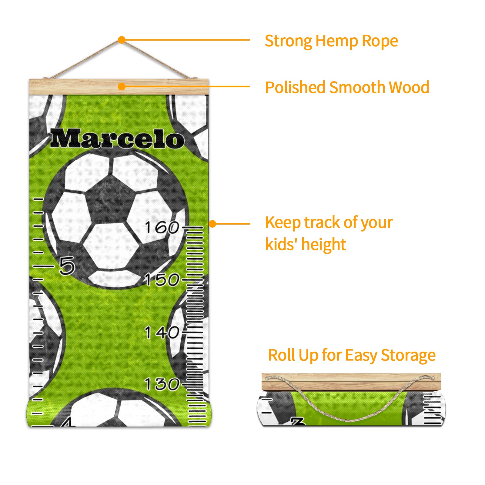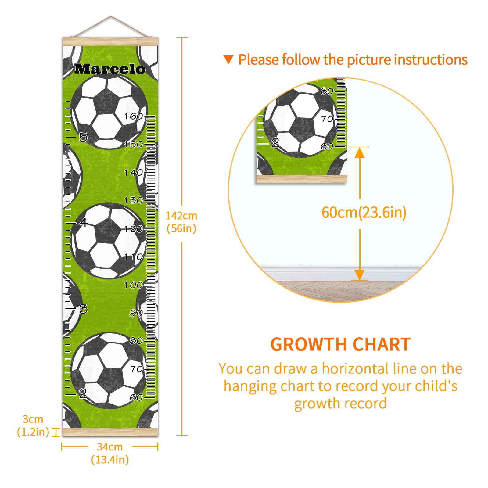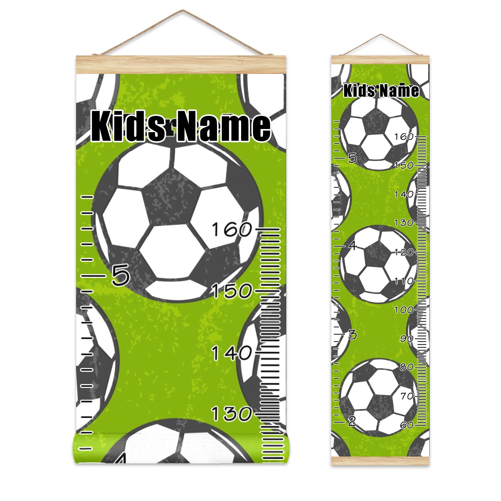 Personalized Kids Name Growth Chart Ruler for Wall Wood Frame Canvas Height Measure Chart 13.4x56 in Hanging Growth Chart Soccor Green12.8 Boys Girls Room Decor
