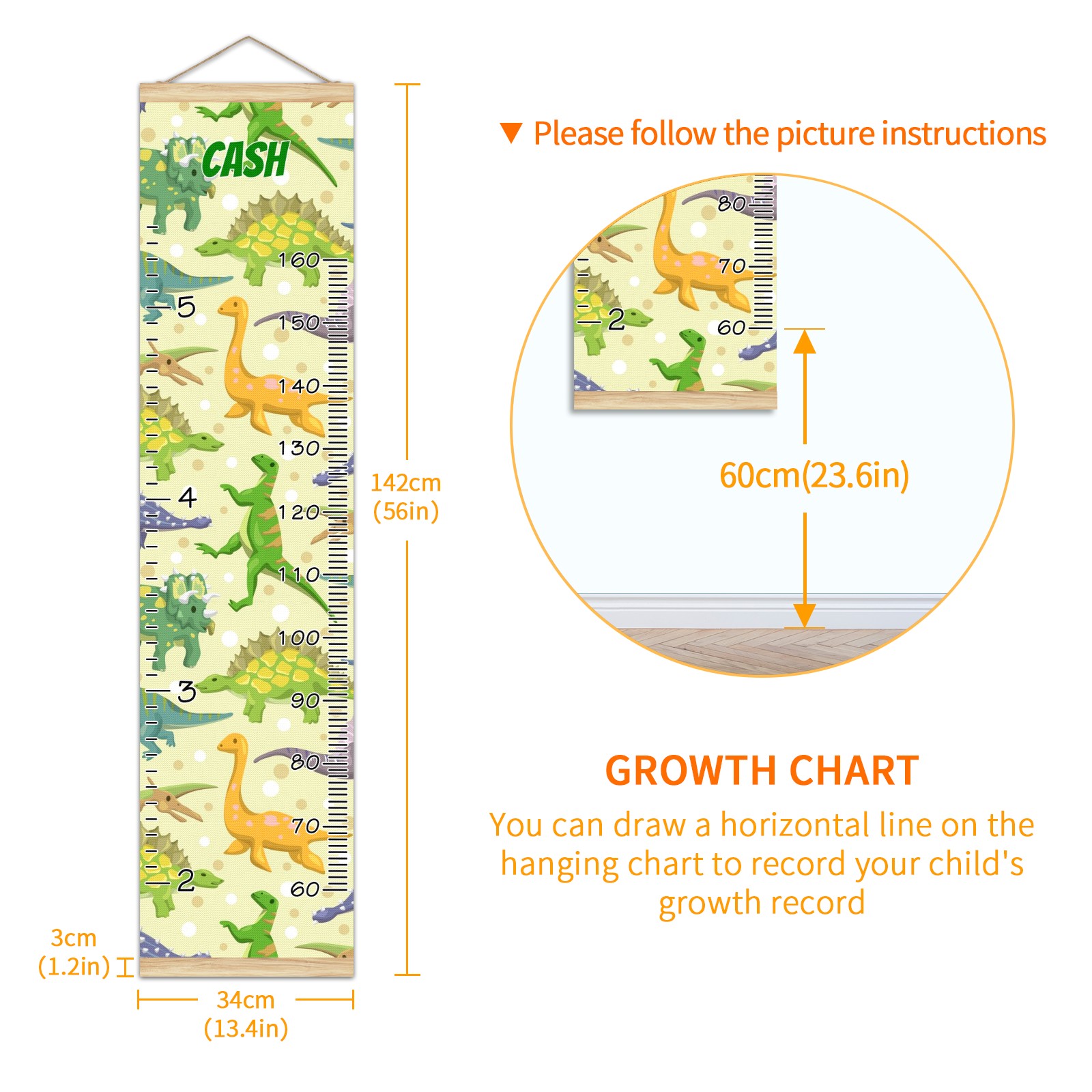 <p><b>Features:</b></p> <p>Rope for Hanging</p> <p>Material: Linen + Wood</p> <p>Dimensions: 13.4x56 inches</p> <p>Package Included: 1 * Baby Growth Chart</p> <p><b>Baby height growth chart can be used anywhere</b></p> <p>Ideal for kids nursery decoration, kids bedroom, interior walls or windows, playroom, living room, homedecoration.Add name and make the growth chart special!</p> <p><b>Easy to fold and carry</b></p> <p>With rope at the top of the growth chart, it is easy to install and remove.You can fold it and unfold any time any where.</p> <p><b>Perfect Gift Idea for Kids</b></p> <p>Environmental and non-toxic for kids use, it must be a perfect gift for baby, kids, girls, and boys.This is a best choice for your friend who have kids or baby as a popular gift.</p> <p><b>Easy to read</b></p> <p>Measurement accrate with 2 scales, Centimeters and feet. The letters are big enough, very easy to read.</p> <p><b>60cm(23.6inch) Over Ground Design</b></p> <p>Not only can protect from dust and other damage, but also will not interfere in floor cleaning.</p>
