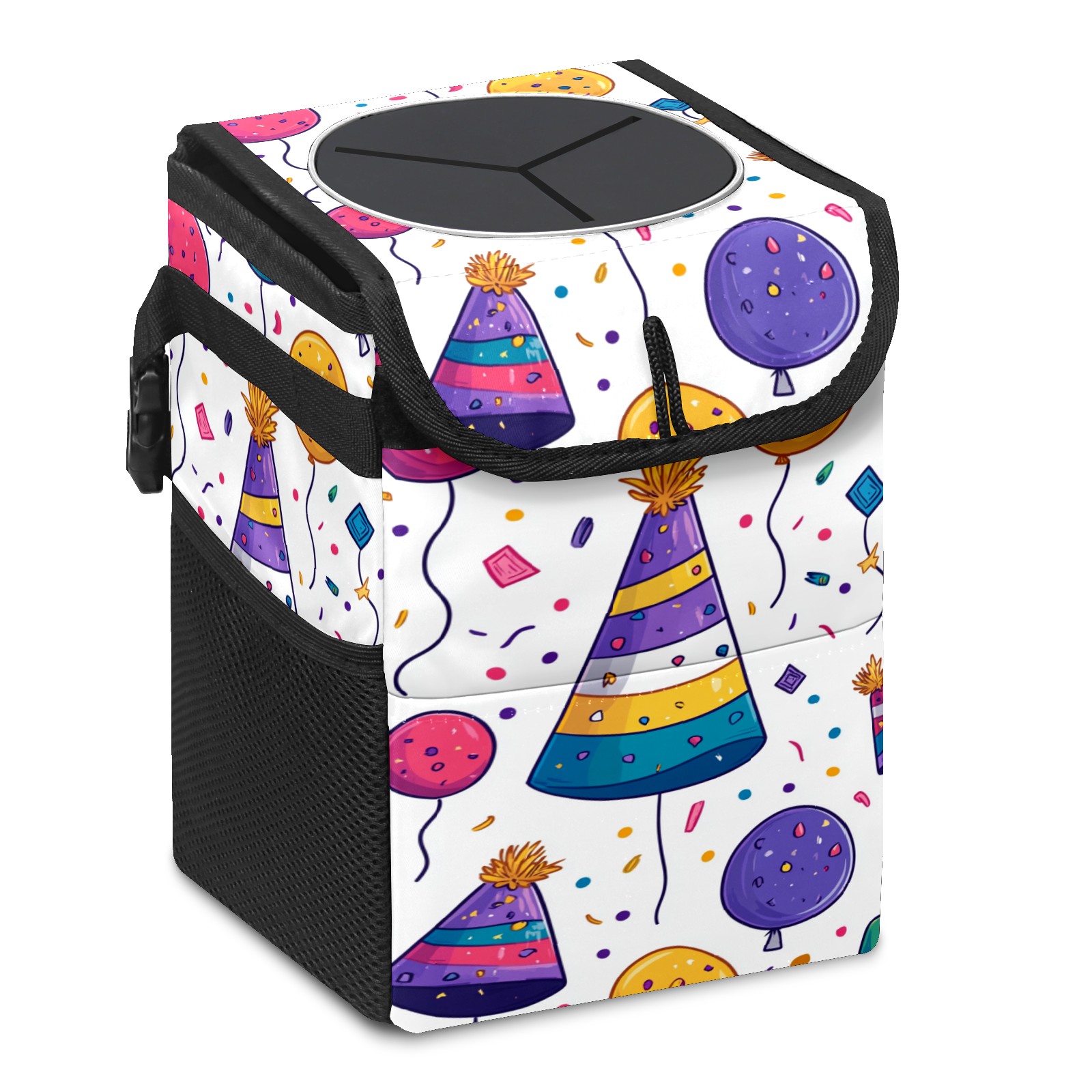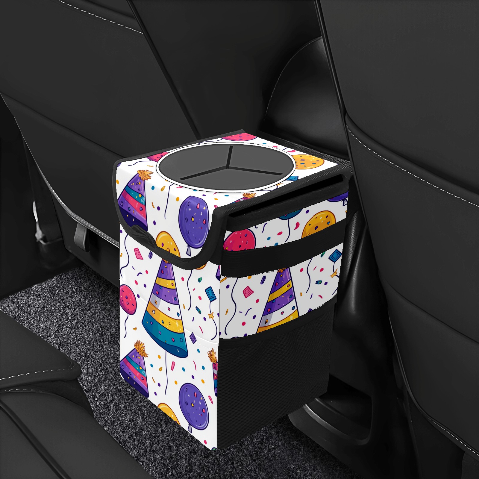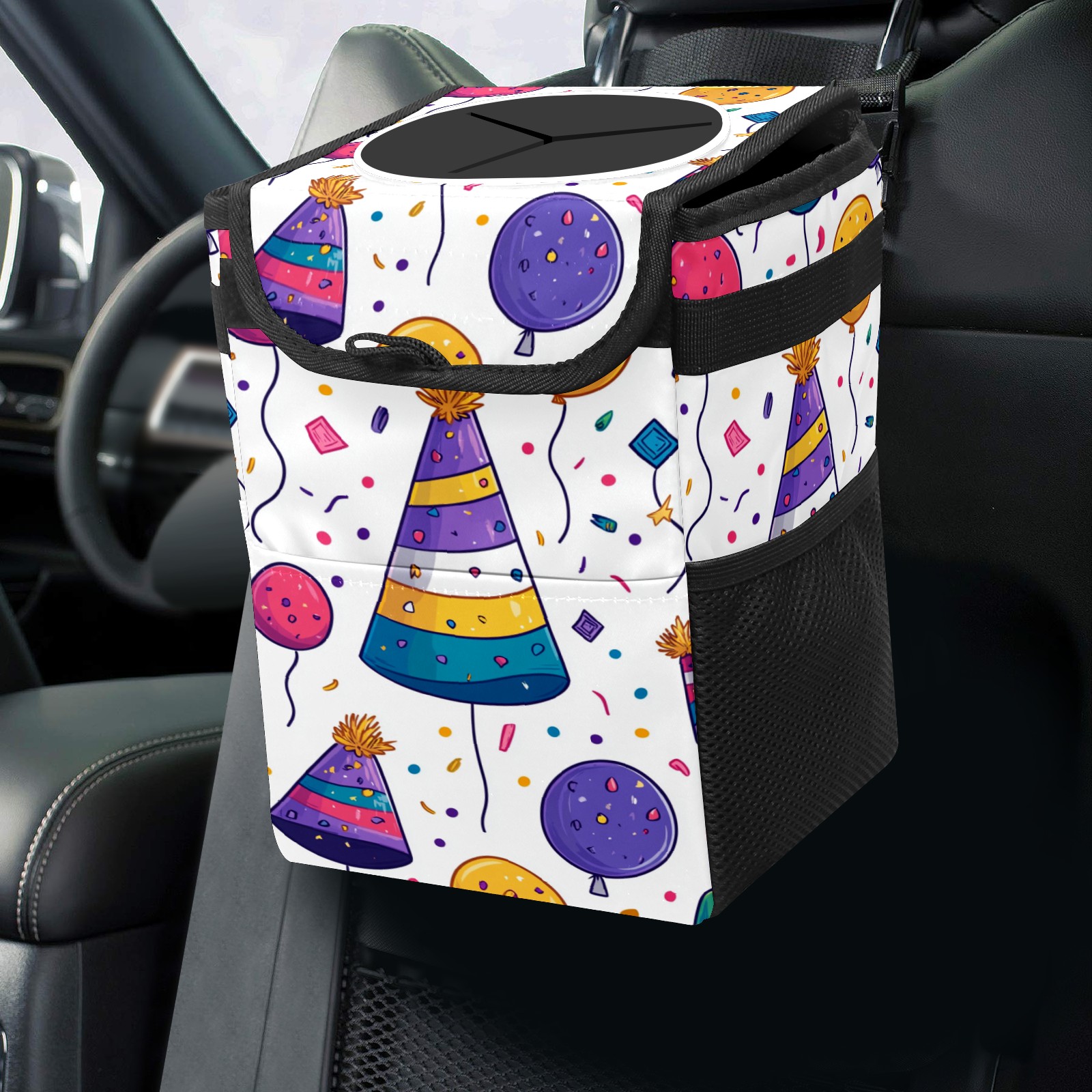 Universal Hanging Car Trash Can - Leakproof Design with Secure Lid | Fits SUV, Truck, Van | Front & Back Seat Friendly | Smart Automotive Accessory Birthday Hat Pattern