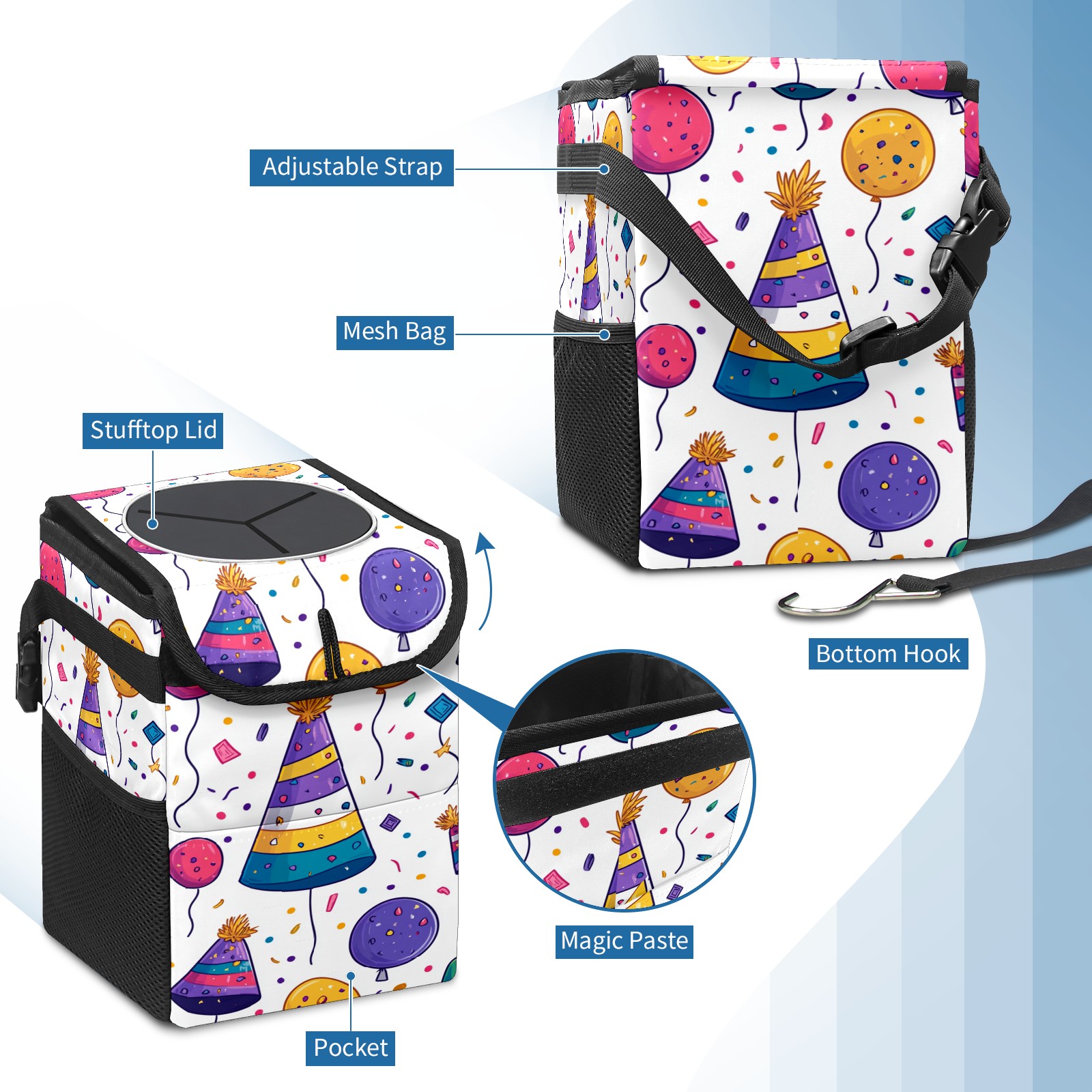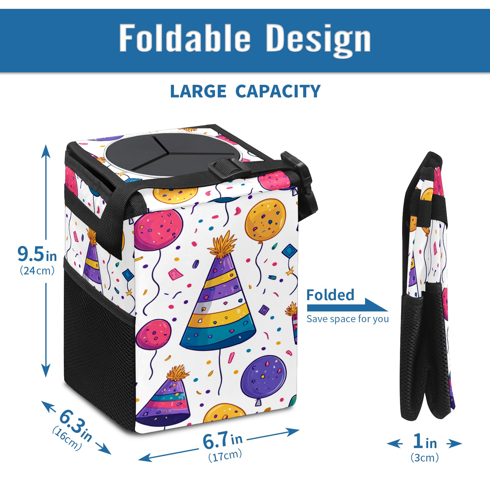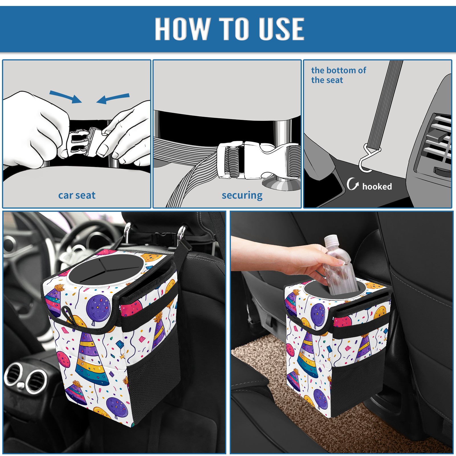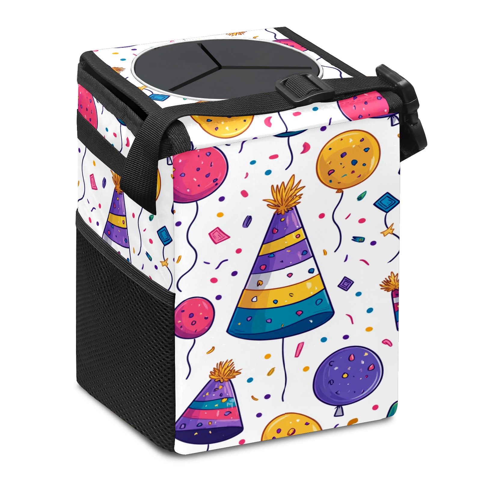 Universal Hanging Car Trash Can - Leakproof Design with Secure Lid | Fits SUV, Truck, Van | Front & Back Seat Friendly | Smart Automotive Accessory Birthday Hat Pattern