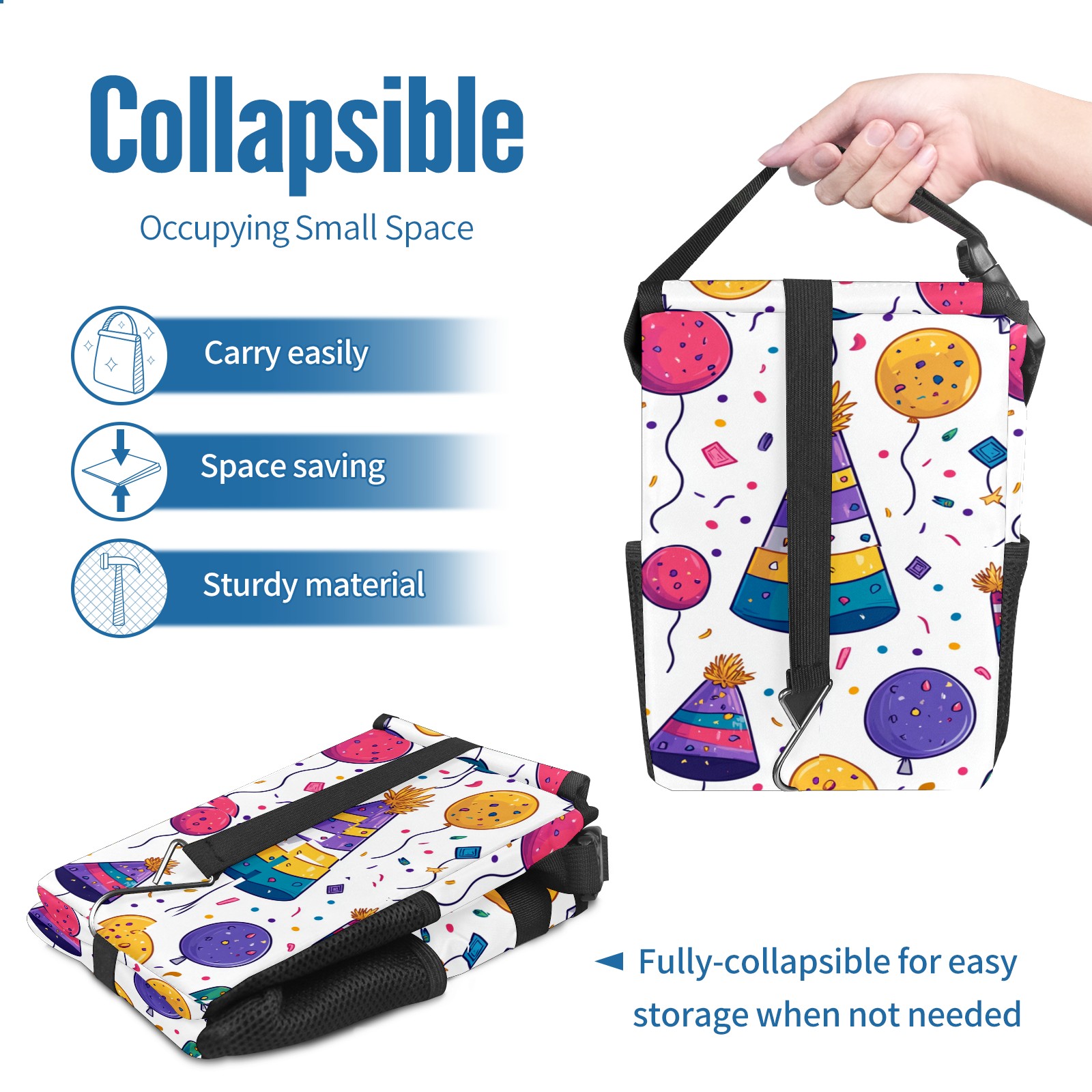• <p>This multi-functional car trash can features a stylish printed design, combining practicality and aesthetics. Made with high-quality twill fabric and woven straps, it's sturdy and durable. Dimensions: 24×17×16cm (9.5×6.7×6.3 inches). The top rubber opening lid makes disposing of trash easy, while side mesh pockets and a front pocket easily store snacks, mobile phones, and other small items. Equipped with a dual securing system of straps and elastic hooks, it can be flexibly hung behind headrests, inside armrest boxes, or hooked to the bottom of seat cushions. Not only can it be used as a trash can, but it can also function as a food or miscellaneous item storage box, achieving multiple uses. When not in use, it can be folded for storage, saving space and creating a clean and tidy environment for your car.<br></p>