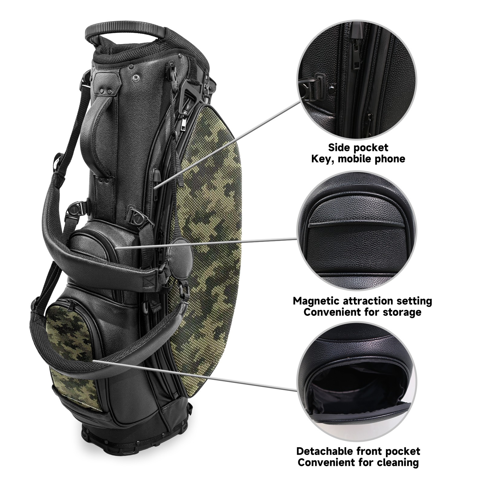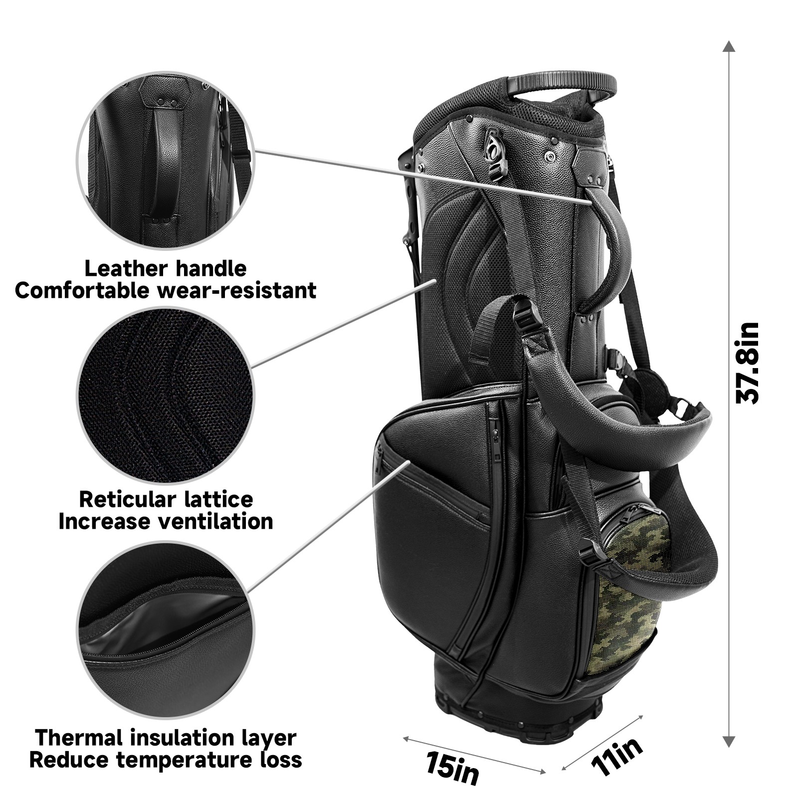 • <p>The Golf Stand Bag, designed specifically for golf enthusiasts, offers a choice of 5 - way and 14 - way top dividers. Its 5/14 - compartment design with independent full - size club compartments safeguards clubs from collisions. Equipped with a rain cover, waterproof zippered pockets (tested to resist moderate to heavy rain), and a high - performance cooler pouch that can keep drinks cold for hours, it ensures a convenient golfing experience. The bag features thickened, breathable neoprene shoulder straps and an adjustable chest buckle, reducing shoulder fatigue by 35% compared to regular bags, and its automatic aluminum alloy stand provides stable support on various terrains. Crafted from top - tier, water - resistant litchi - grain PU leather, with double - stitched edges, reliable zippers tested for over 15,000 cycles, and anti - abrasion bottom studs, it guarantees durability. You can personalize it with embroidery on the front pocket and rain cover side (15*15cm area), and it comes in classic black and white, with a matte finish and litchi - grain texture that combines business and leisure styles. Measuring 130 cm in height, 37 cm in width, and 31 cm in depth (including rain cover) and 90 cm x 31 cm x 37 cm (excluding rain cover), it strikes a balance between storage and portability, capable of holding 14 standard - sized clubs and other essentials, and it also includes a dust cover. It's truly the perfect choice for golfers.<br></p>