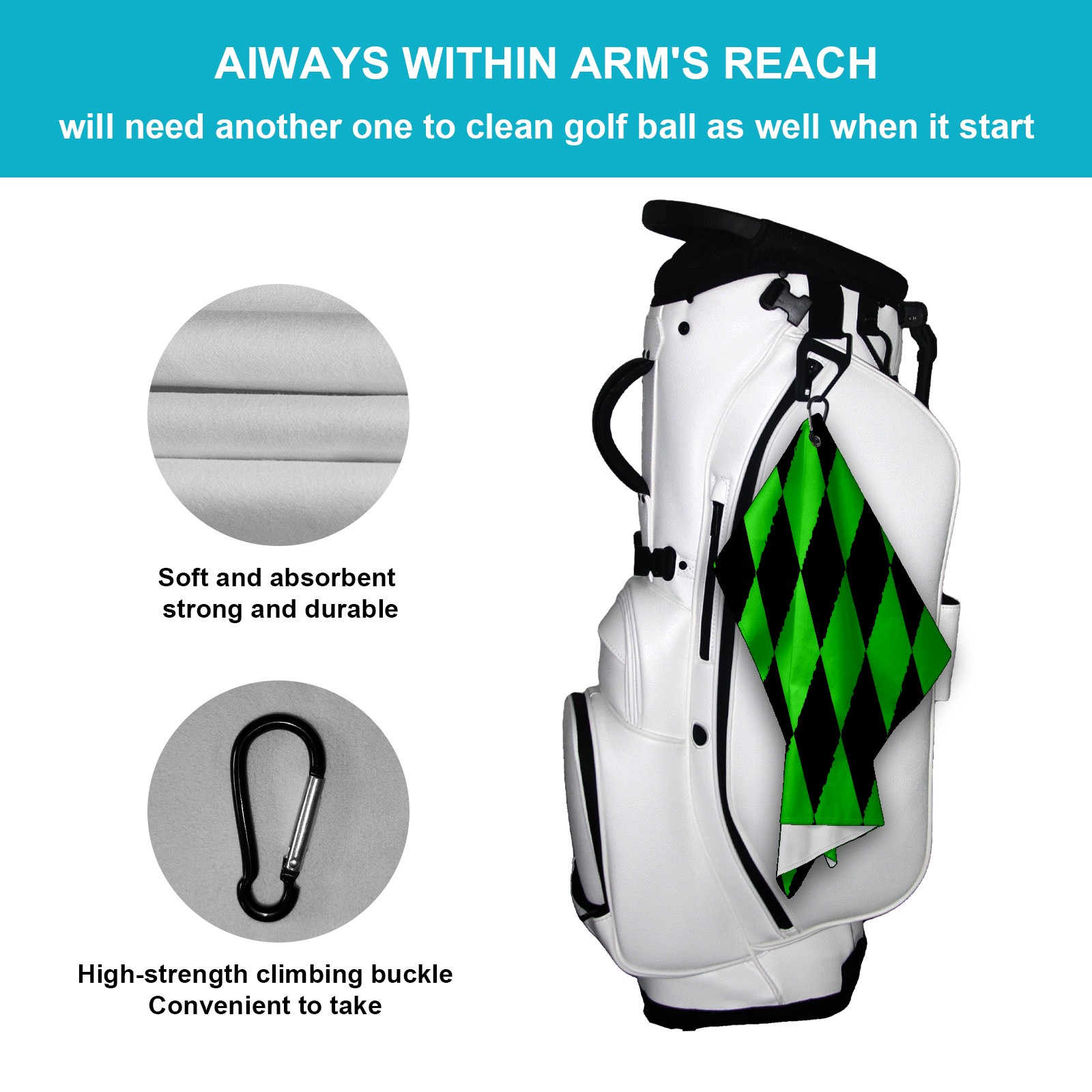 <p>Elevate your golfing experience with our premium 40cm x 60cm (15.7inx23.6in) Golf Towel! Designed to deliver ample coverage for cleaning clubs and balls, yet remains compact enough to slide effortlessly into your golf bag without taking up excess space.Crafted from high - quality polyester, this towel boasts exceptional absorbency to tackle wetness in a flash, and rapid dryness to avoid lingering dampness or unpleasant odors. Whether you’re wiping down clubs after a muddy shot or drying golf balls on the green, it performs flawlessly.The built - in multi - functional carabiner clip is a game - changer! Attach it to your golf bag, belt loop, or cart with ease, ensuring quick access whenever you need to tidy up. Lightweight, durable, and designed for on - course convenience, it’s the must - have accessory for serious golfers.Upgrade your golf gear today – keep your equipment clean, dry, and always within reach!</p>