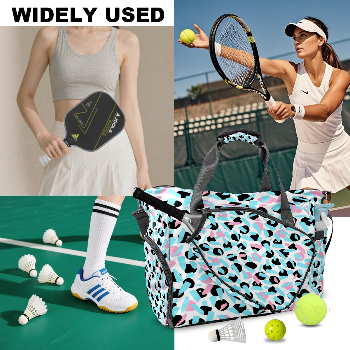 <p>This pickleball bag measures 8.7in x 18.9in x 13.8in and features a practical and versatile design. It includes dedicated racket/gear pockets, a ventilated shoe compartment (fits size 10 sneakers), and a waterproof wet bag to separate items and isolate odors. A fence hook allows you to hang the bag off the ground for easy access. It can be carried by hand or crossbody, making it suitable for both men and women. It's perfect for not only pickleball, but also badminton, squash, fitness, and short trips. It combines fashion and functionality, making it a perfect gift for birthdays, Mother's Day, and other occasions.</p>