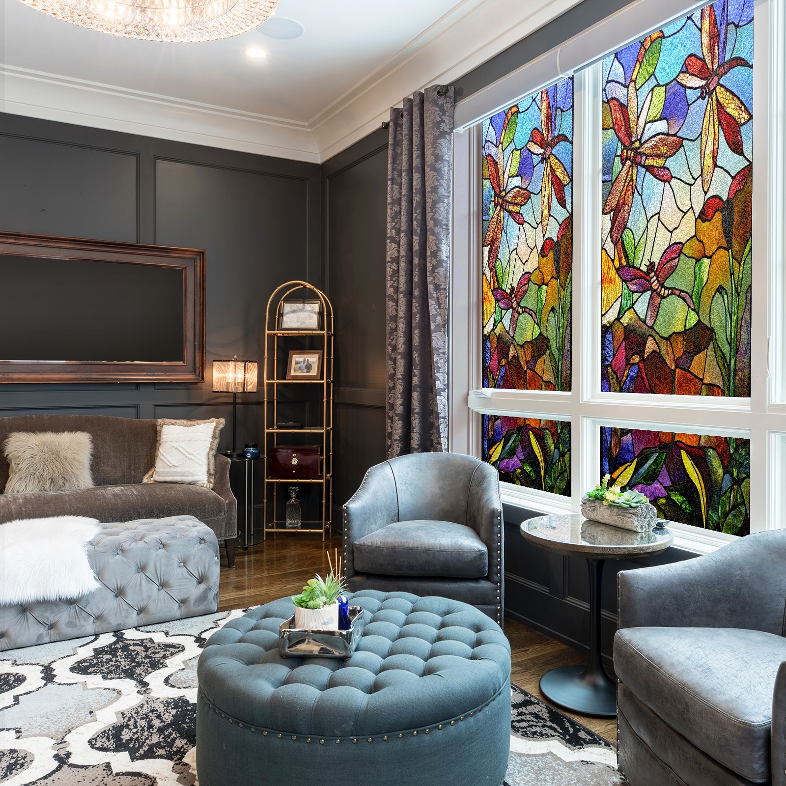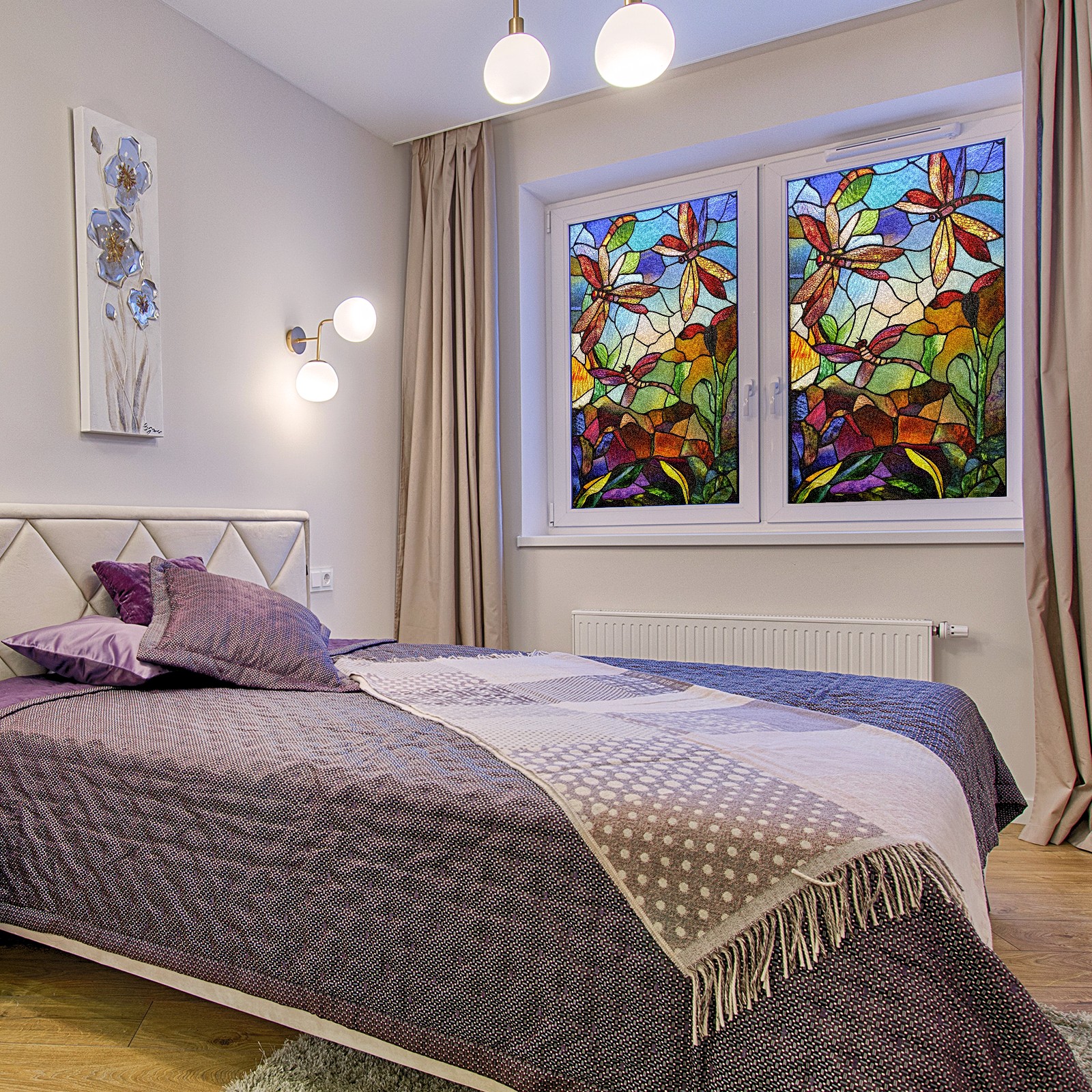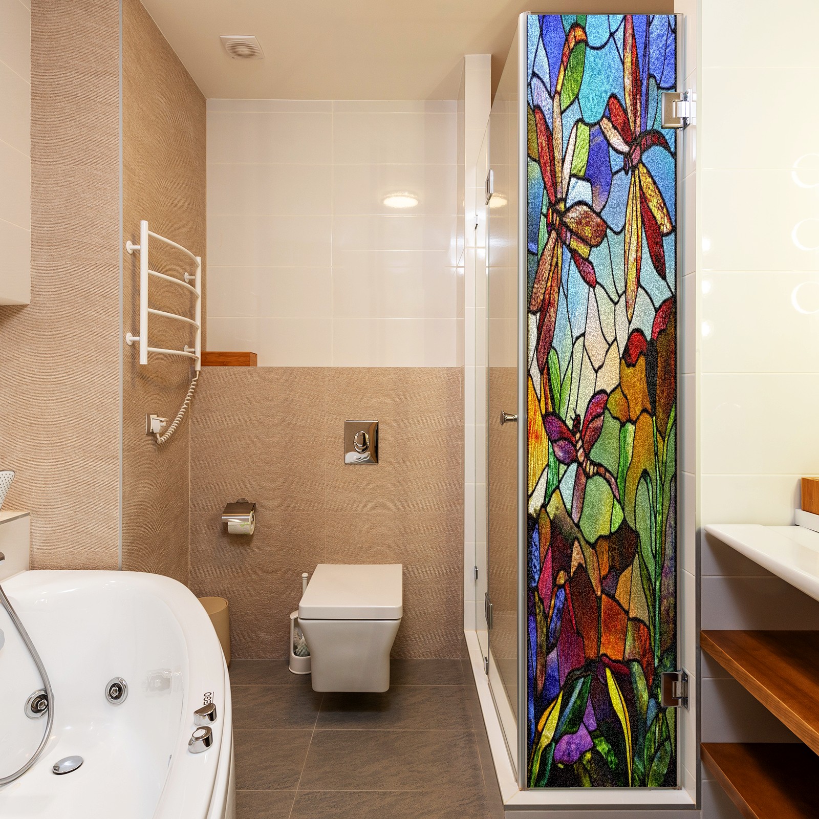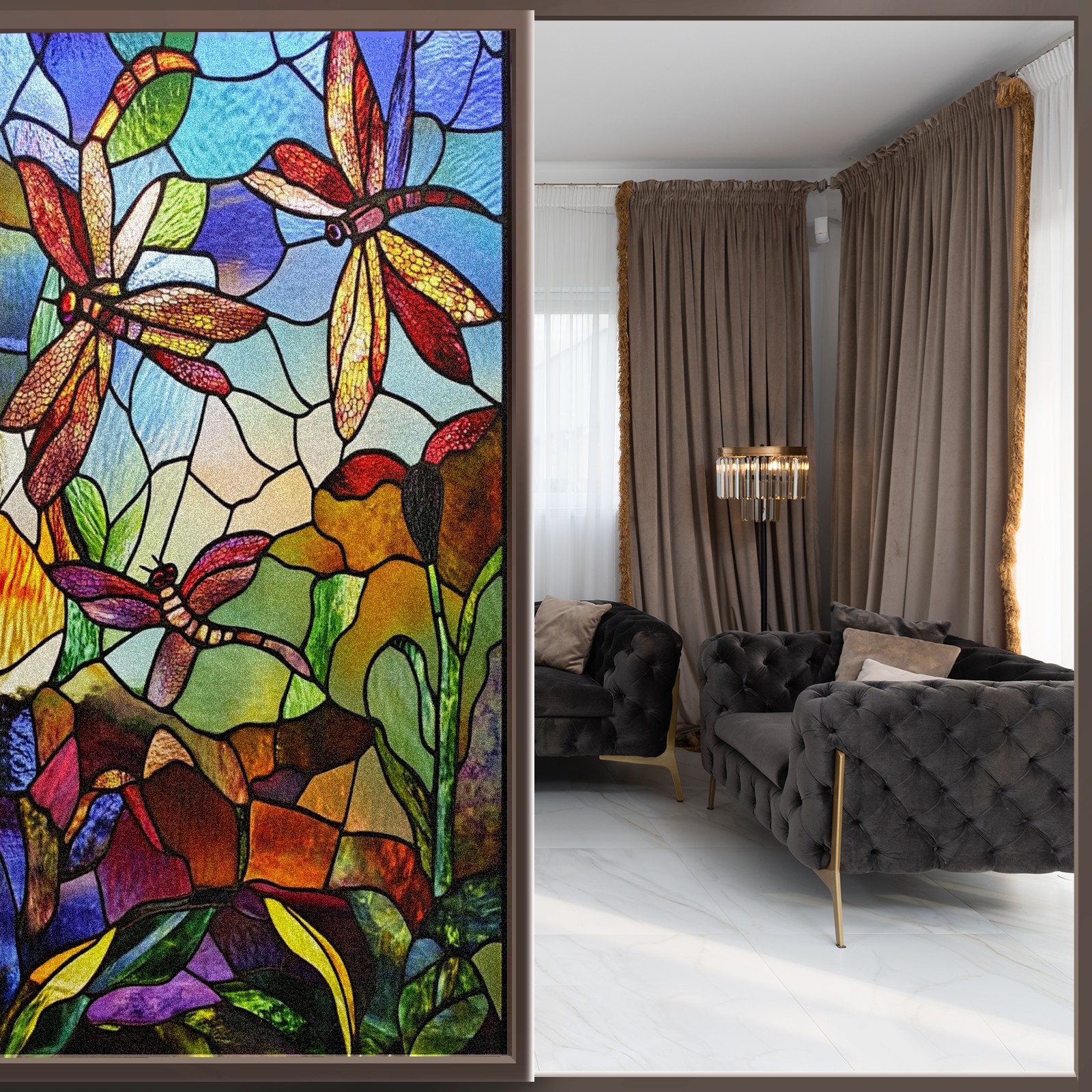 Window Privacy Film Frosted Stained Glass Film Decorative Static Cling for Bathroom Home Office Peel and Stick Window Film Vintage Colorful Dragonfly(17.7x23.6in)