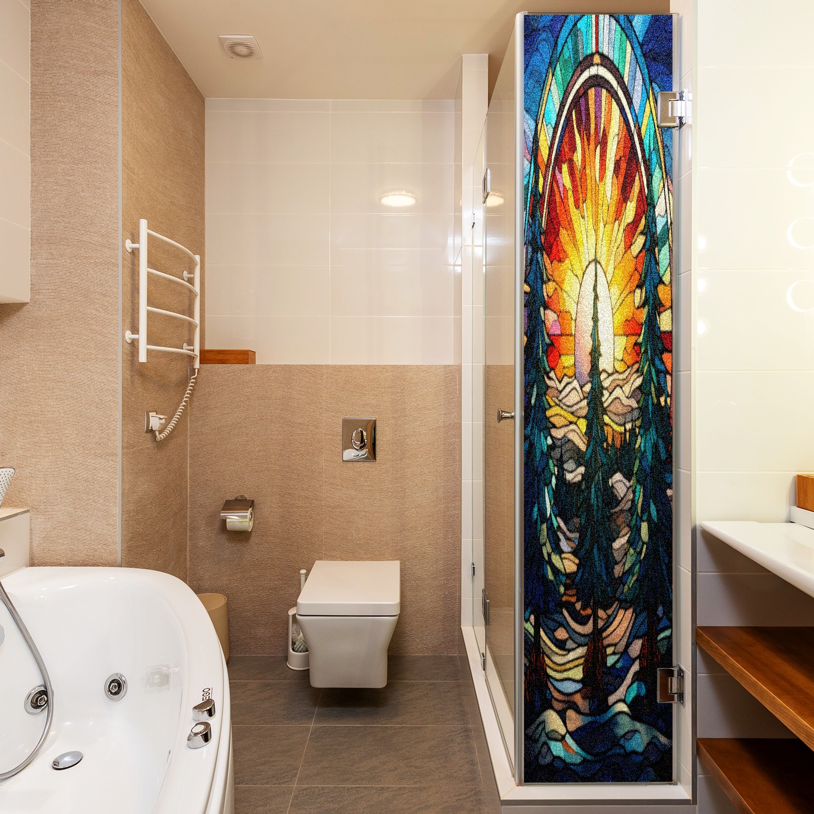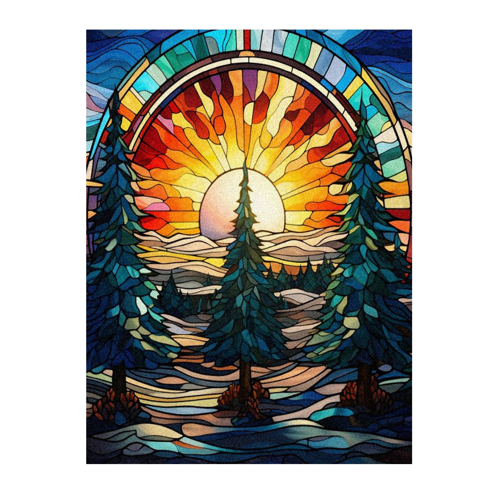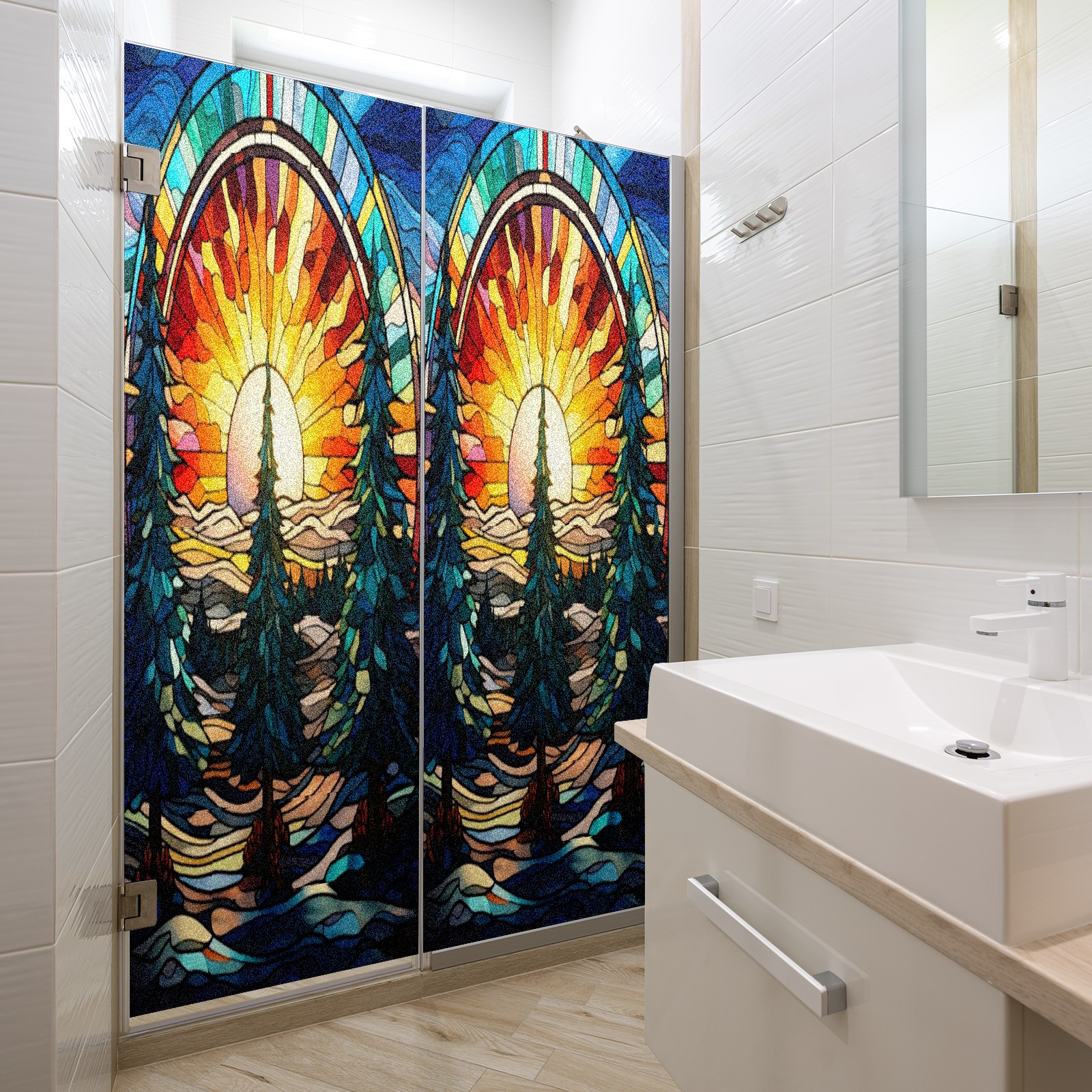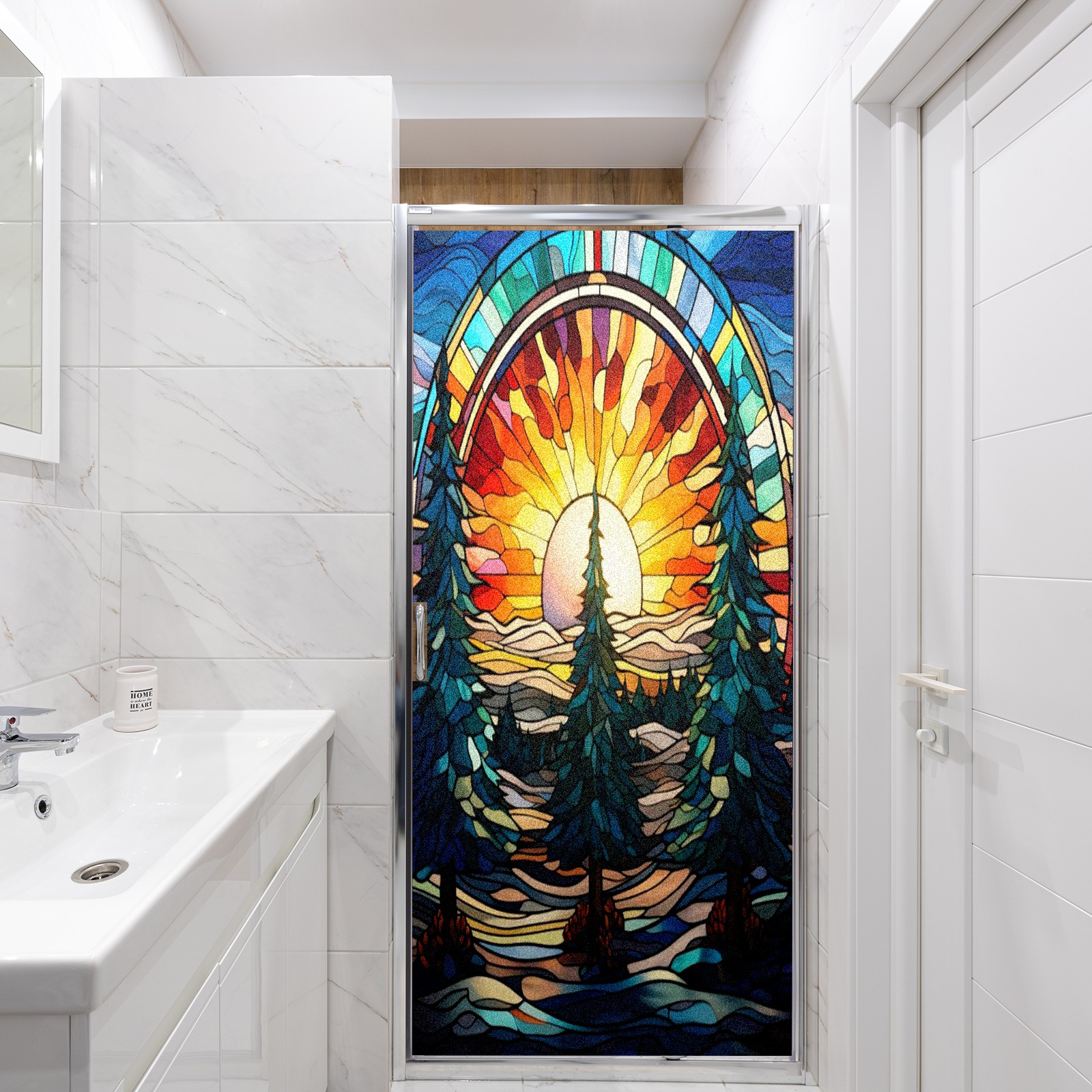 Window Privacy Film Frosted Stained Glass Film Decorative Static Cling for Bathroom Home Office Peel and Stick Window Film Sunset Forest Trees(17.7x23.6in)