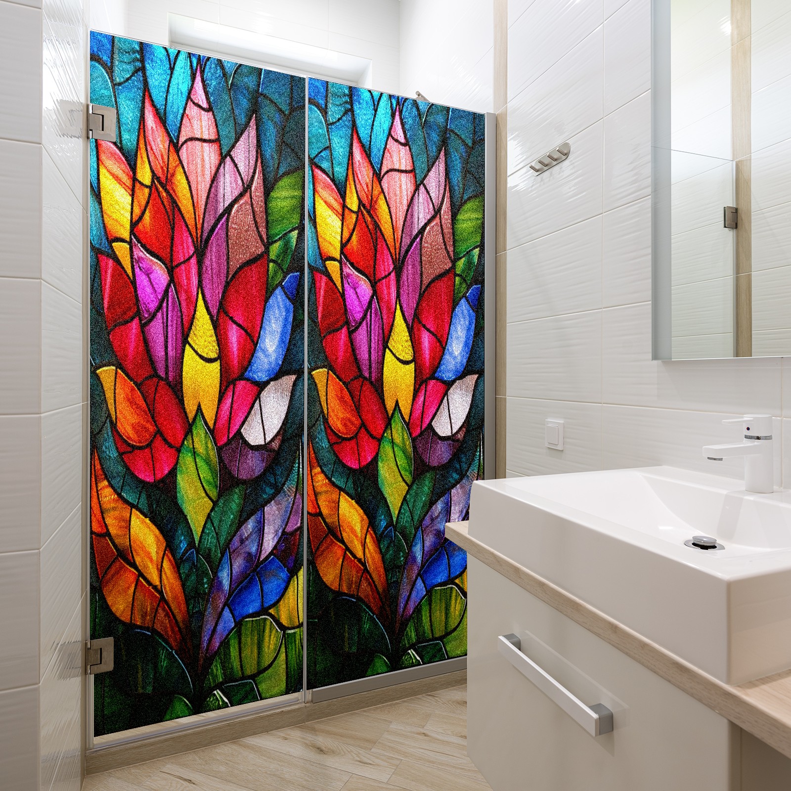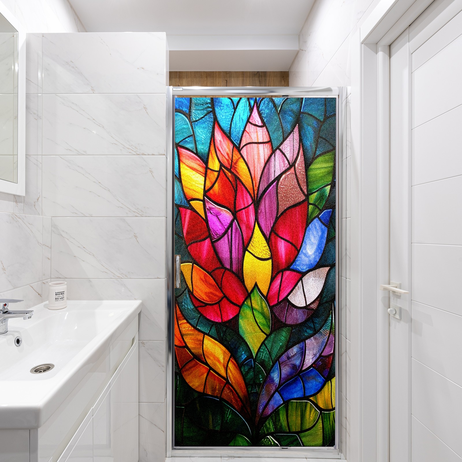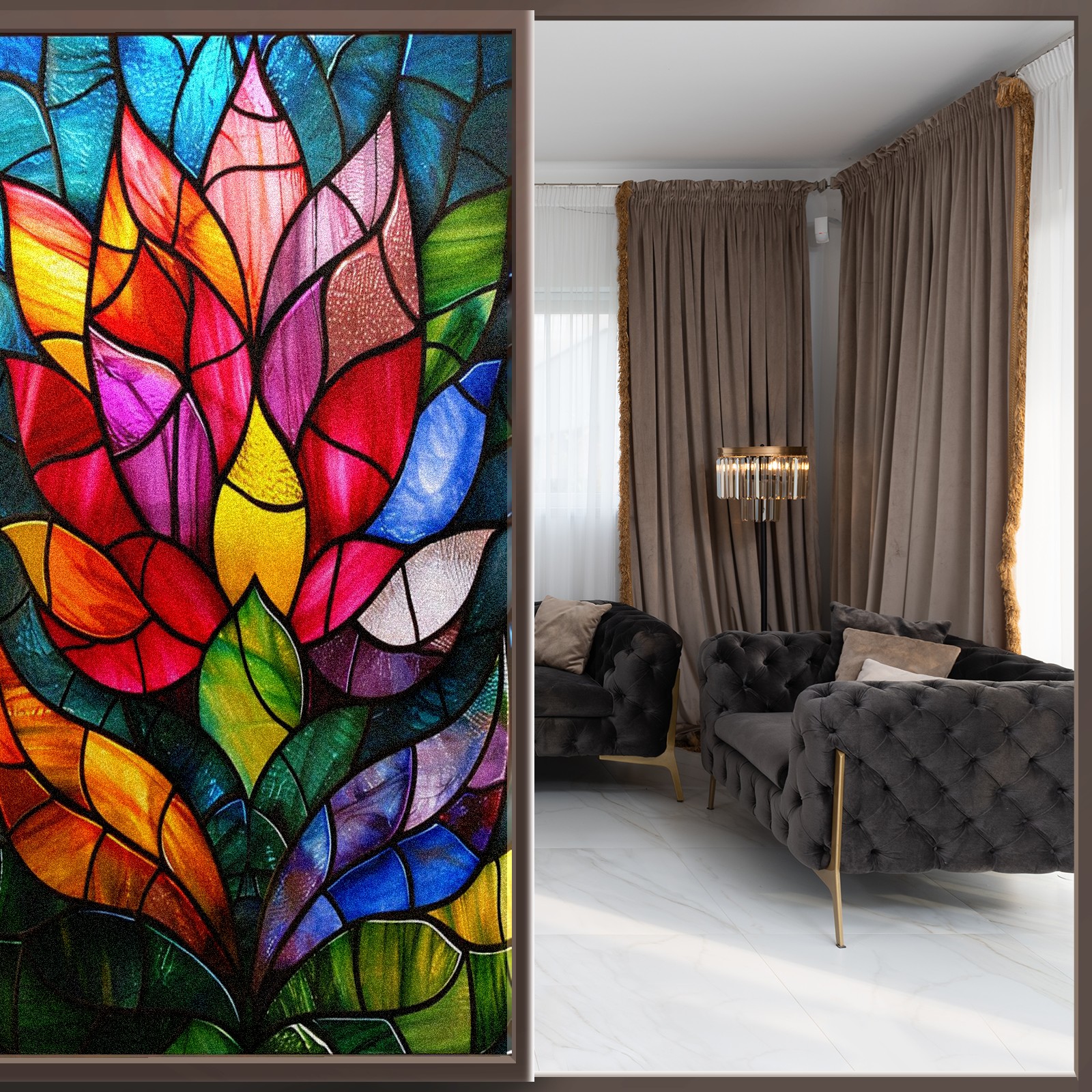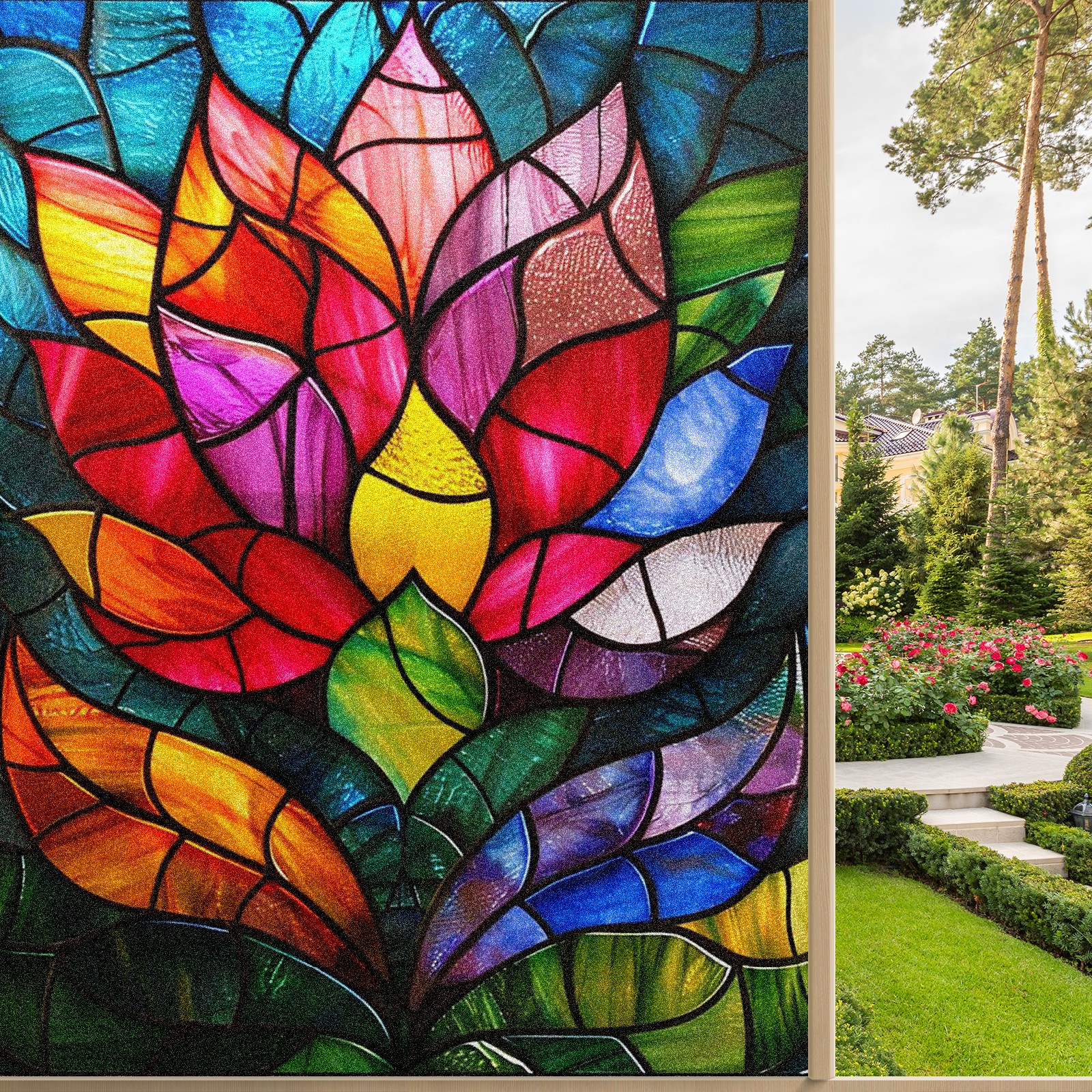 Window Privacy Film Frosted Stained Glass Film Decorative Static Cling for Bathroom Home Office Peel and Stick Window Film Colorful Lotus Flowers(17.7x23.6in)