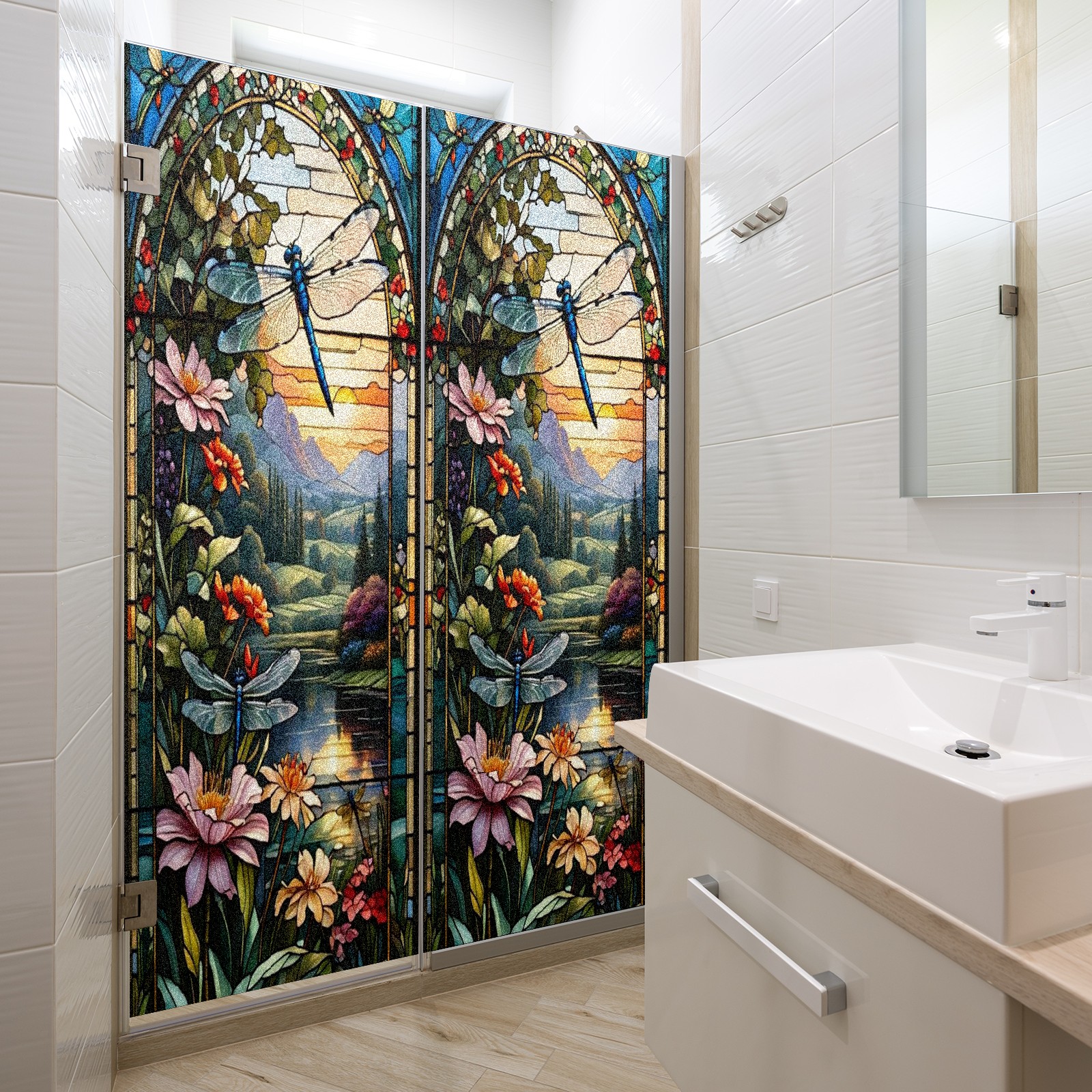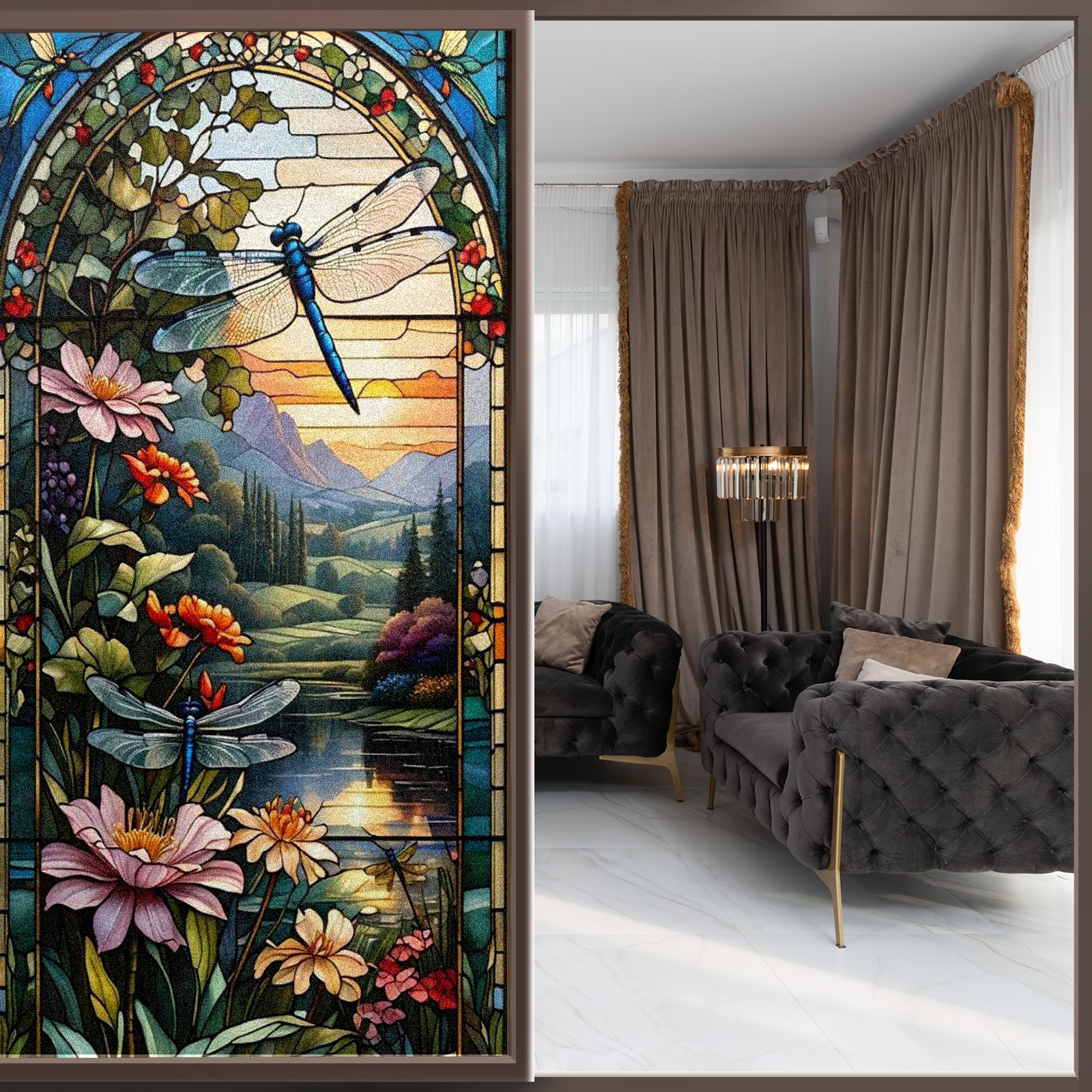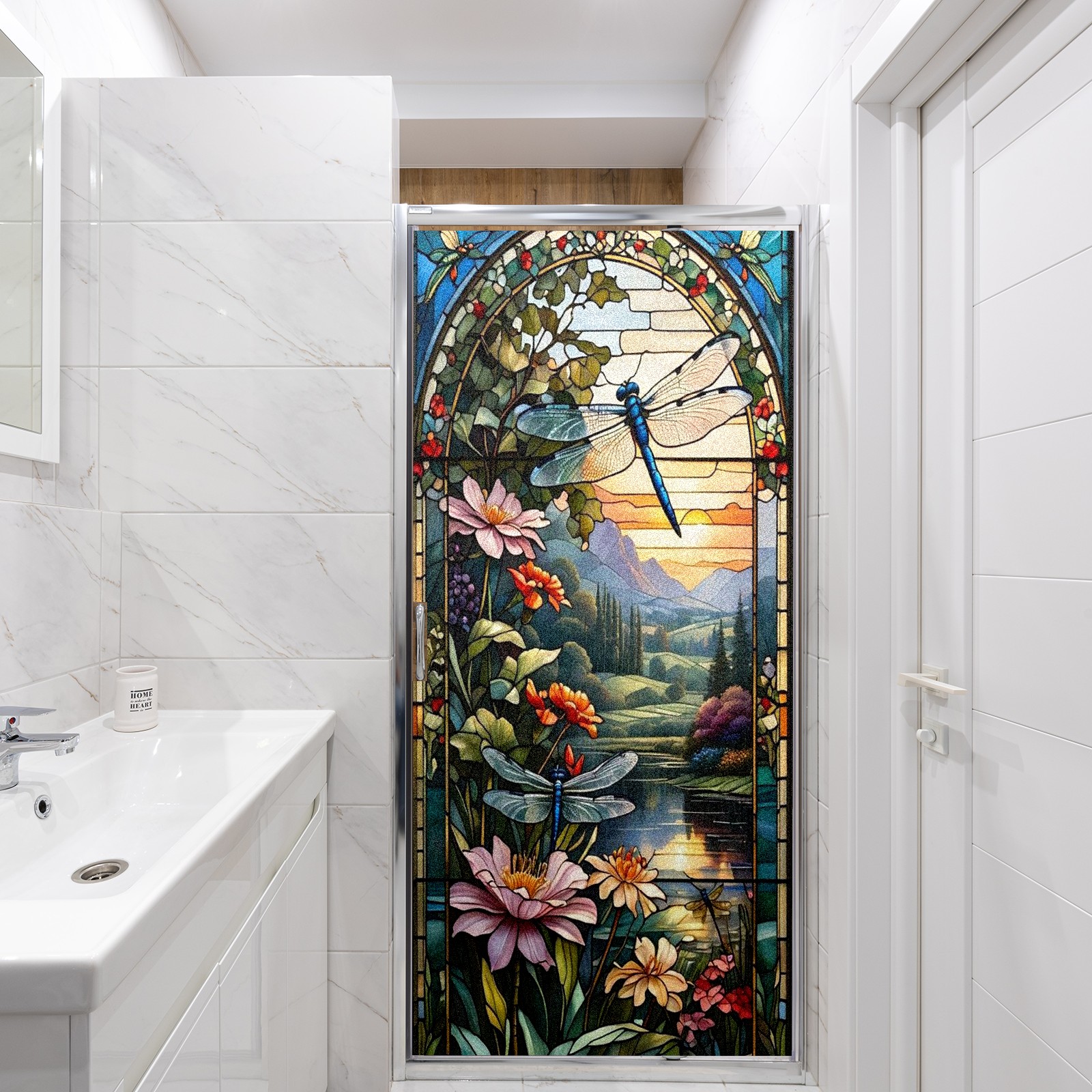 Window Privacy Film Frosted Stained Glass Film Decorative Static Cling for Bathroom Home Office Peel and Stick Window Film Colorful Flowers Dragonfies(17.7x23.6in)