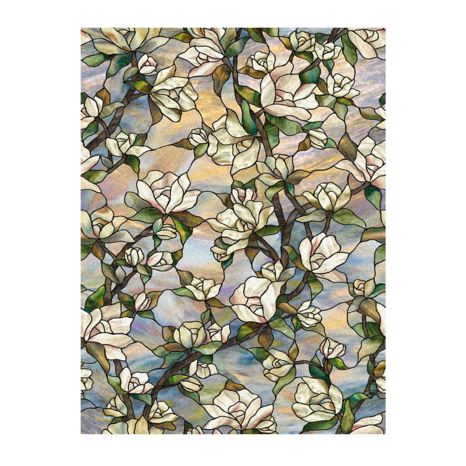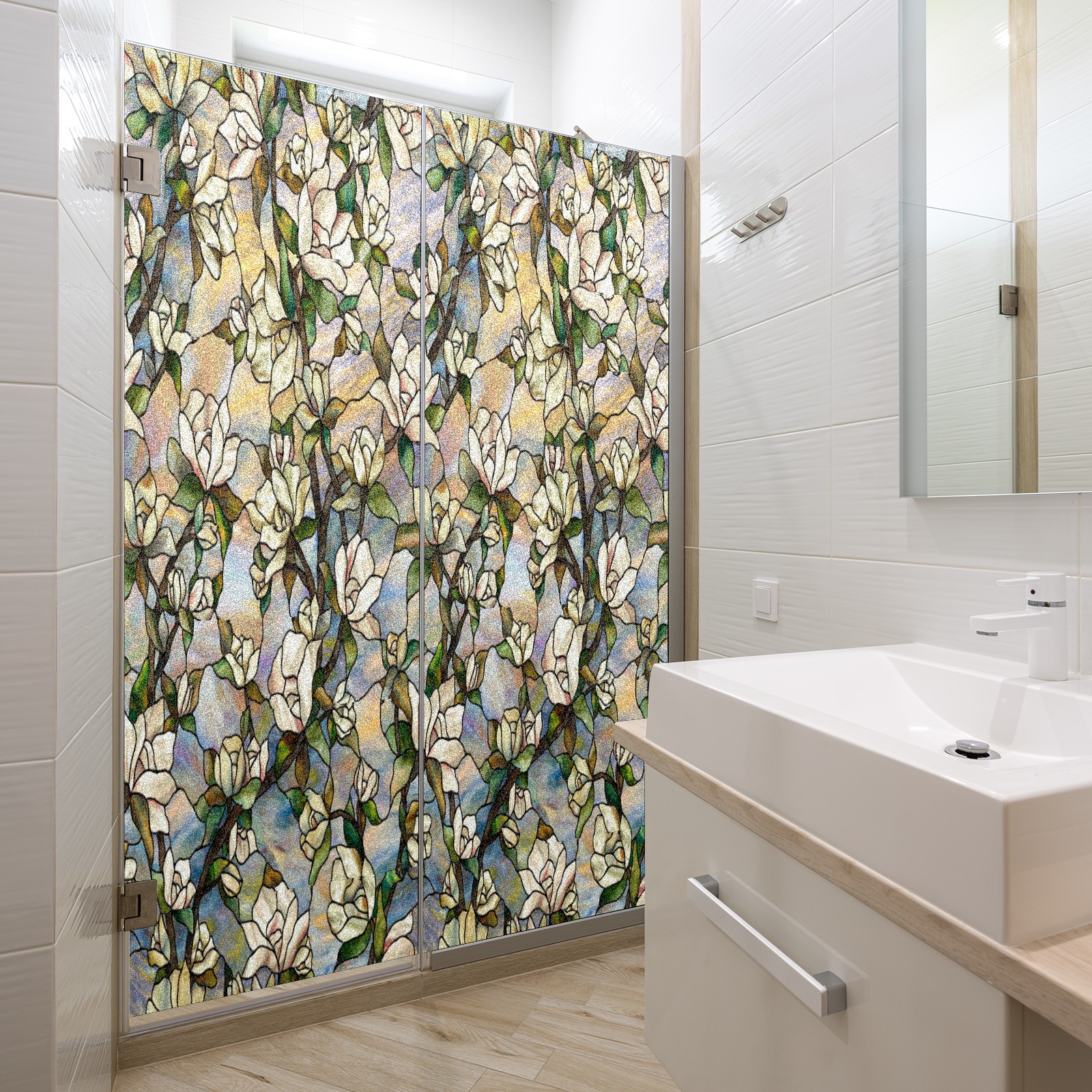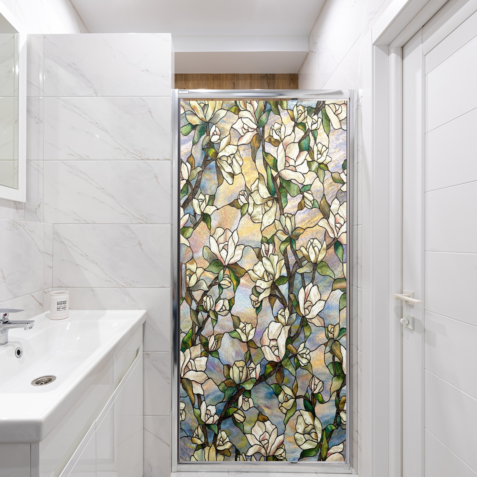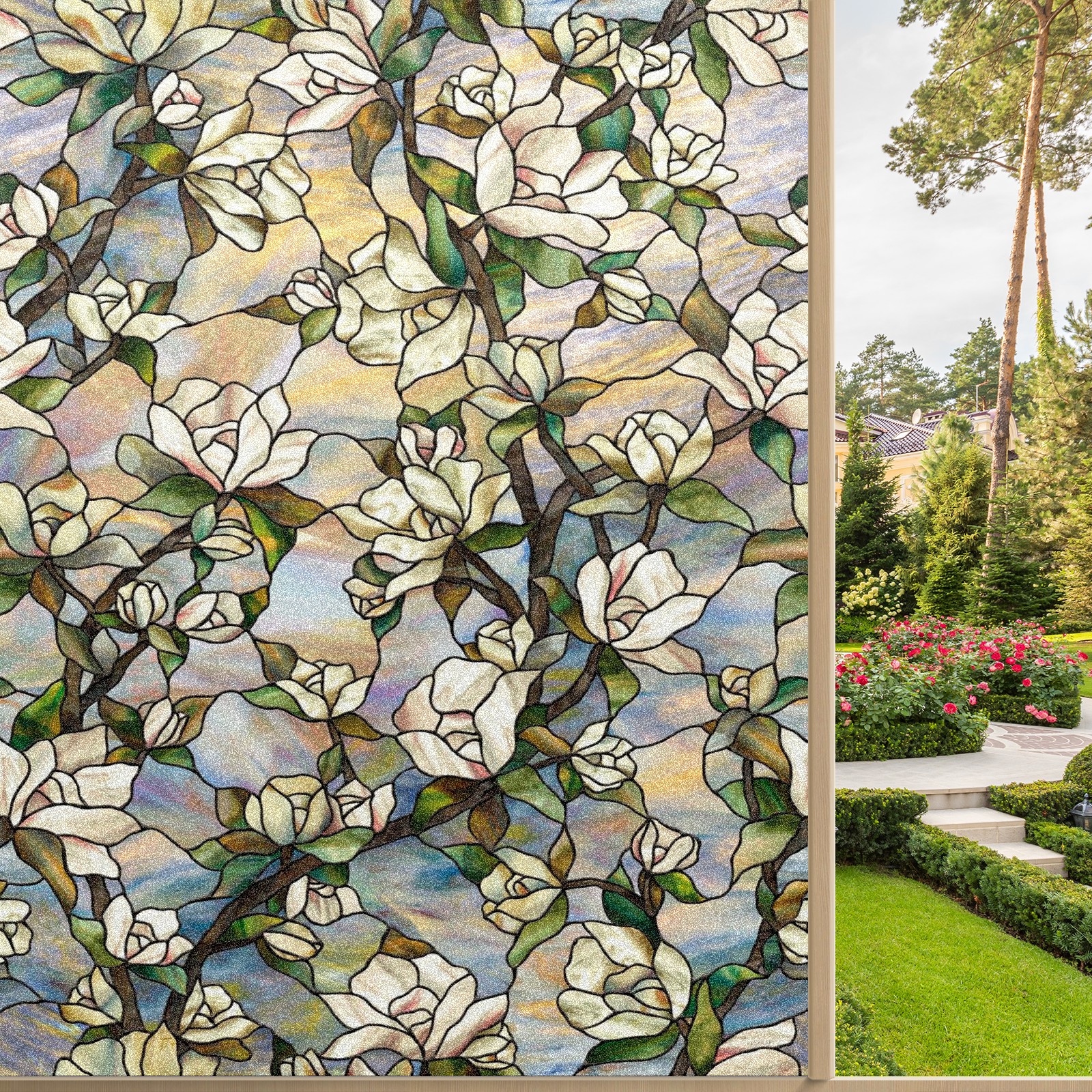 Window Privacy Film Frosted Stained Glass Film Decorative Static Cling for Bathroom Home Office Peel and Stick Window Film Vintage White Floral Print(17.7x23.6in)