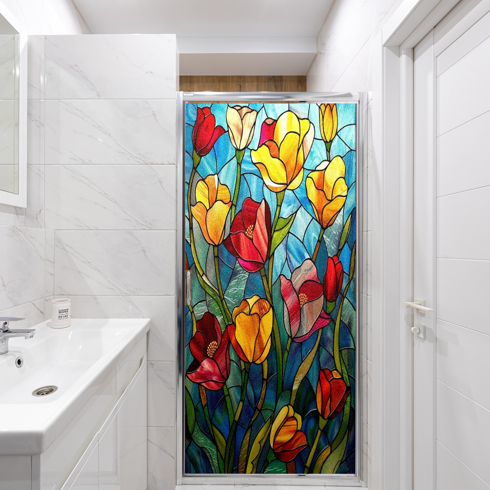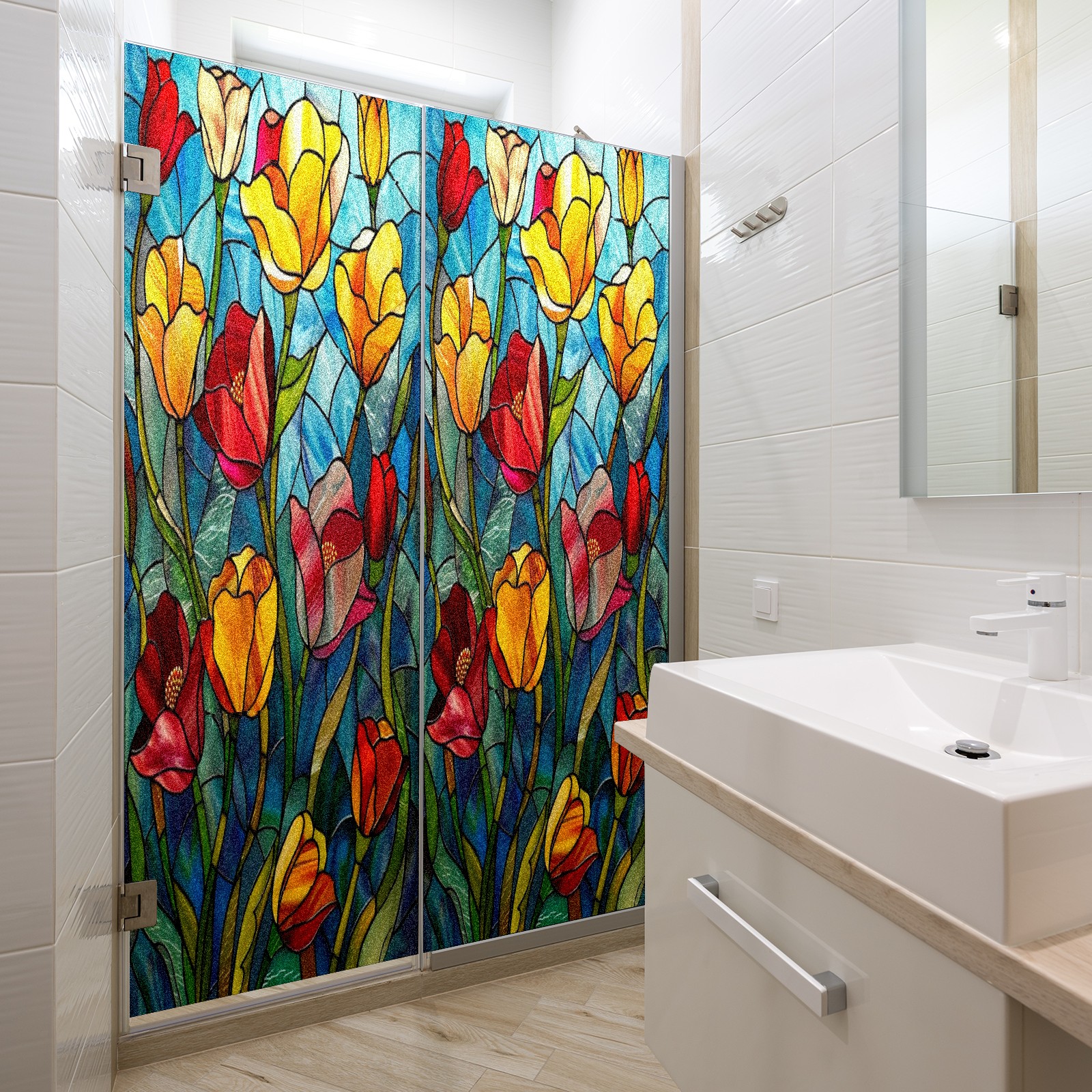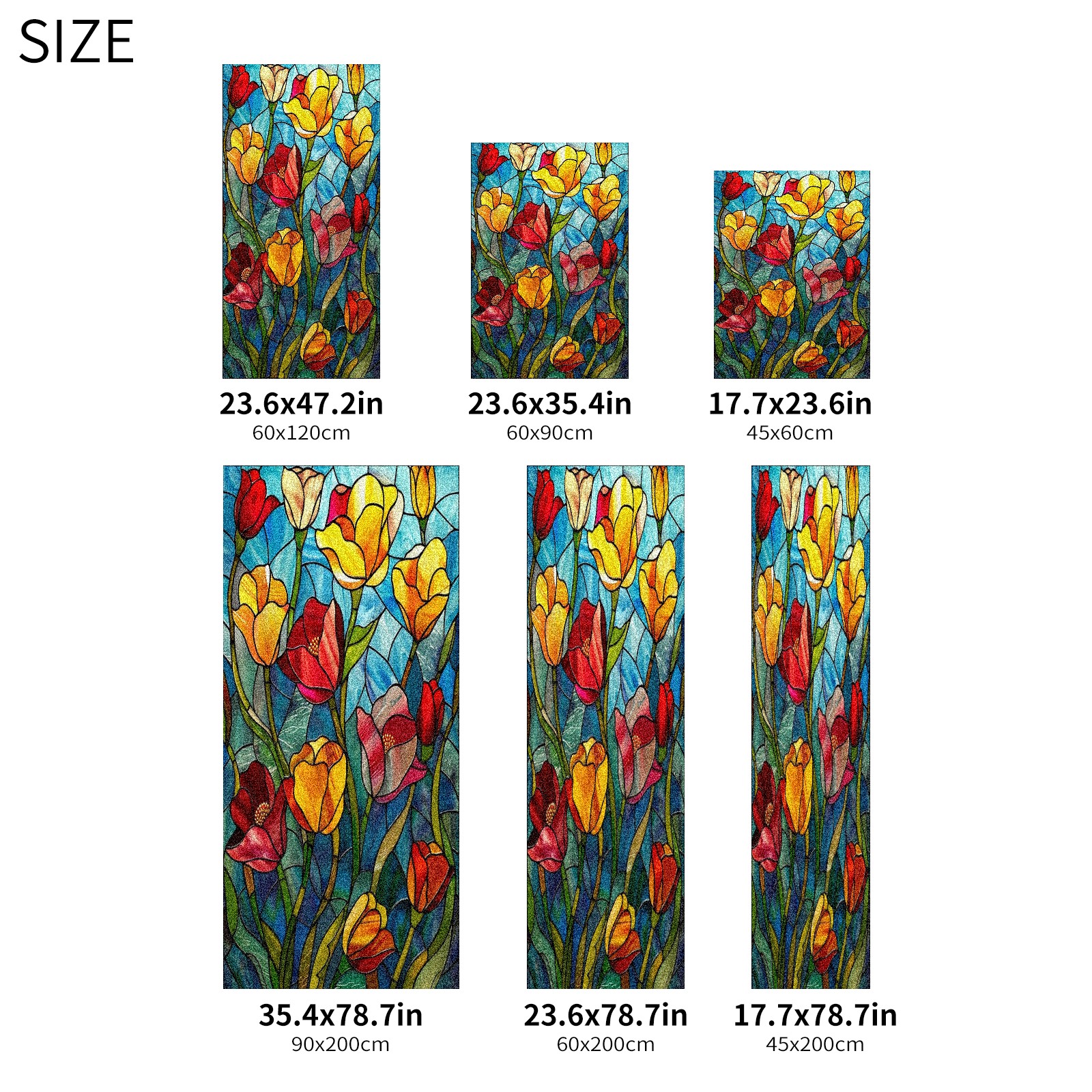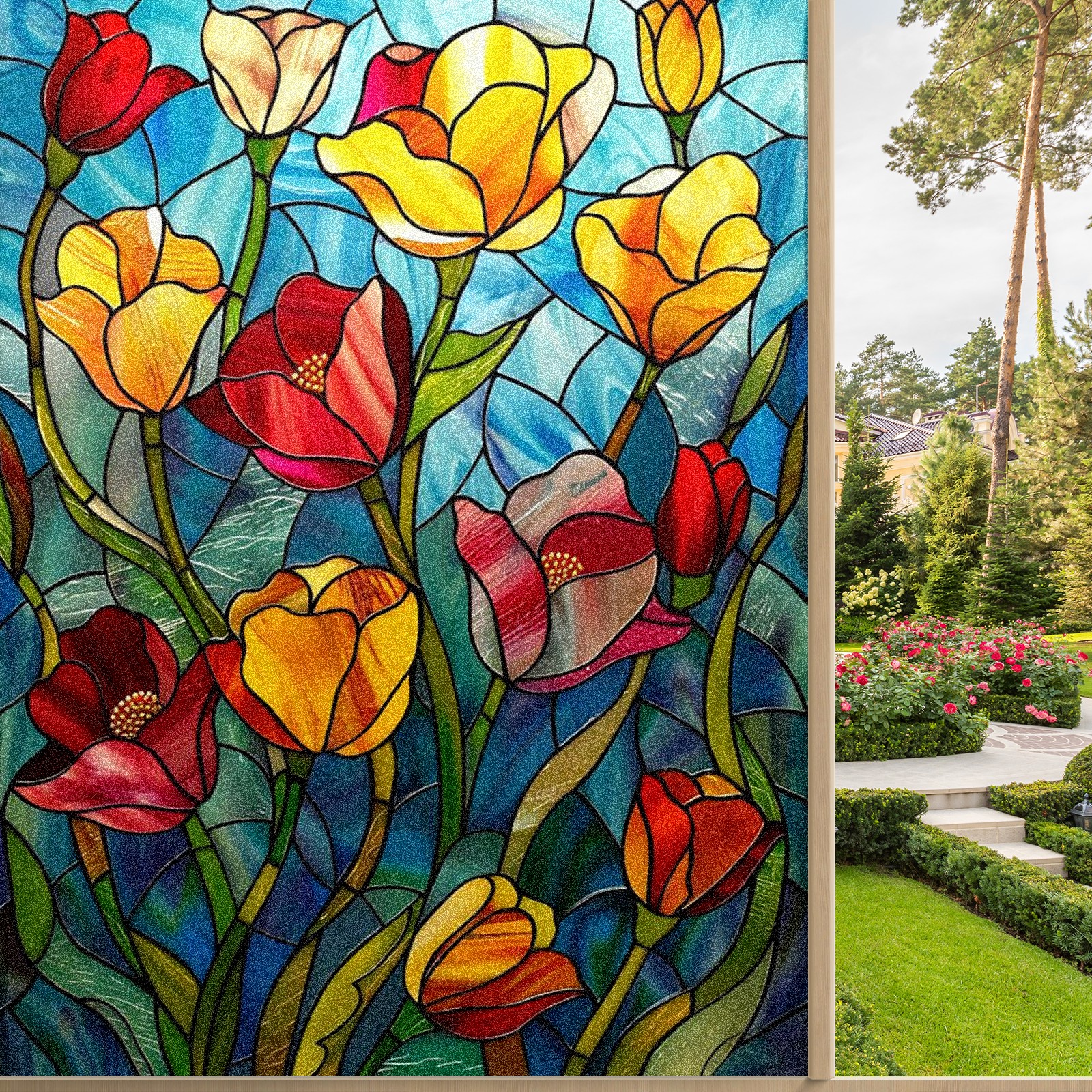 Window Privacy Film Frosted Stained Glass Film Decorative Static Cling for Bathroom Home Office Peel and Stick Window Film Colorful Tulips Flower(17.7x23.6in)