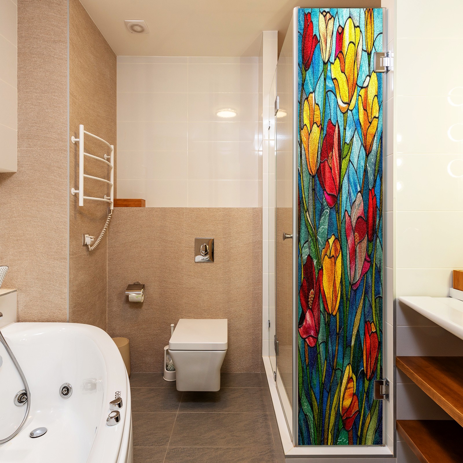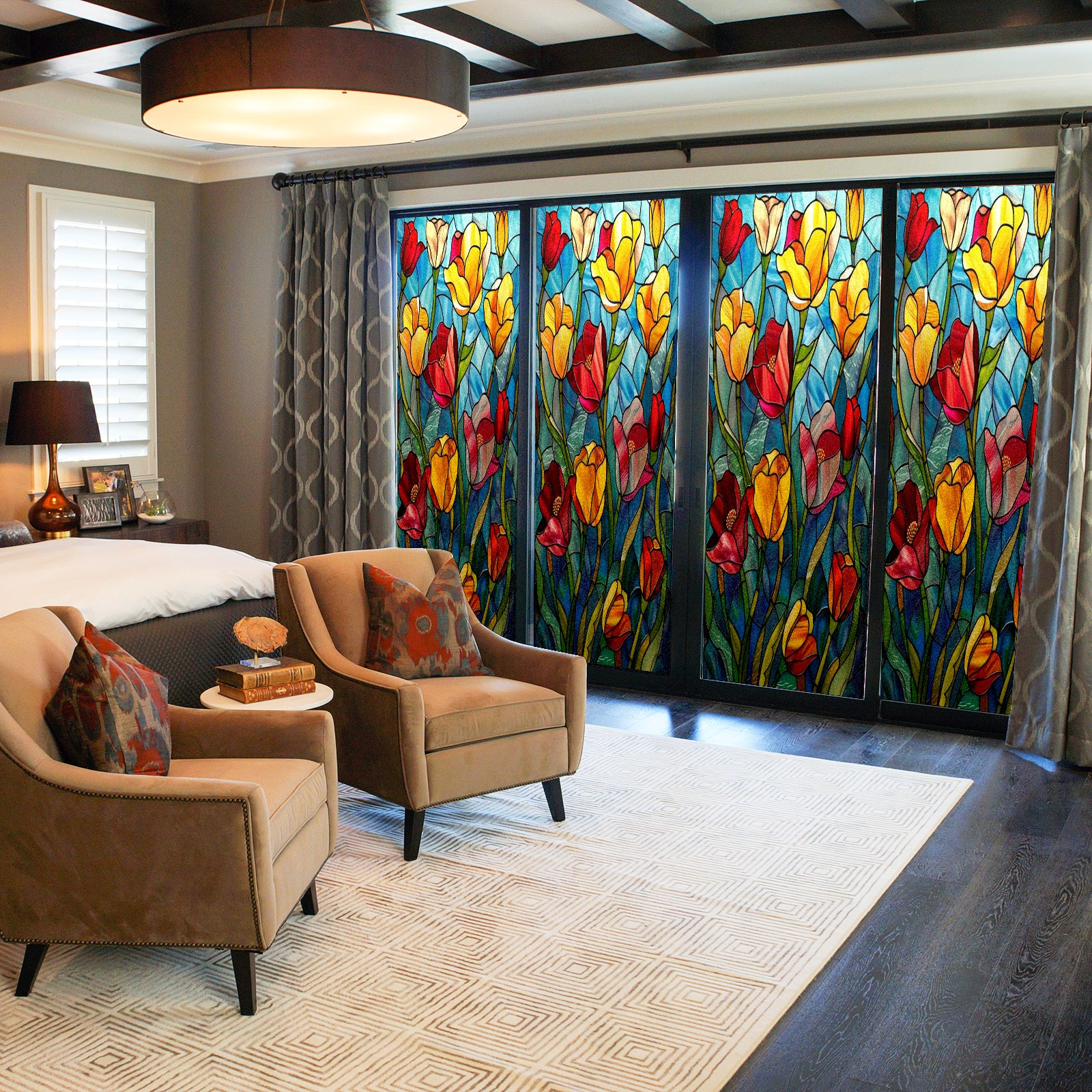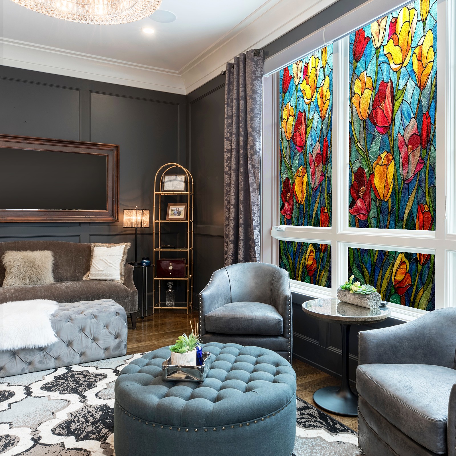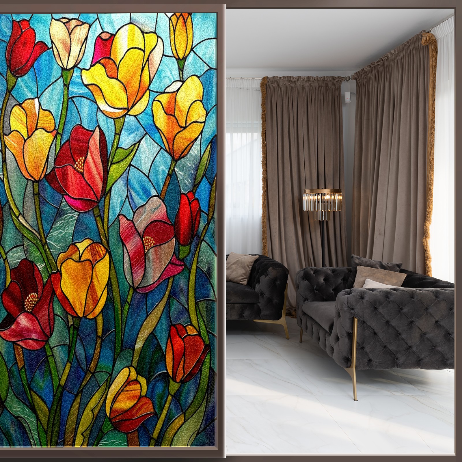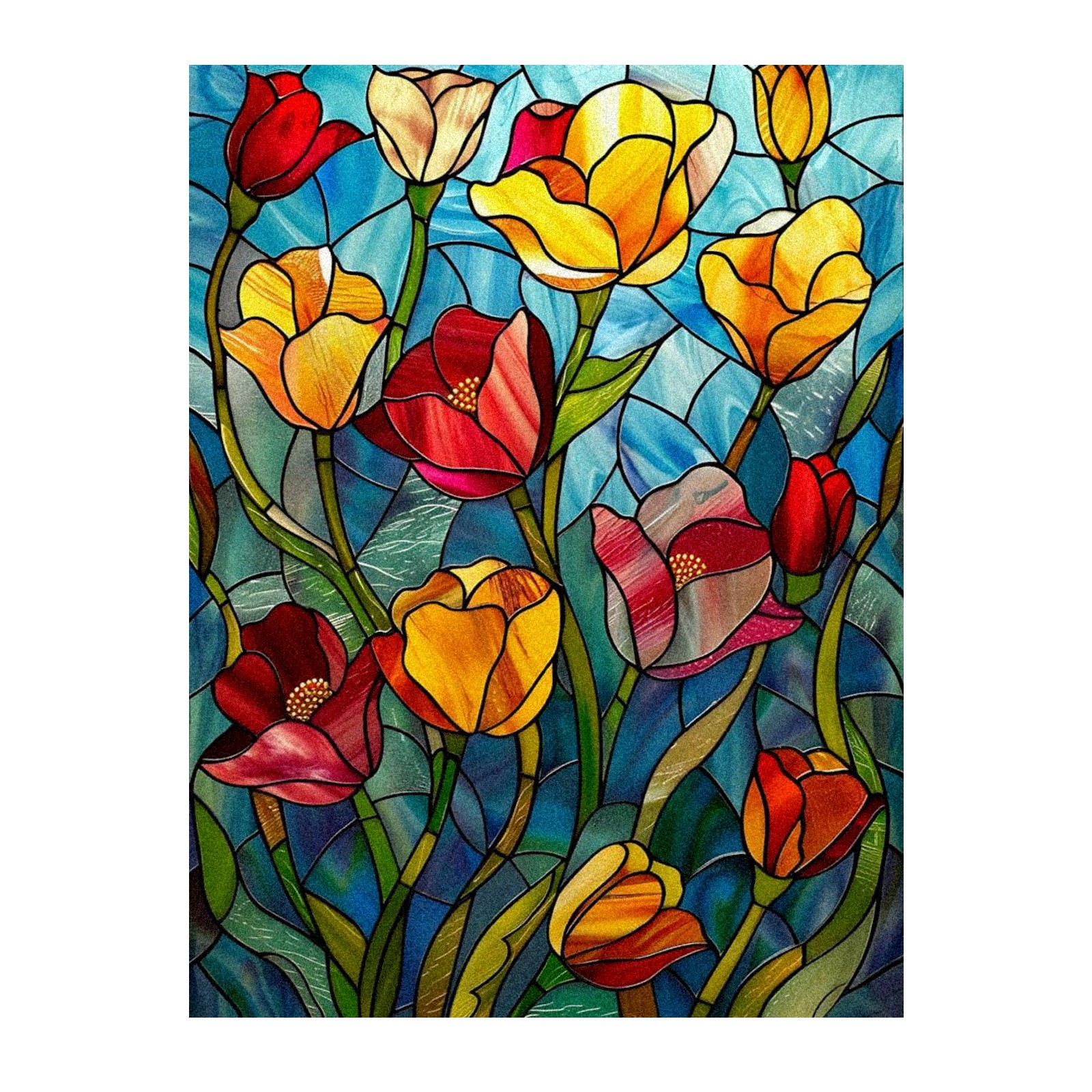 Window Privacy Film Frosted Stained Glass Film Decorative Static Cling for Bathroom Home Office Peel and Stick Window Film Colorful Tulips Flower(17.7x23.6in)