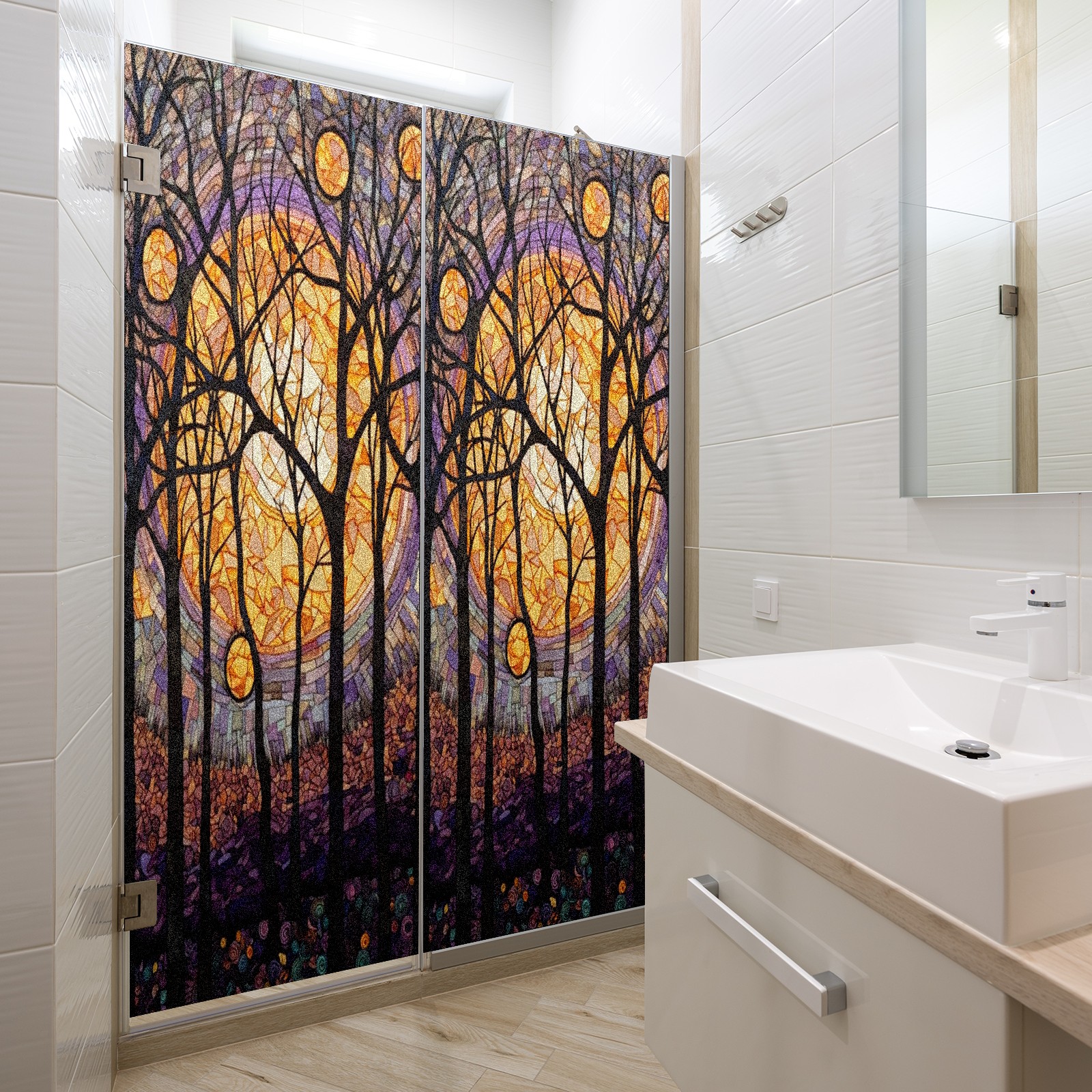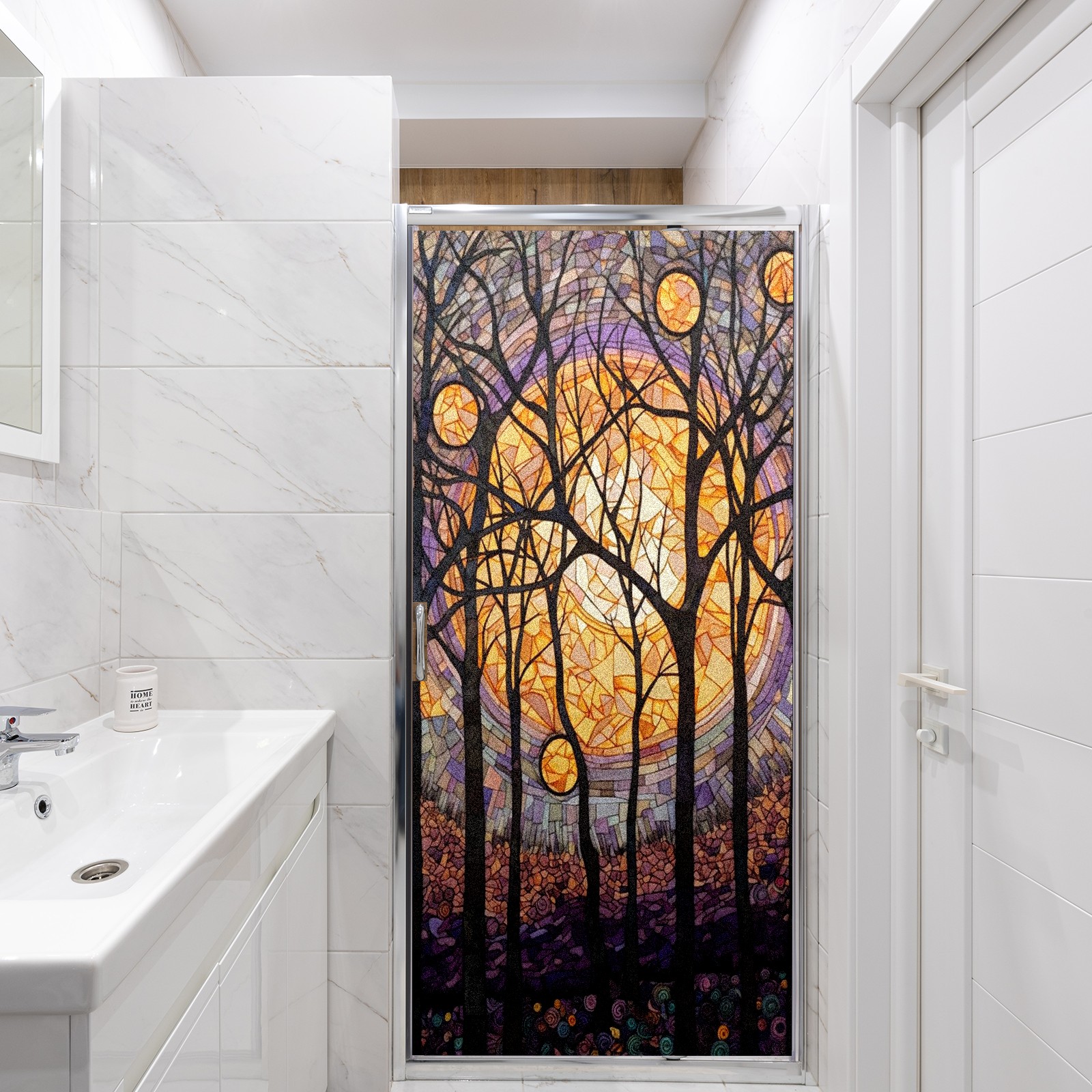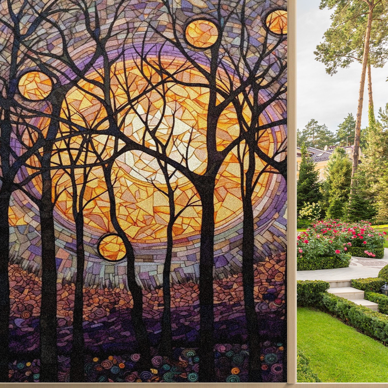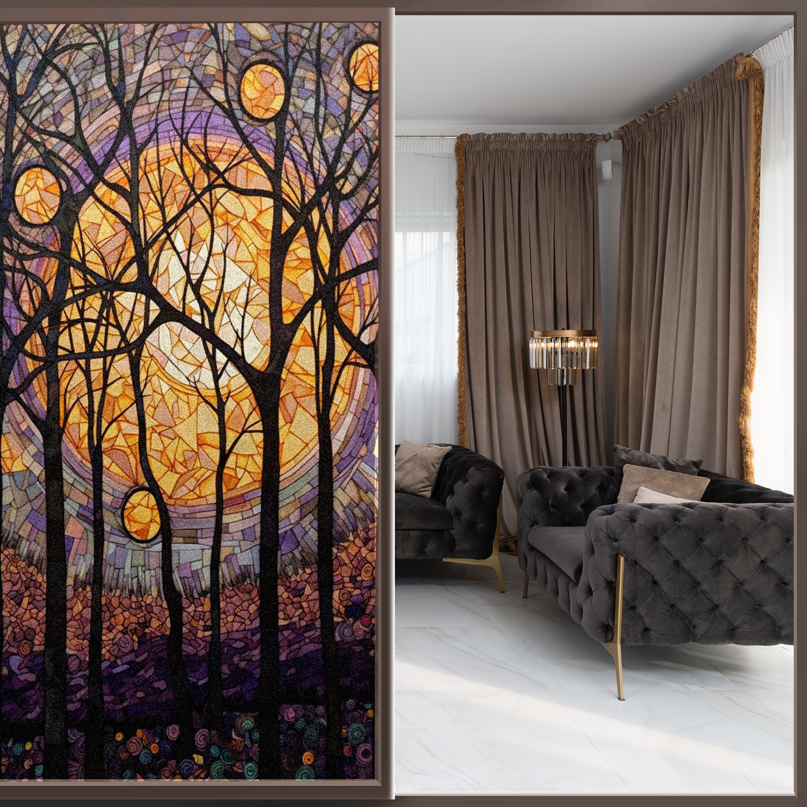 Window Privacy Film Frosted Stained Glass Film Decorative Static Cling for Bathroom Home Office Peel and Stick Window Film Yellow Purple Sun Tree(17.7x23.6in)
