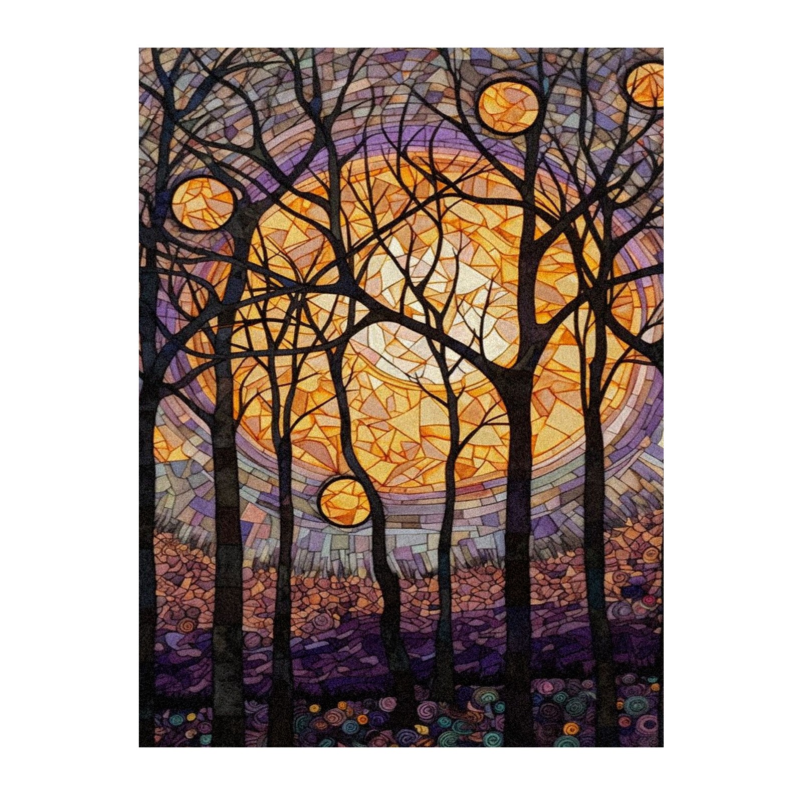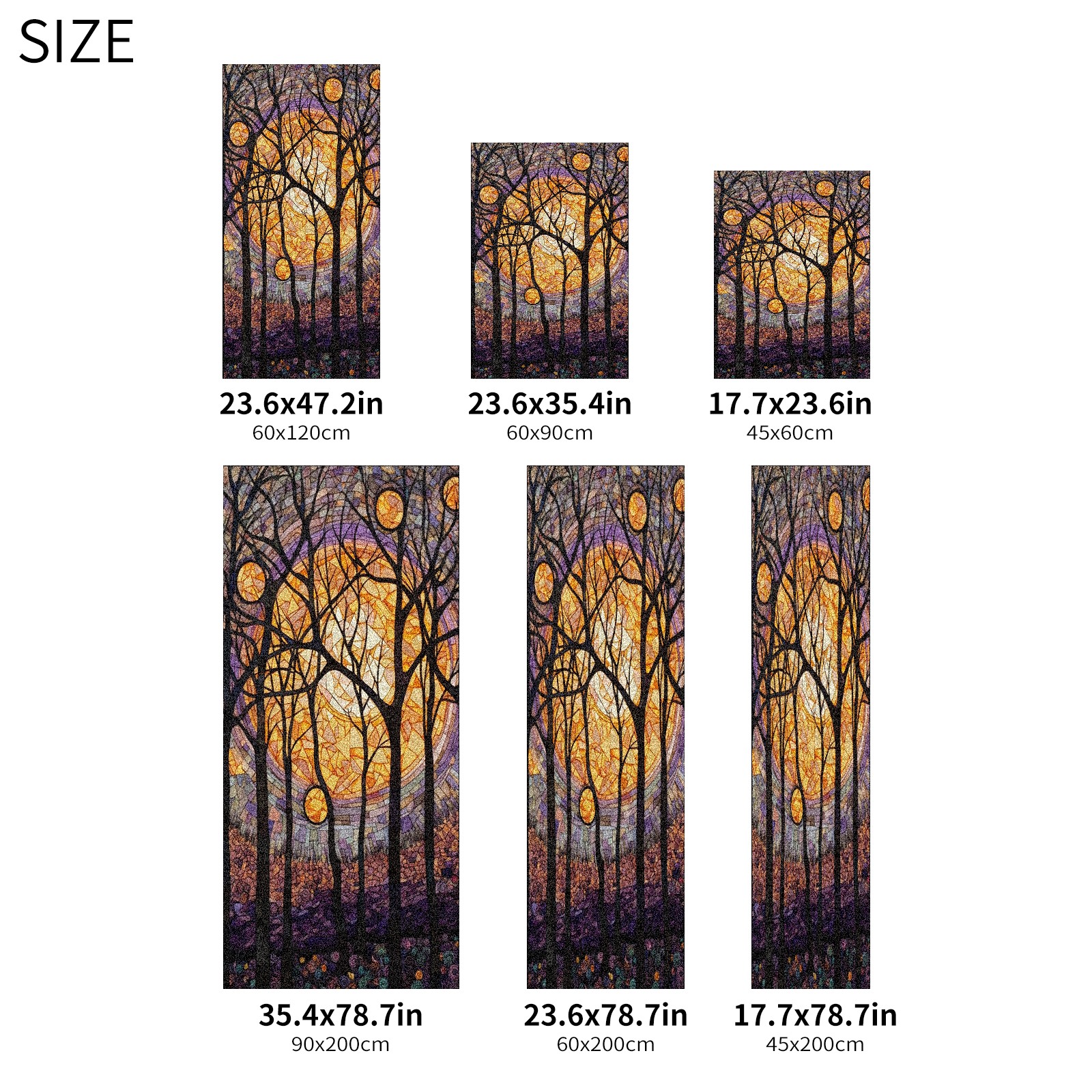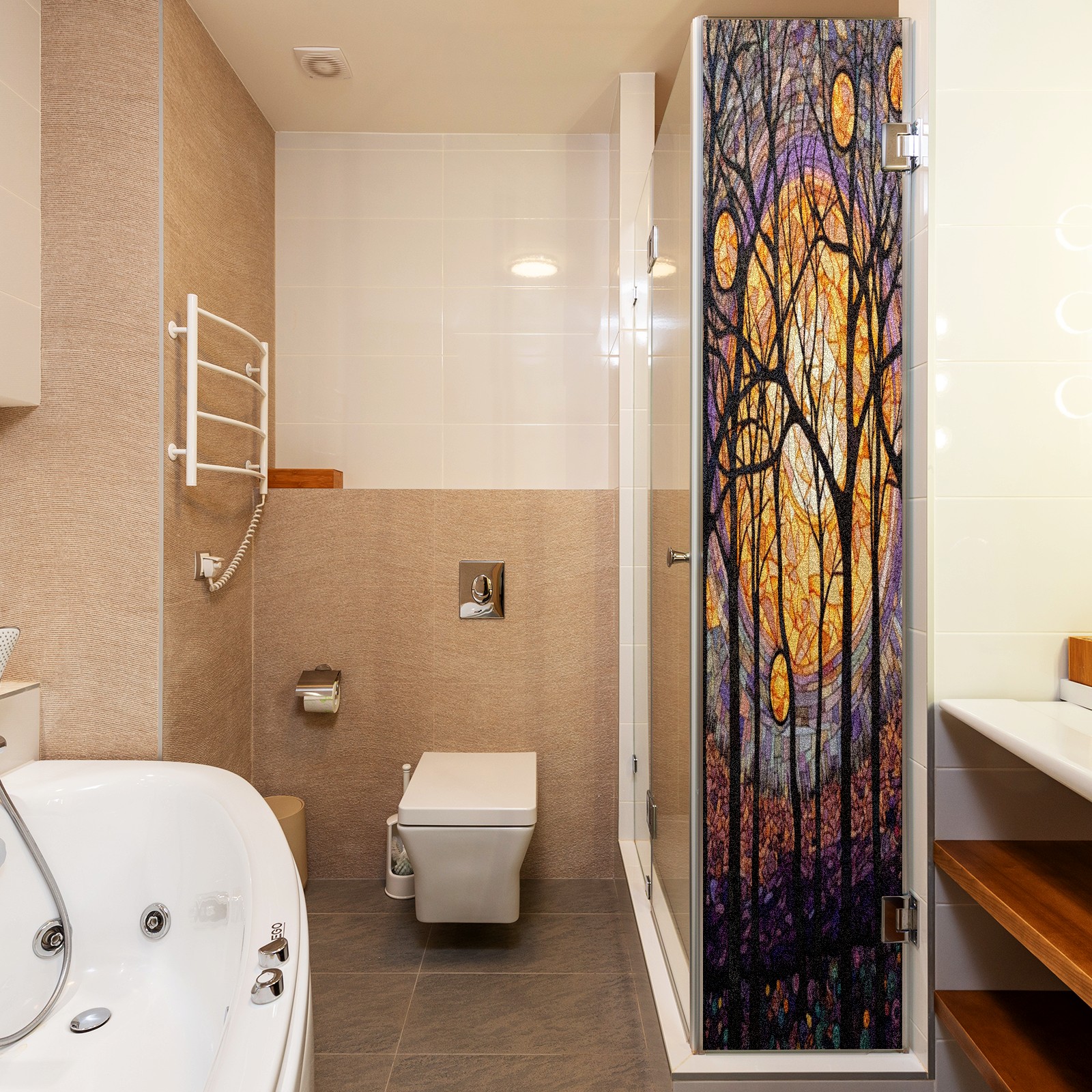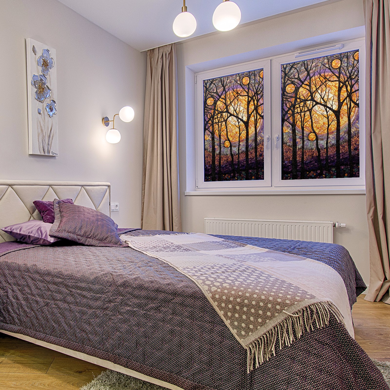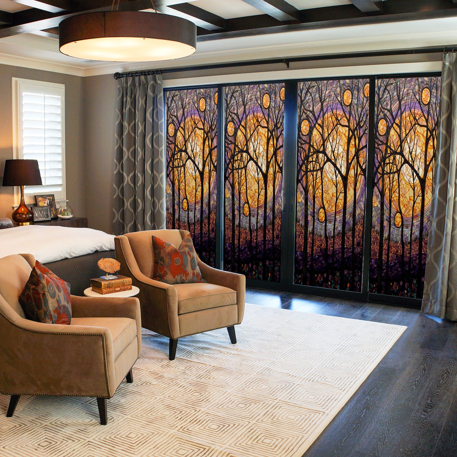 Window Privacy Film Frosted Stained Glass Film Decorative Static Cling for Bathroom Home Office Peel and Stick Window Film Yellow Purple Sun Tree(17.7x23.6in)