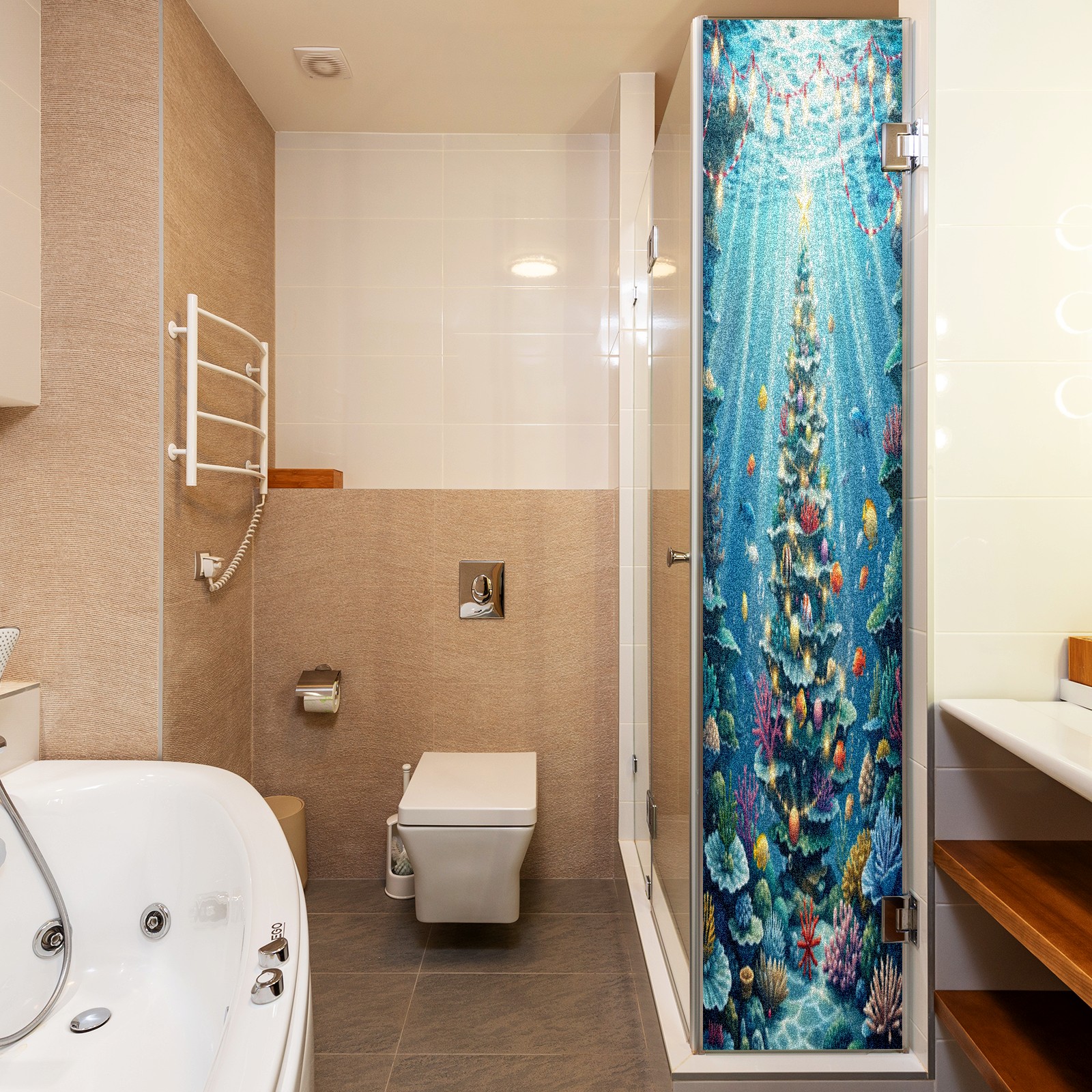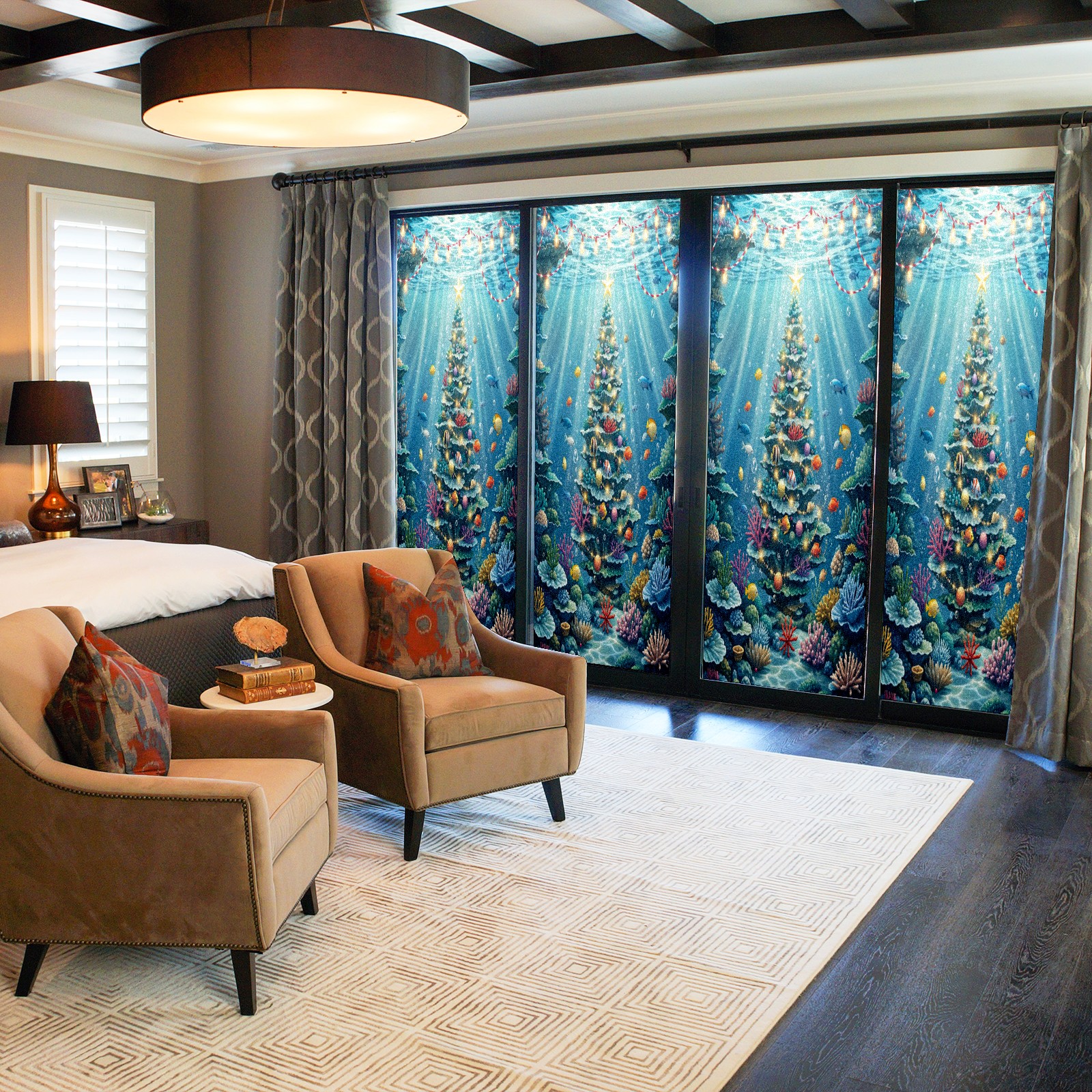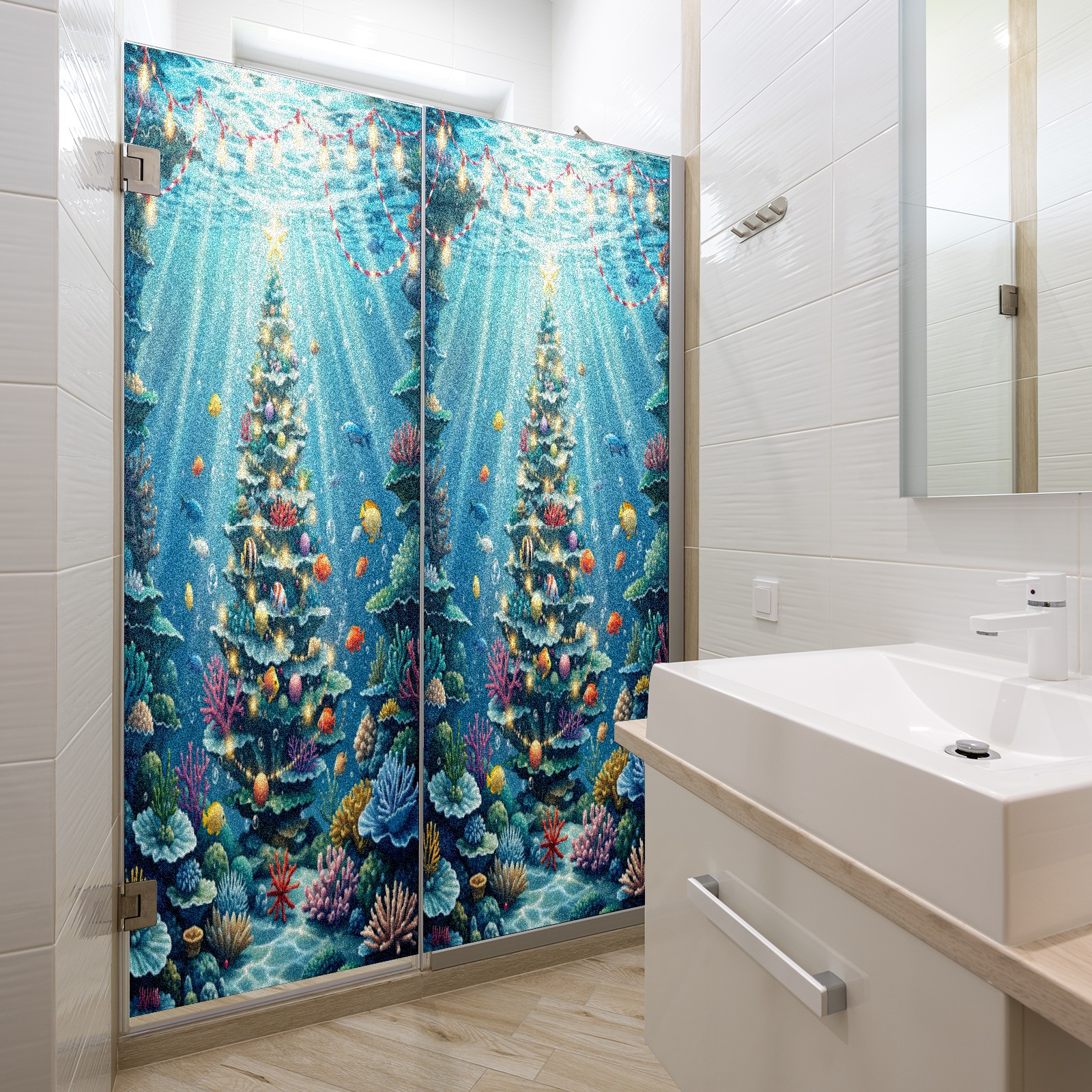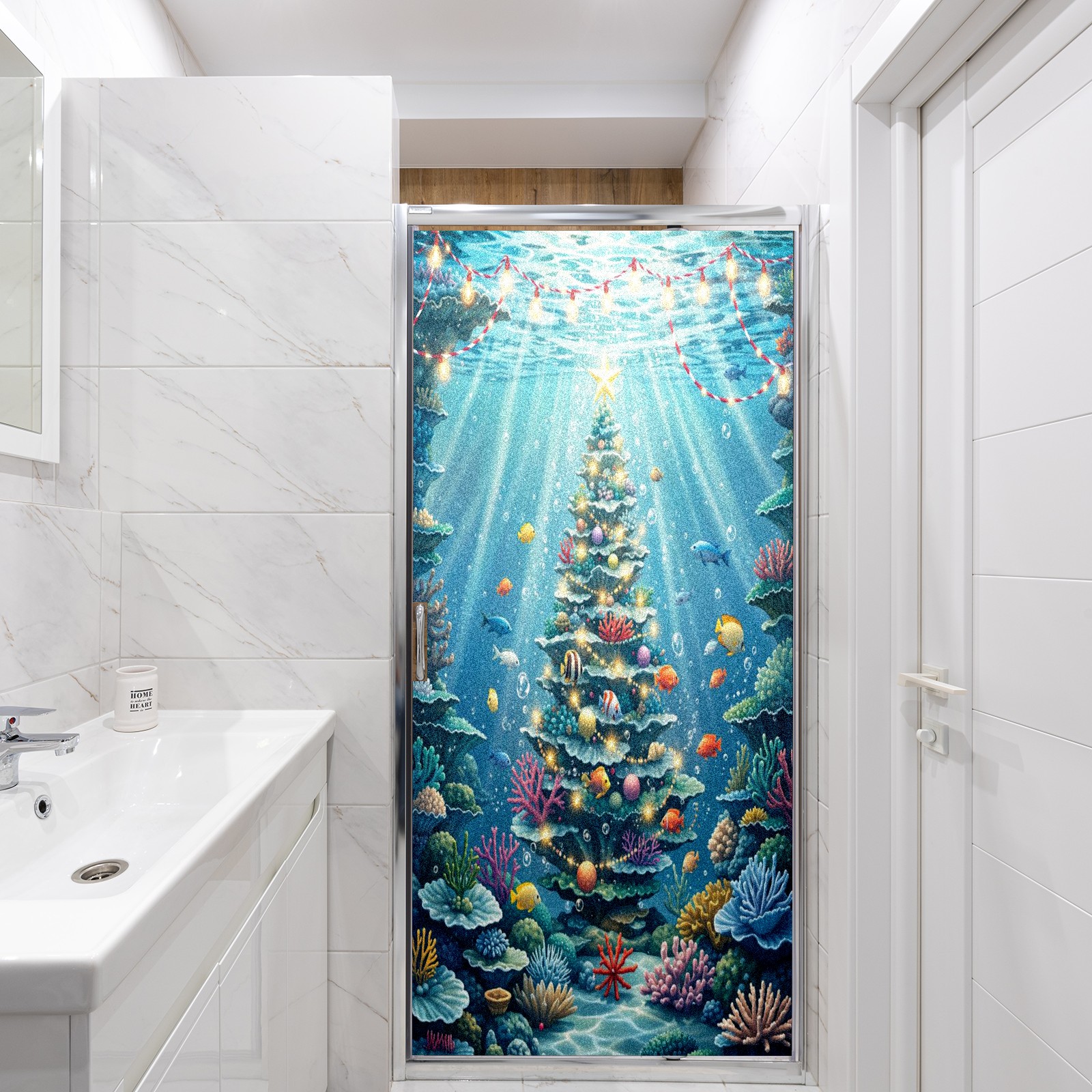 Window Privacy Film Frosted Stained Glass Film Decorative Static Cling for Bathroom Home Office Peel and Stick Window Film Underwater Blue Christmas Tree Fishes(17.7x23.6in)