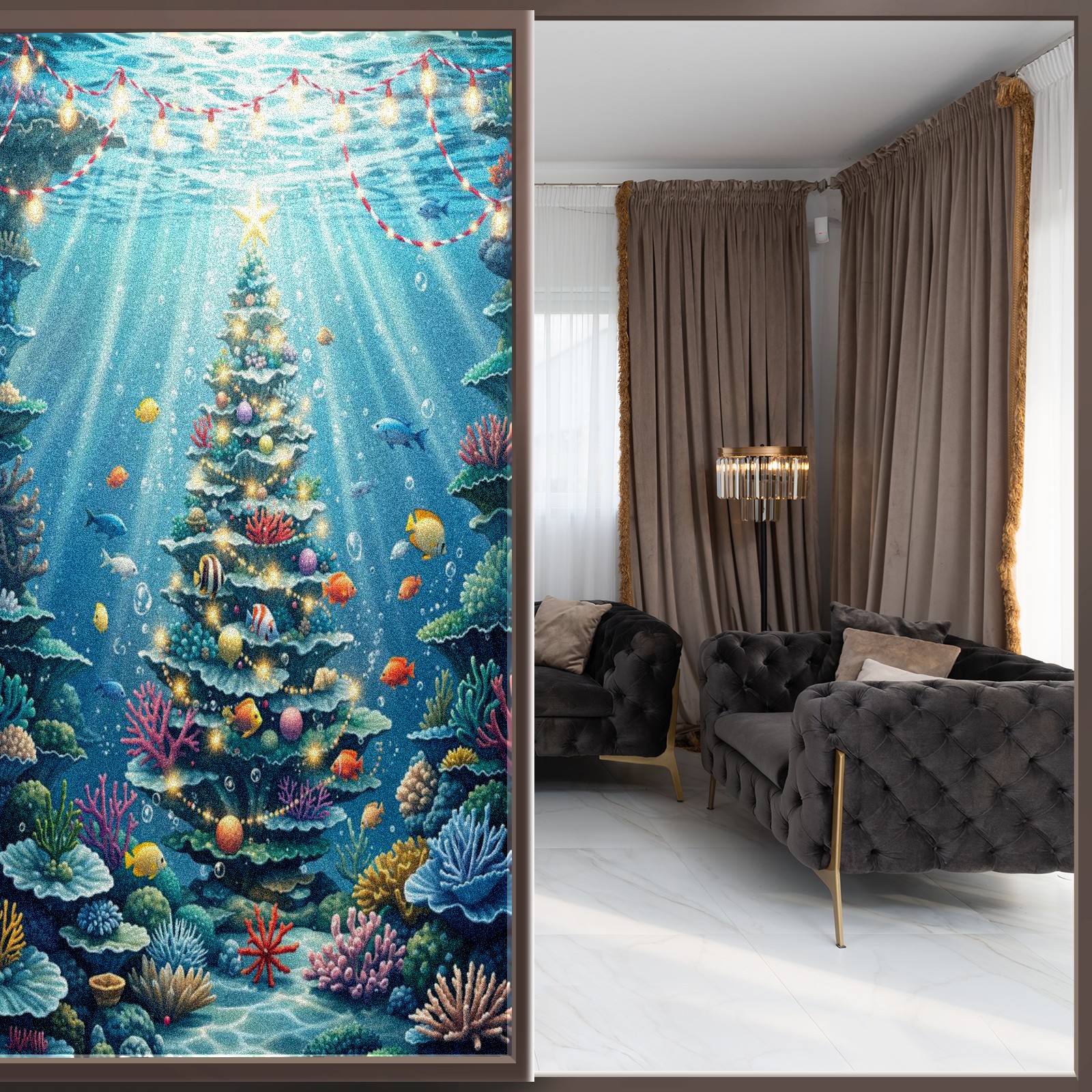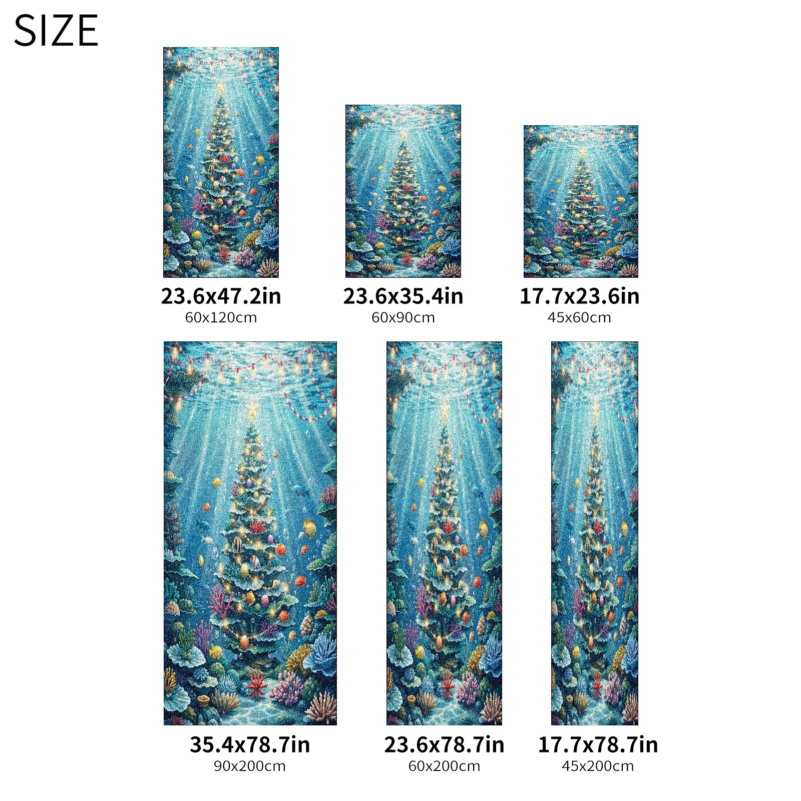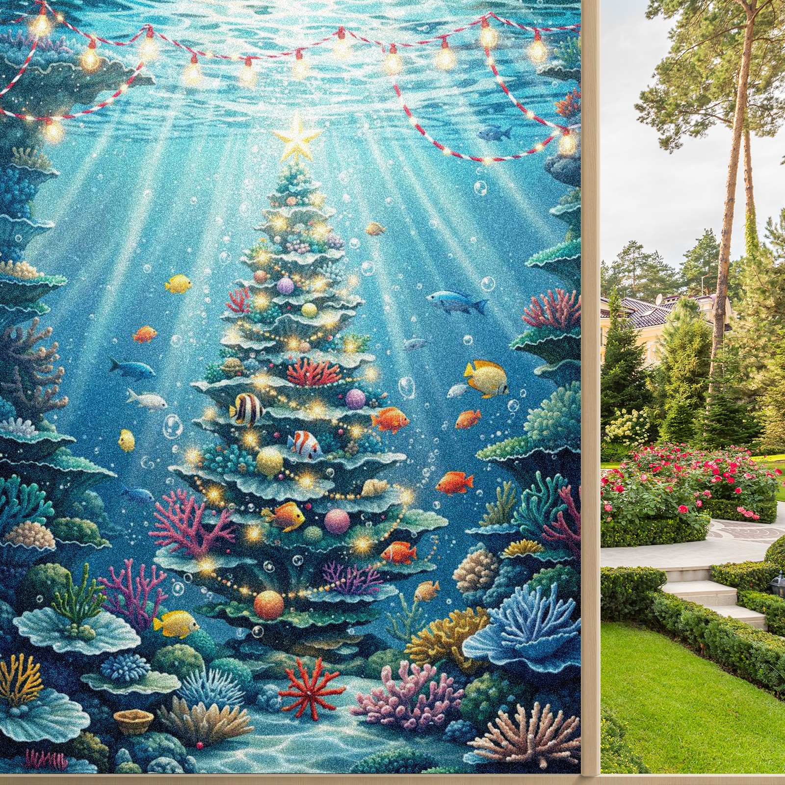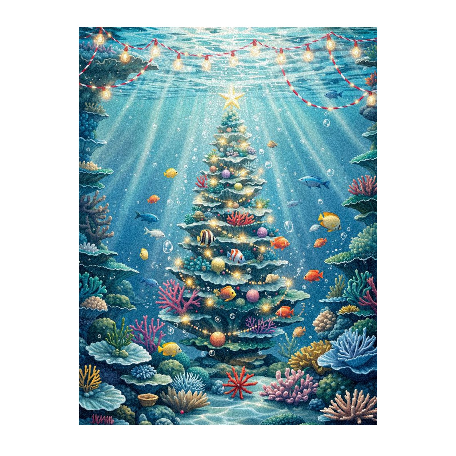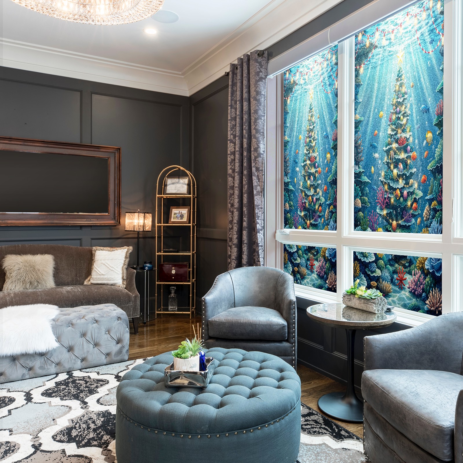 Window Privacy Film Frosted Stained Glass Film Decorative Static Cling for Bathroom Home Office Peel and Stick Window Film Underwater Blue Christmas Tree Fishes(17.7x23.6in)