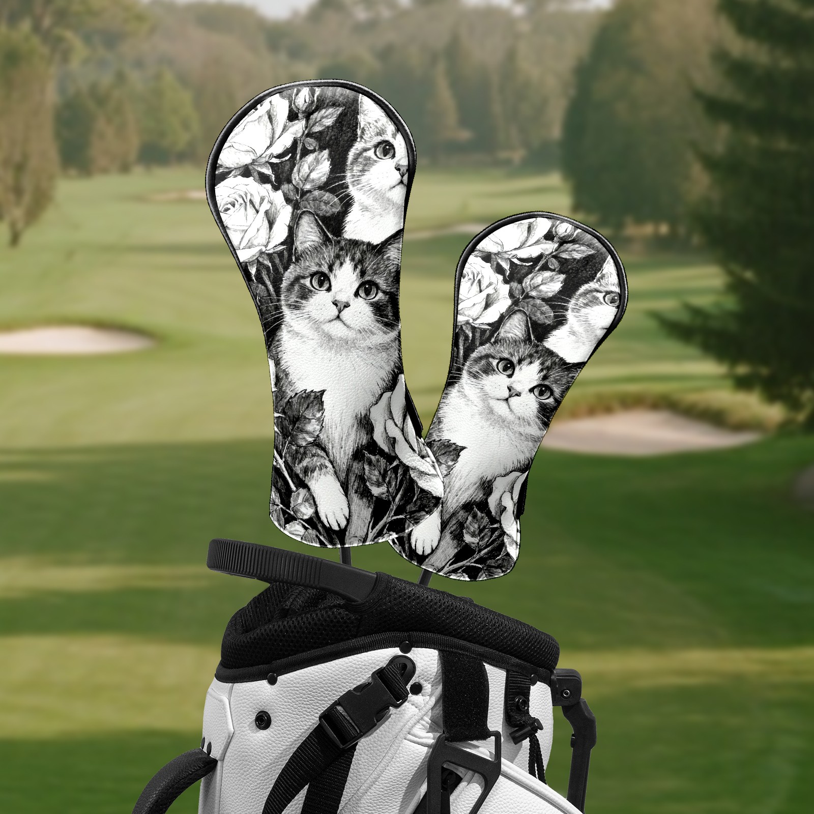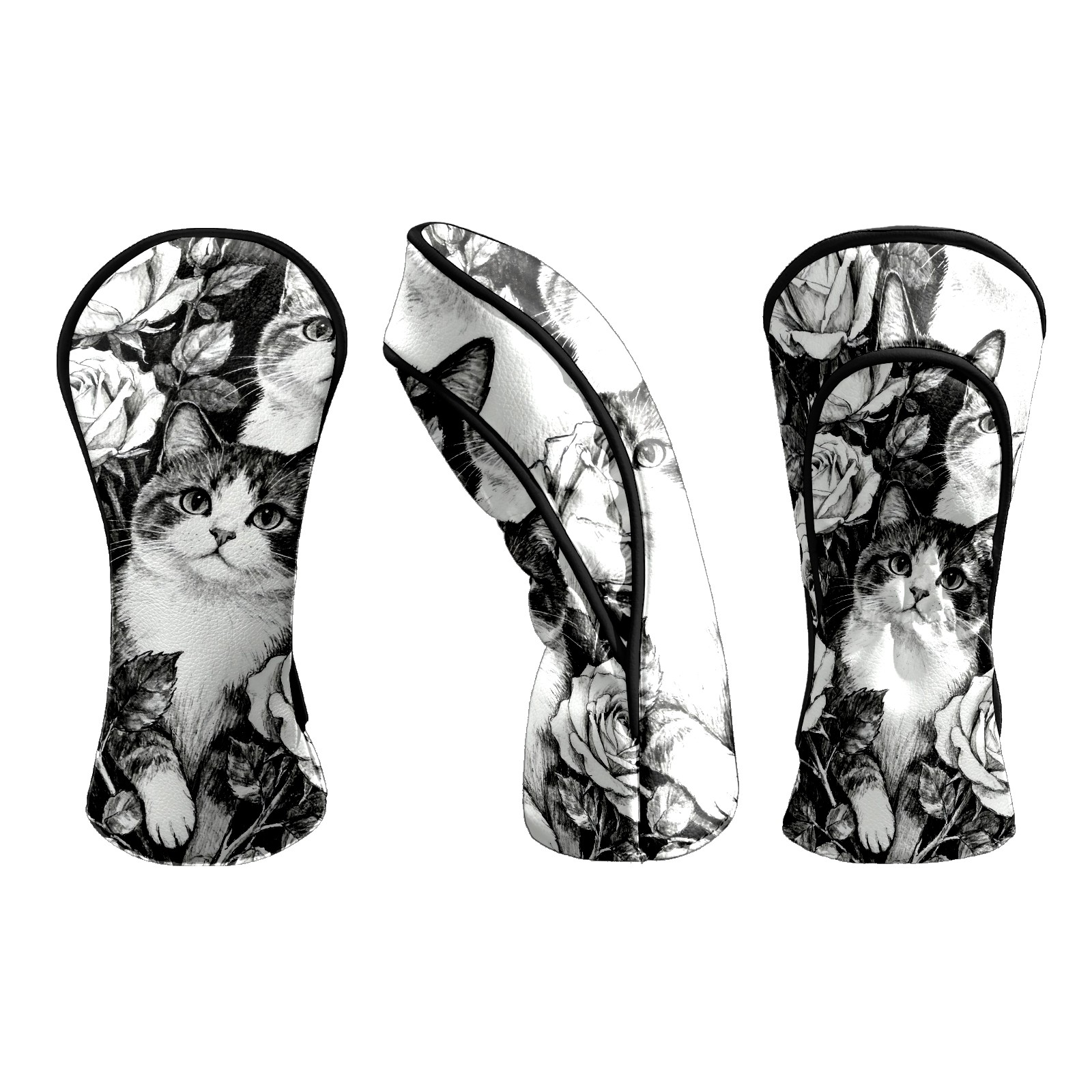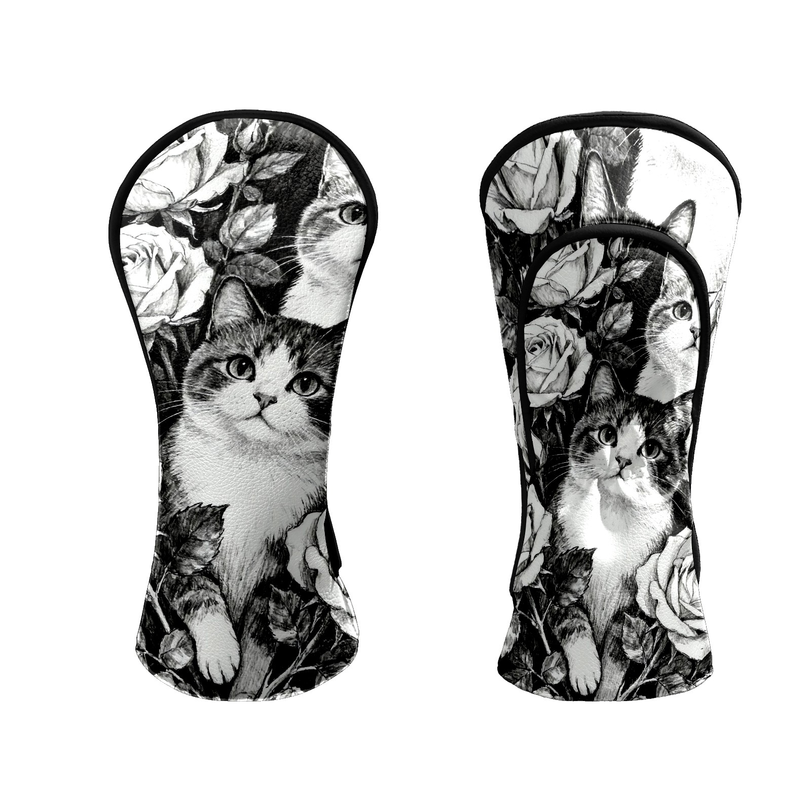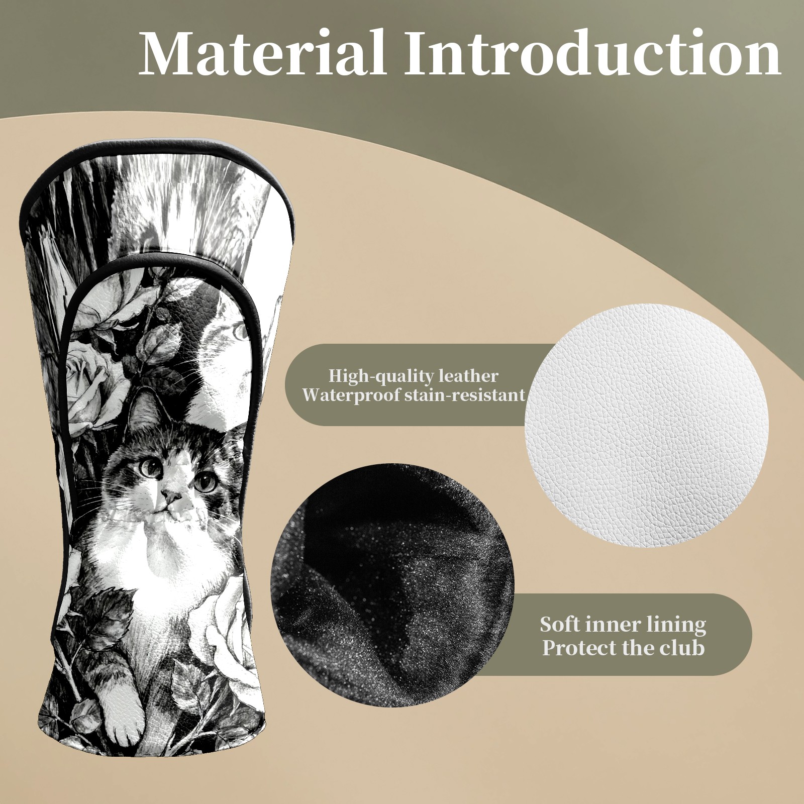 Golf Head Covers Leather Driver Head Cover, Premium Golf Club Covers with Soft Lining Fits Driver Hybrid Fairway 3/5 Wood for Women Men (Cat Flowers Black White)