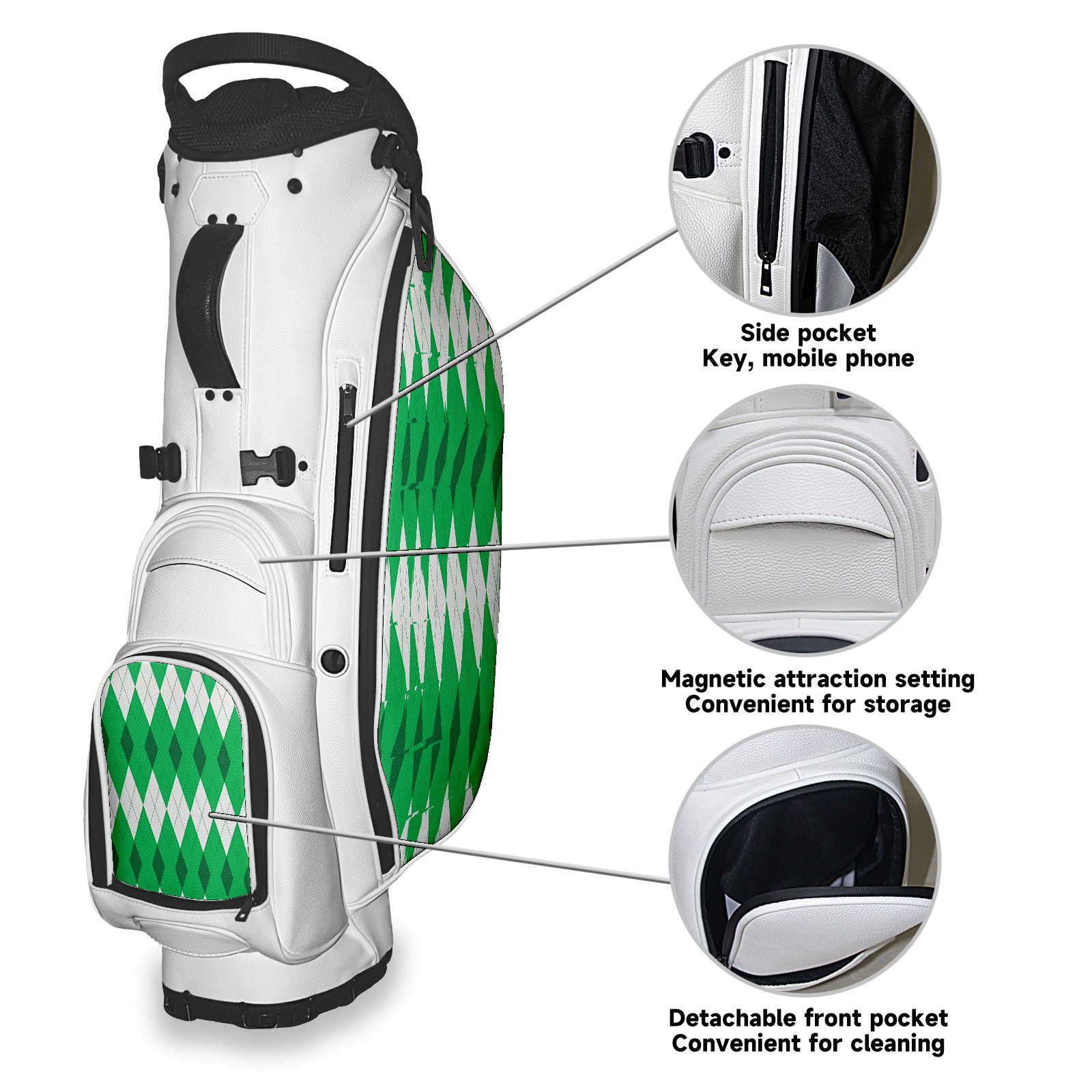 • <p>The Golf Stand Bag, designed specifically for golf enthusiasts, offers a choice of 5 - way and 14 - way top dividers. Its 5/14 - compartment design with independent full - size club compartments safeguards clubs from collisions. Equipped with a rain cover, waterproof zippered pockets (tested to resist moderate to heavy rain), and a high - performance cooler pouch that can keep drinks cold for hours, it ensures a convenient golfing experience. The bag features thickened, breathable neoprene shoulder straps and an adjustable chest buckle, reducing shoulder fatigue by 35% compared to regular bags, and its automatic aluminum alloy stand provides stable support on various terrains. Crafted from top - tier, water - resistant litchi - grain PU leather, with double - stitched edges, reliable zippers tested for over 15,000 cycles, and anti - abrasion bottom studs, it guarantees durability. You can personalize it with embroidery on the front pocket and rain cover side (15*15cm area), and it comes in classic black and white, with a matte finish and litchi - grain texture that combines business and leisure styles. Measuring 130 cm in height, 37 cm in width, and 31 cm in depth (including rain cover) and 90 cm x 31 cm x 37 cm (excluding rain cover), it strikes a balance between storage and portability, capable of holding 14 standard - sized clubs and other essentials, and it also includes a dust cover. It's truly the perfect choice for golfers.<br></p>