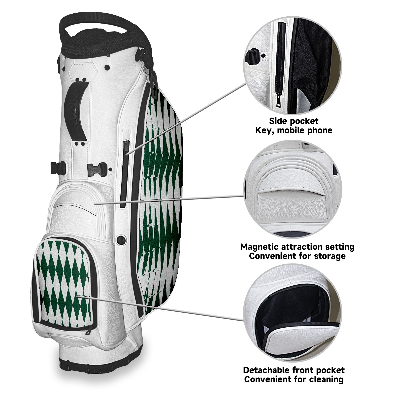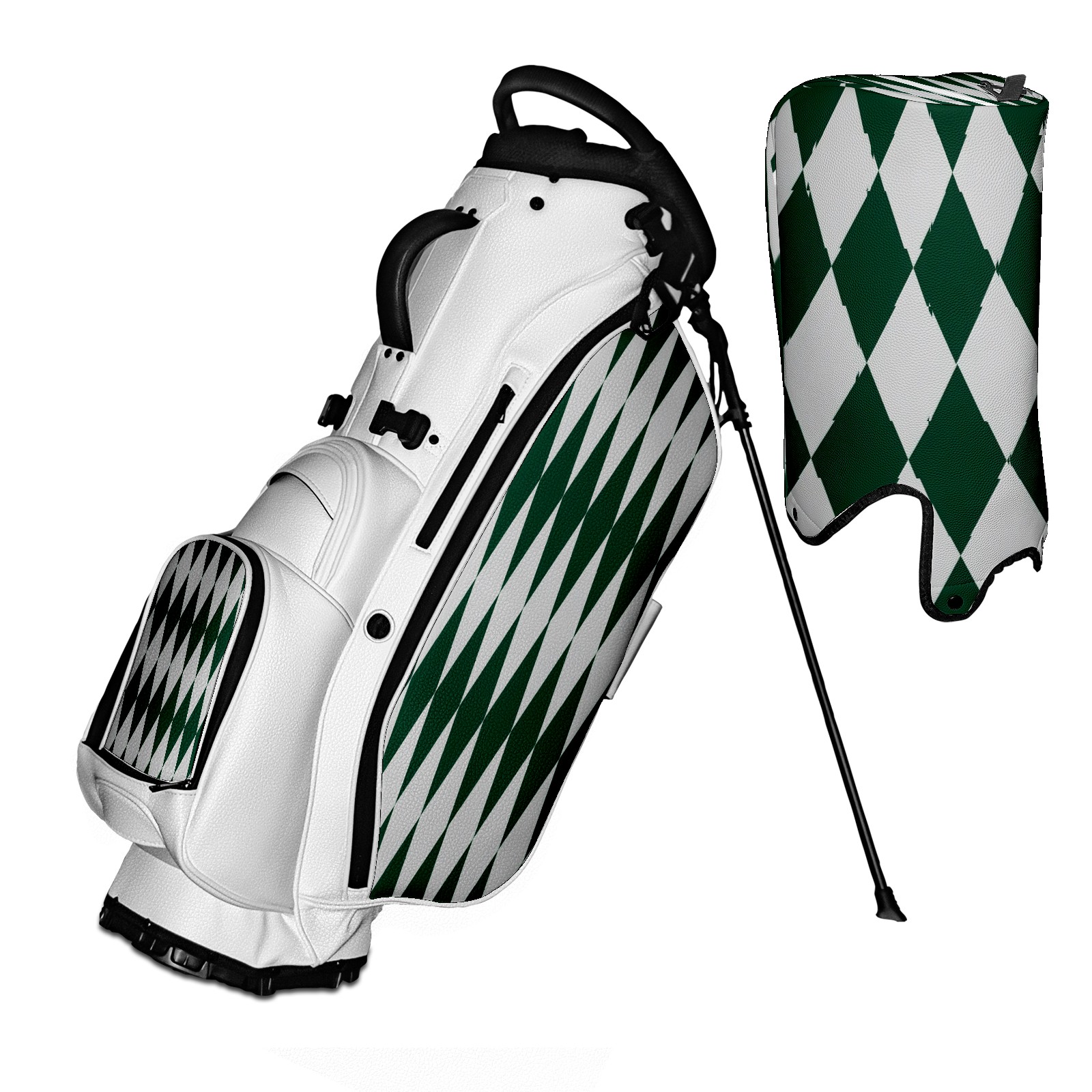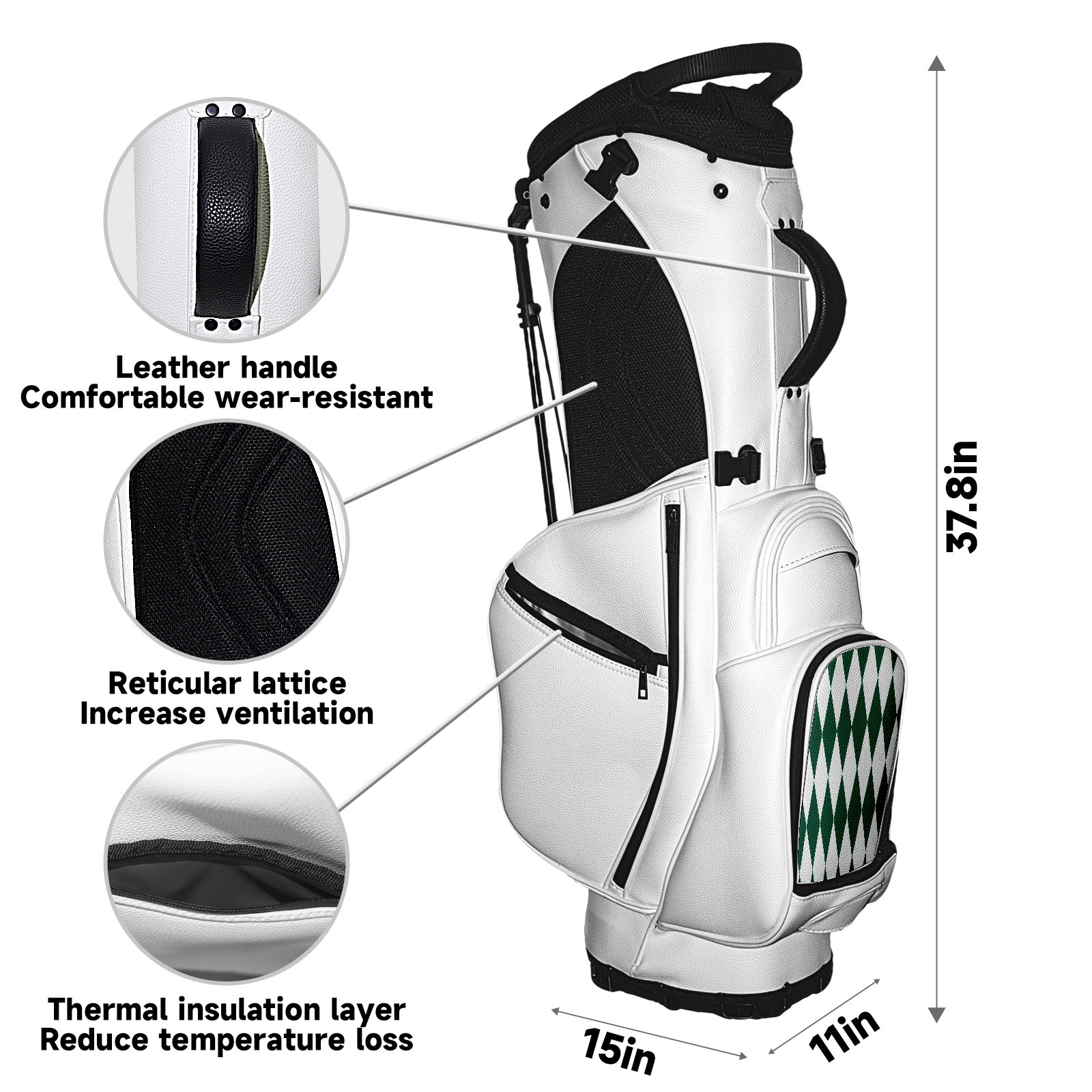 • <p>The Golf Stand Bag, designed specifically for golf enthusiasts, offers a choice of 5 - way and 14 - way top dividers. Its 5/14 - compartment design with independent full - size club compartments safeguards clubs from collisions. Equipped with a rain cover, waterproof zippered pockets (tested to resist moderate to heavy rain), and a high - performance cooler pouch that can keep drinks cold for hours, it ensures a convenient golfing experience. The bag features thickened, breathable neoprene shoulder straps and an adjustable chest buckle, reducing shoulder fatigue by 35% compared to regular bags, and its automatic aluminum alloy stand provides stable support on various terrains. Crafted from top - tier, water - resistant litchi - grain PU leather, with double - stitched edges, reliable zippers tested for over 15,000 cycles, and anti - abrasion bottom studs, it guarantees durability. You can personalize it with embroidery on the front pocket and rain cover side (15*15cm area), and it comes in classic black and white, with a matte finish and litchi - grain texture that combines business and leisure styles. Measuring 130 cm in height, 37 cm in width, and 31 cm in depth (including rain cover) and 90 cm x 31 cm x 37 cm (excluding rain cover), it strikes a balance between storage and portability, capable of holding 14 standard - sized clubs and other essentials, and it also includes a dust cover. It's truly the perfect choice for golfers.<br></p>