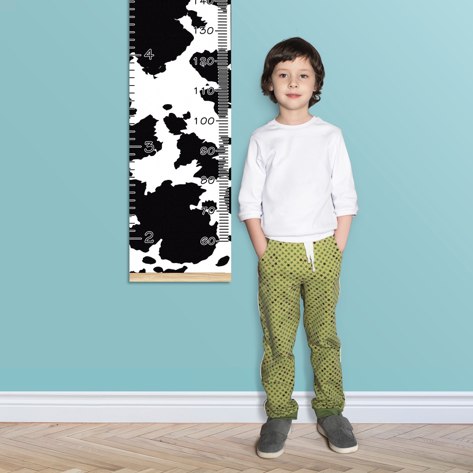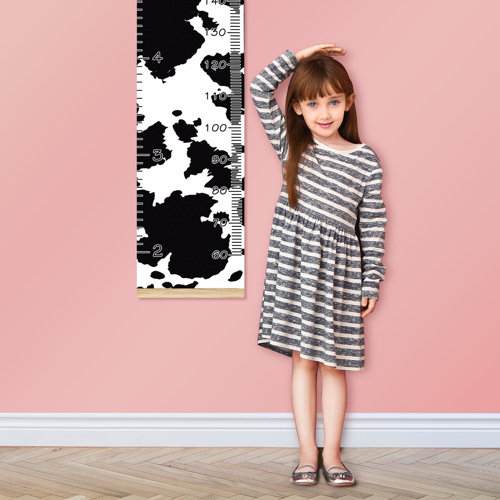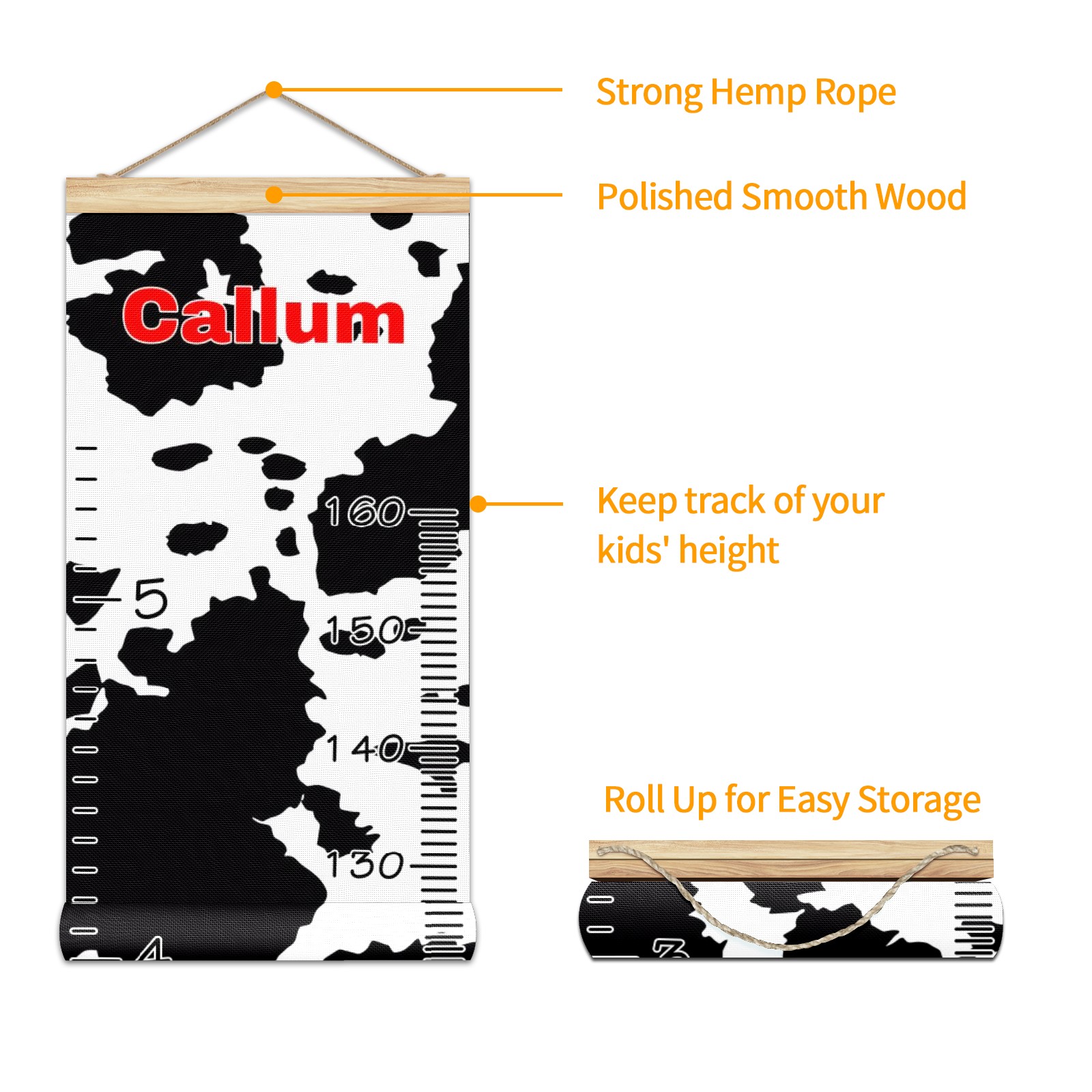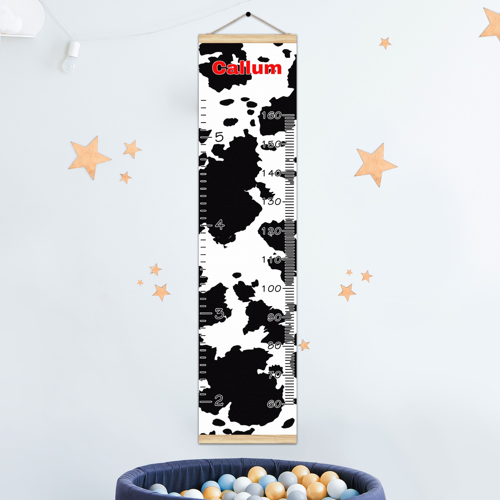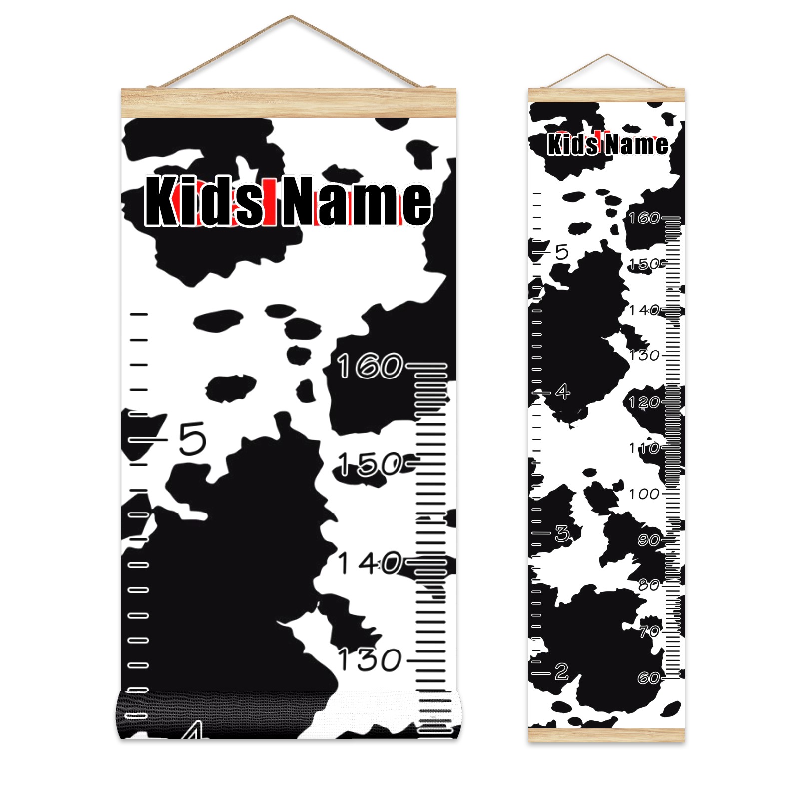 Personalized Kids Name Growth Chart Ruler for Wall Wood Frame Canvas Height Measure Chart 13.4x56 in Hanging Growth Chart Western Black And White Cow Print12.10 Boys Girls Room Decor