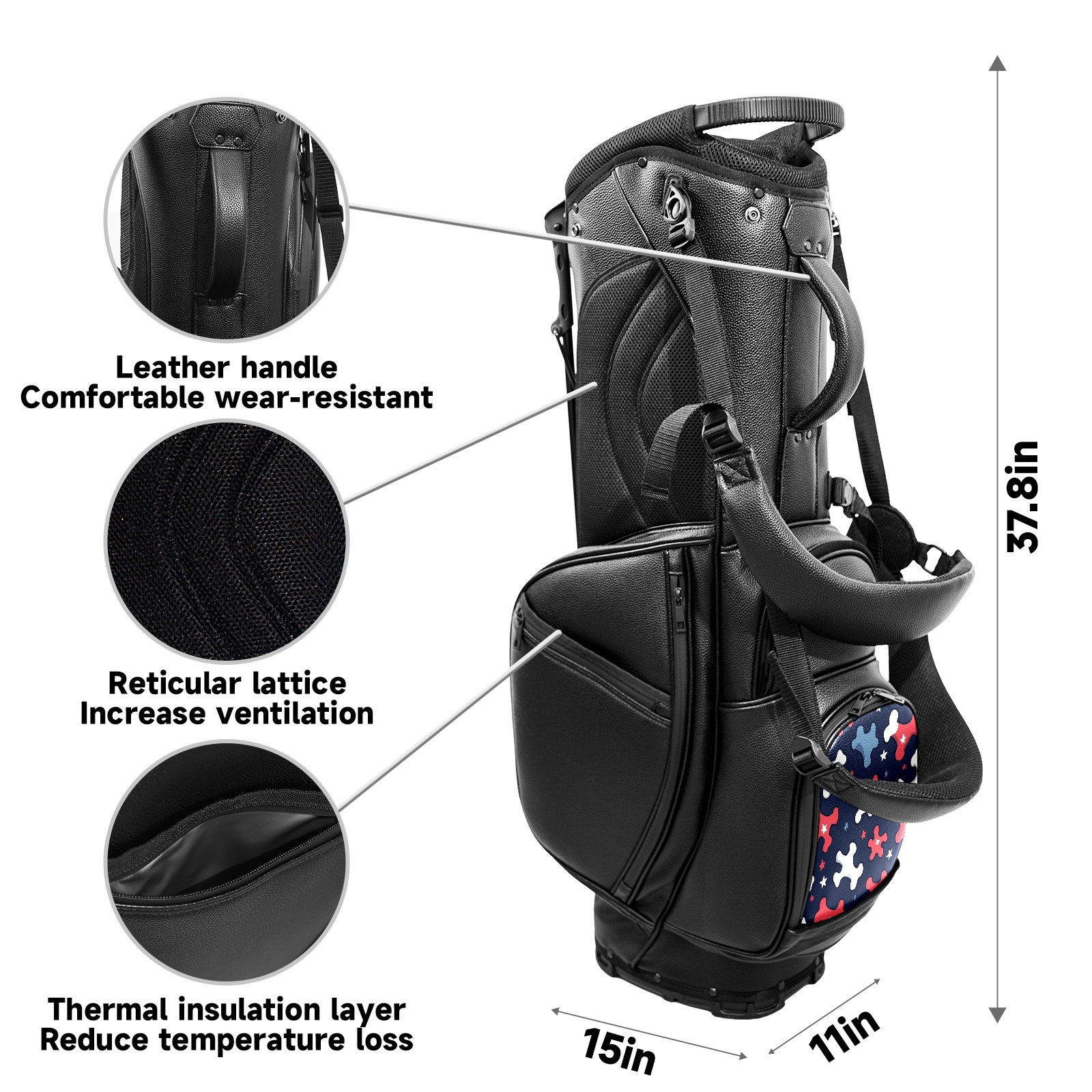 <p>This golf cart bag combines versatility with durability, providing comprehensive protection and convenient access for your clubs. The five-way top compartments provide strategic zoning for easily storing a variety of clubs and protecting them from impacts and wear. The PU fabric and sturdy plastic base combine premium quality with durability. The versatile storage system includes multiple zippered pockets and a separate cooler compartment for storing equipment, accessories, and drinks. The portable rear handle allows for easy transport. The ergonomic, padded shoulder straps are adjustable and removable to fit your shoulder and reduce weight. A built-in rain cover effectively keeps out moisture, ensuring your clubs stay dry and protected in wet weather. This is the ideal golf bag for your golfing adventure.<br></p>