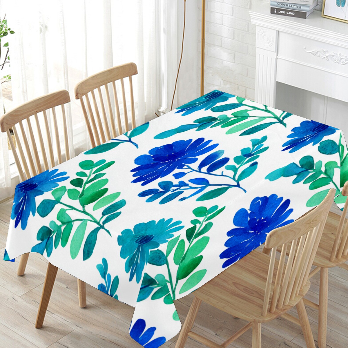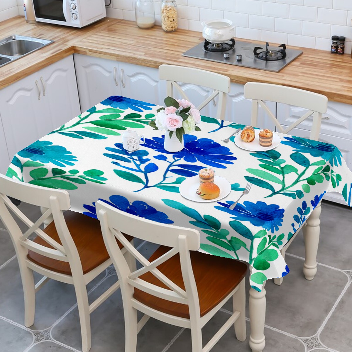 Folk Flower Blue Tablecloth - Polyester Wrinkle-Resistant Table Cover | Durable, Stain-Resistant Tablecloth for Dining Room, Outdoor Patio, Picnic & Party