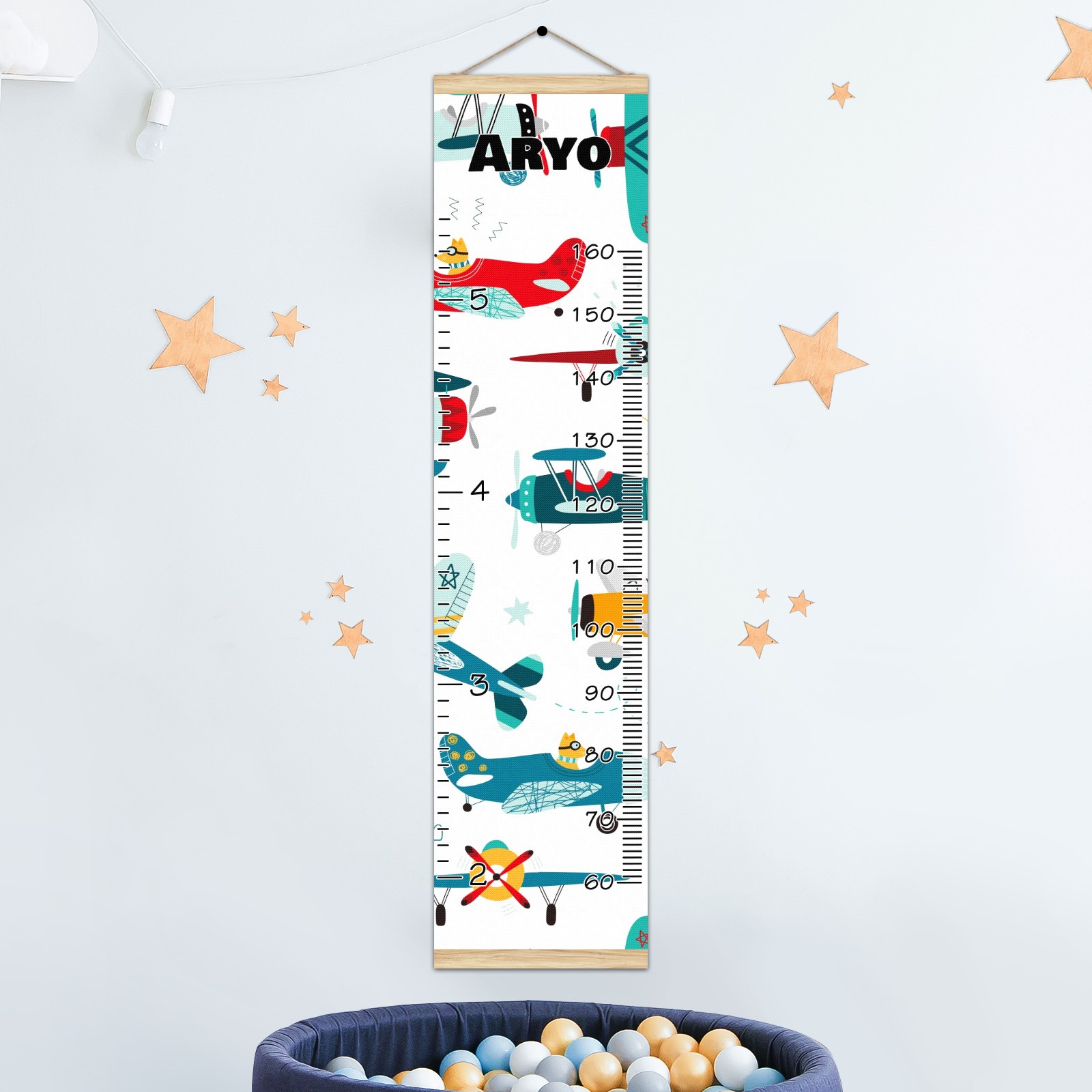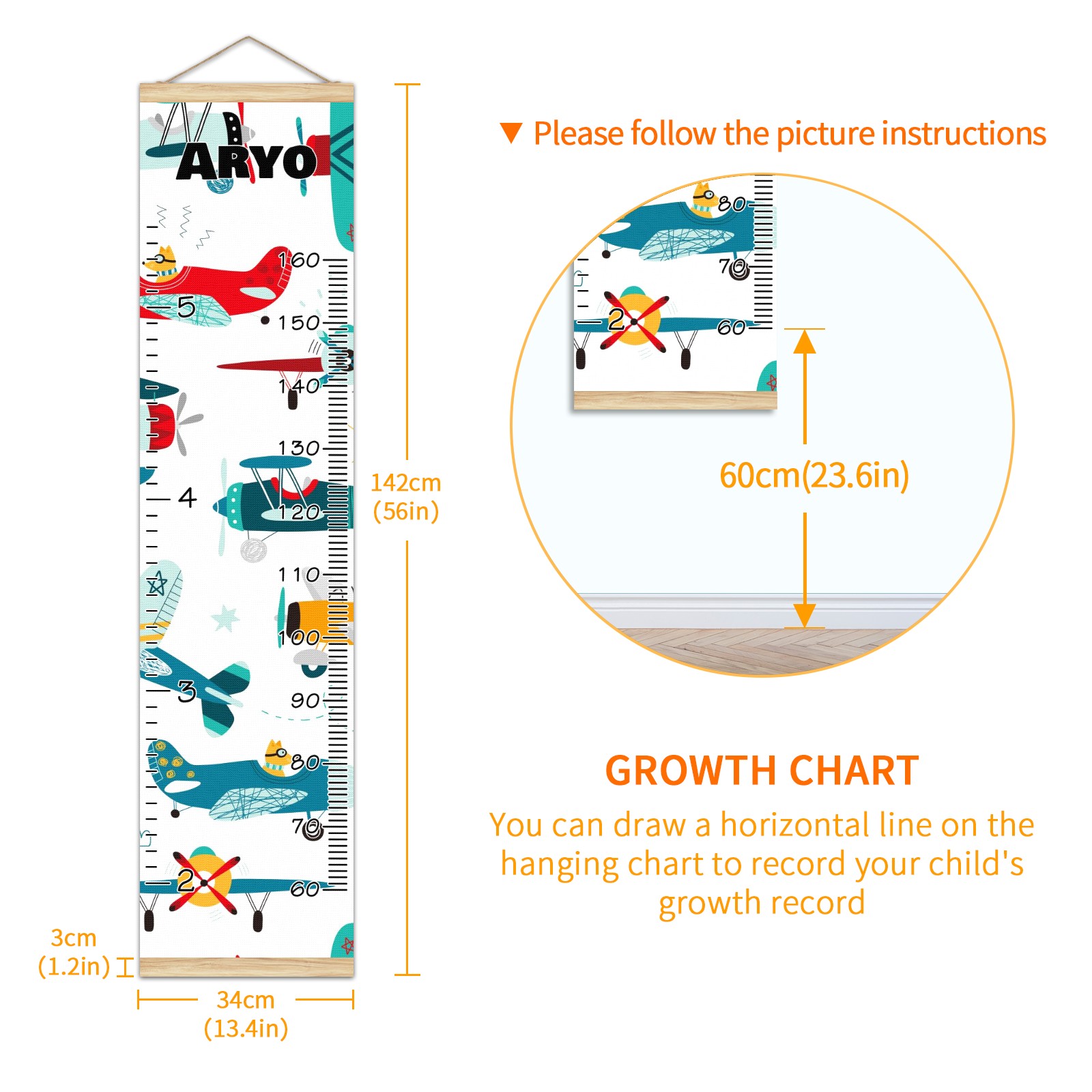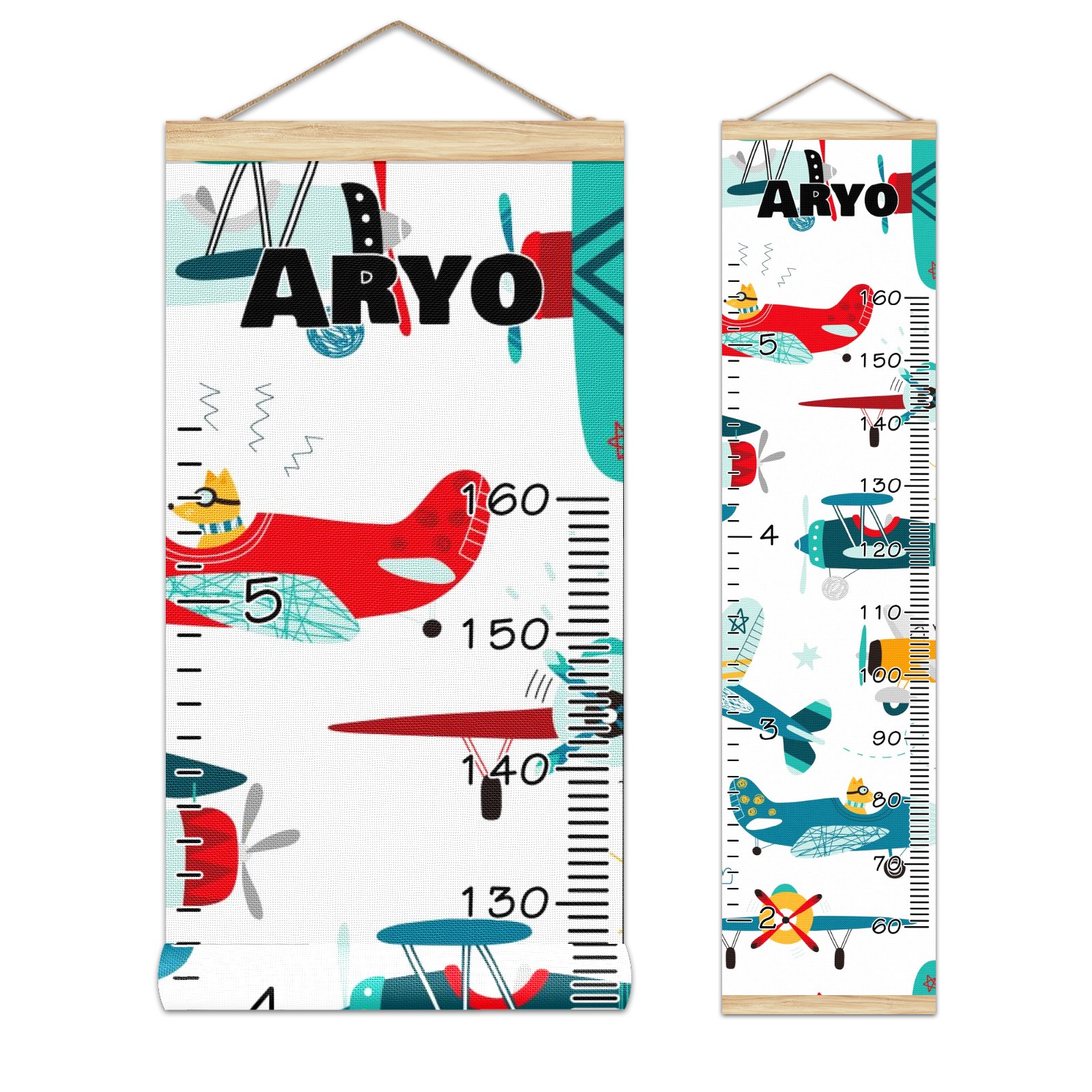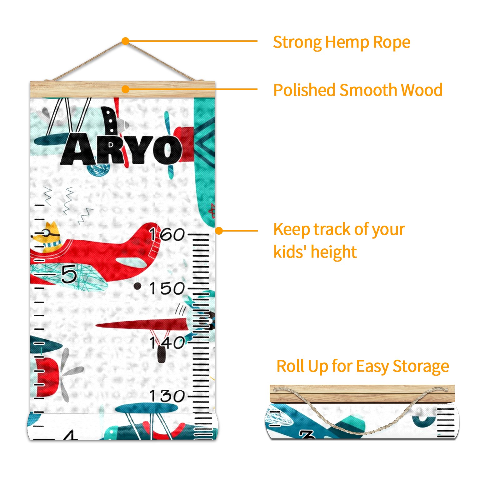 Personalized Kids Name Growth Chart Ruler for Wall Wood Frame Canvas Height Measure Chart 13.4x56 in Hanging Growth Chart Colorful Plane Helicopter12.11 Boys Girls Room Decor
