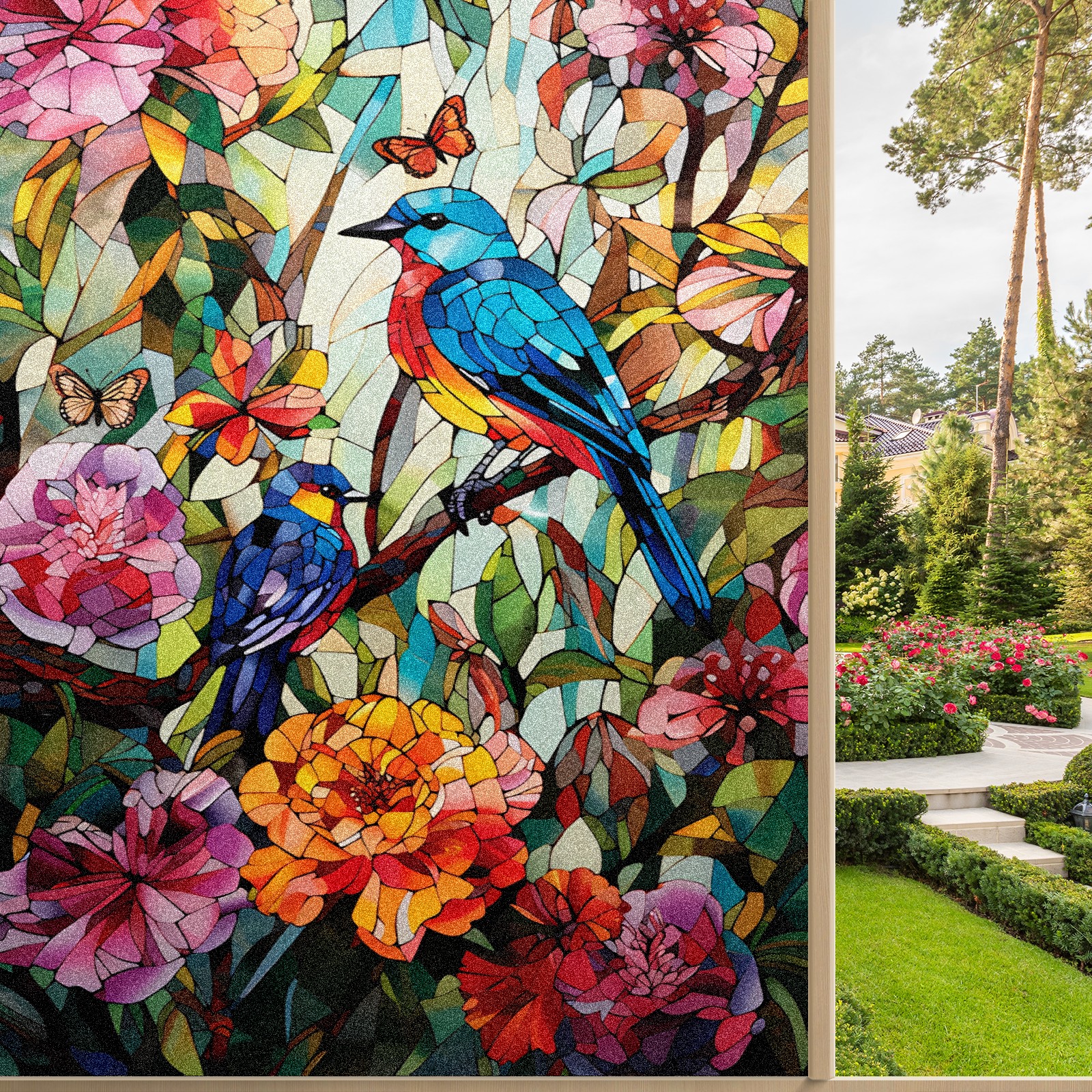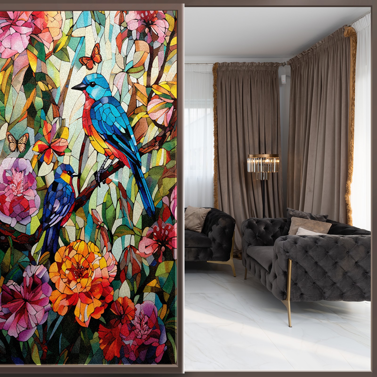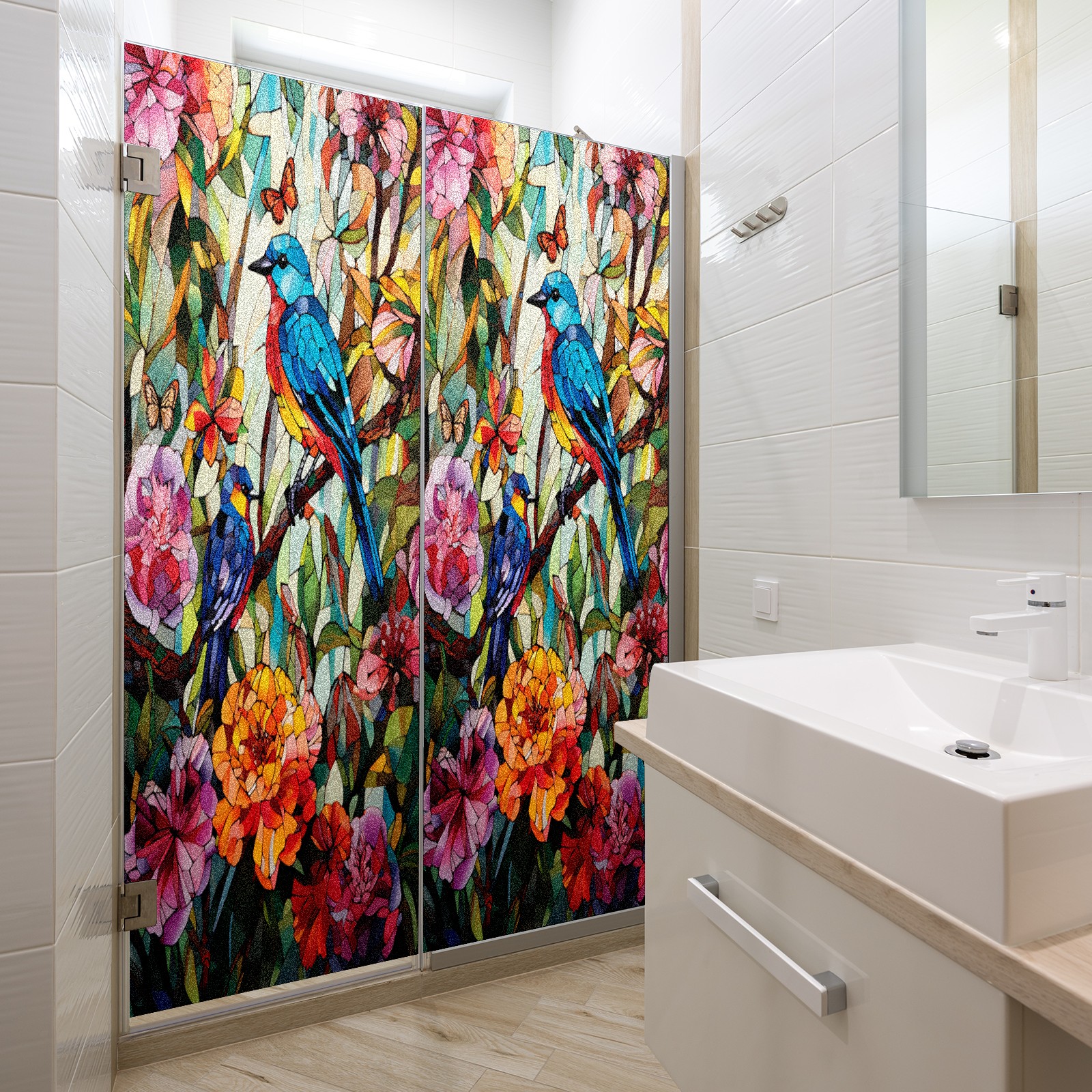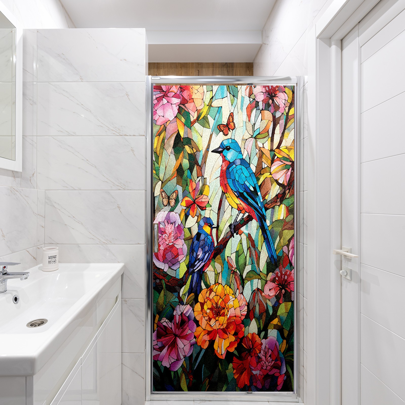 Frosted Glass Window Film Privacy Film Stained Glass Decals for Bathroom Shower Door Artistic Colorful Birds Design Non Adhesive
