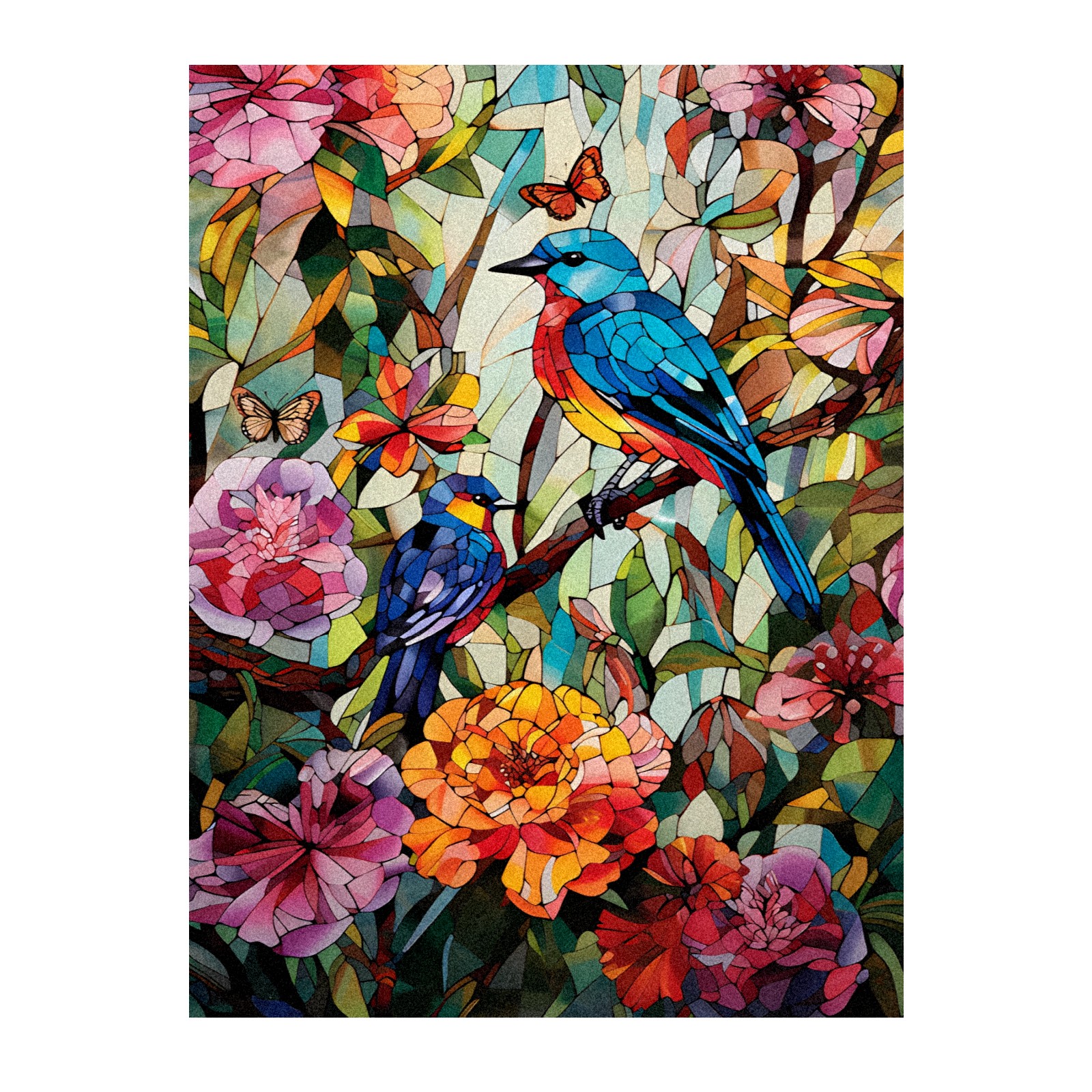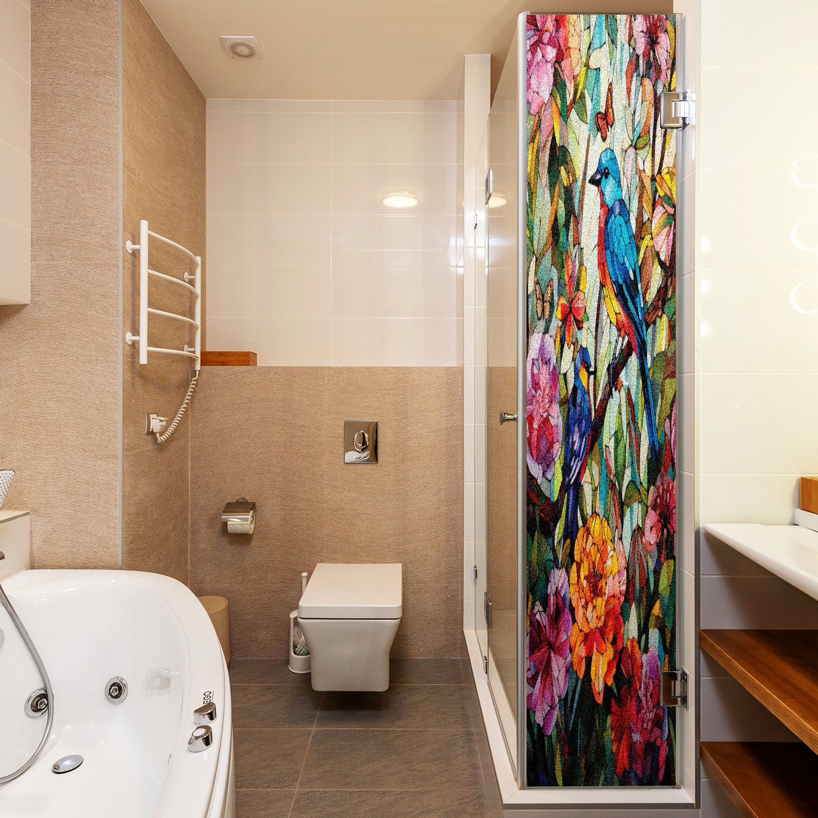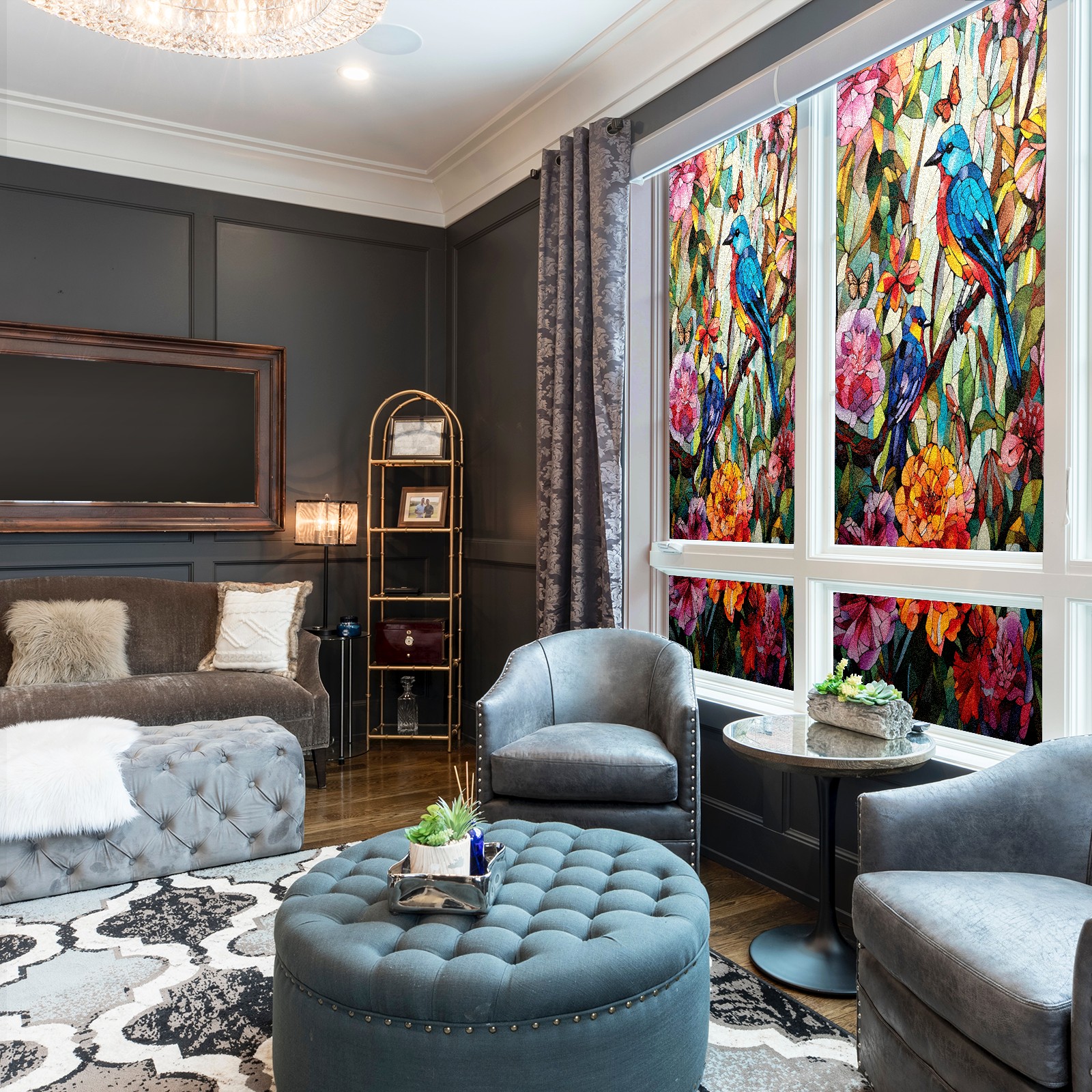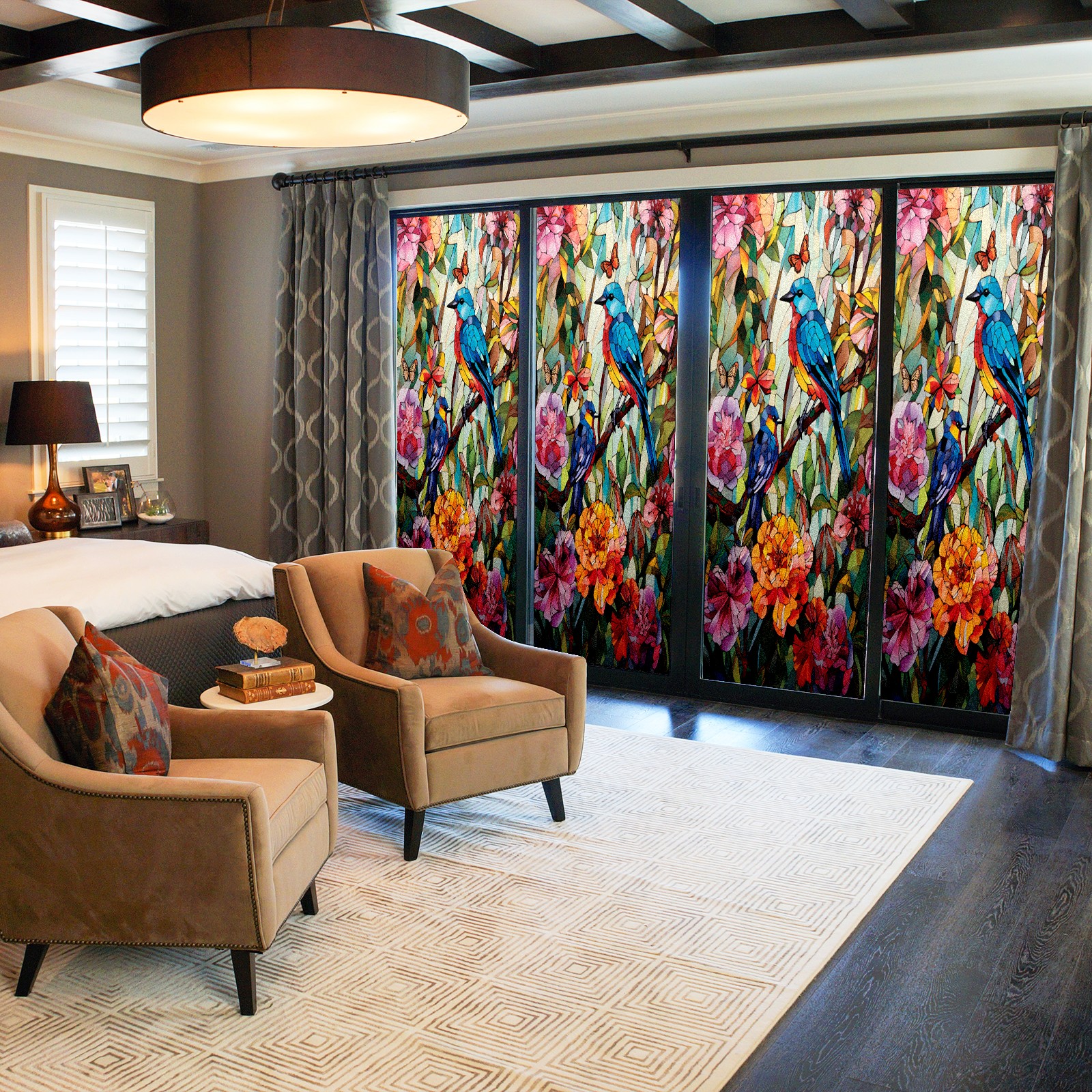 Frosted Glass Window Film Privacy Film Stained Glass Decals for Bathroom Shower Door Artistic Colorful Birds Design Non Adhesive