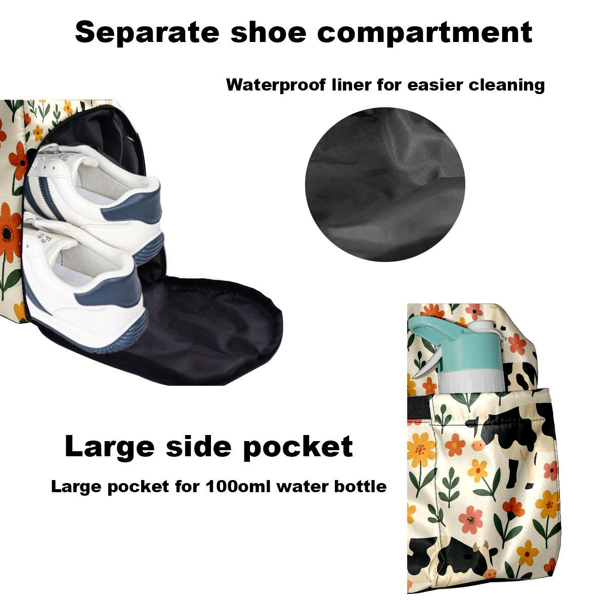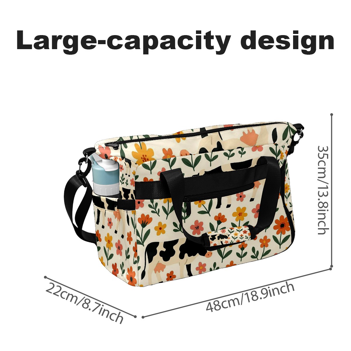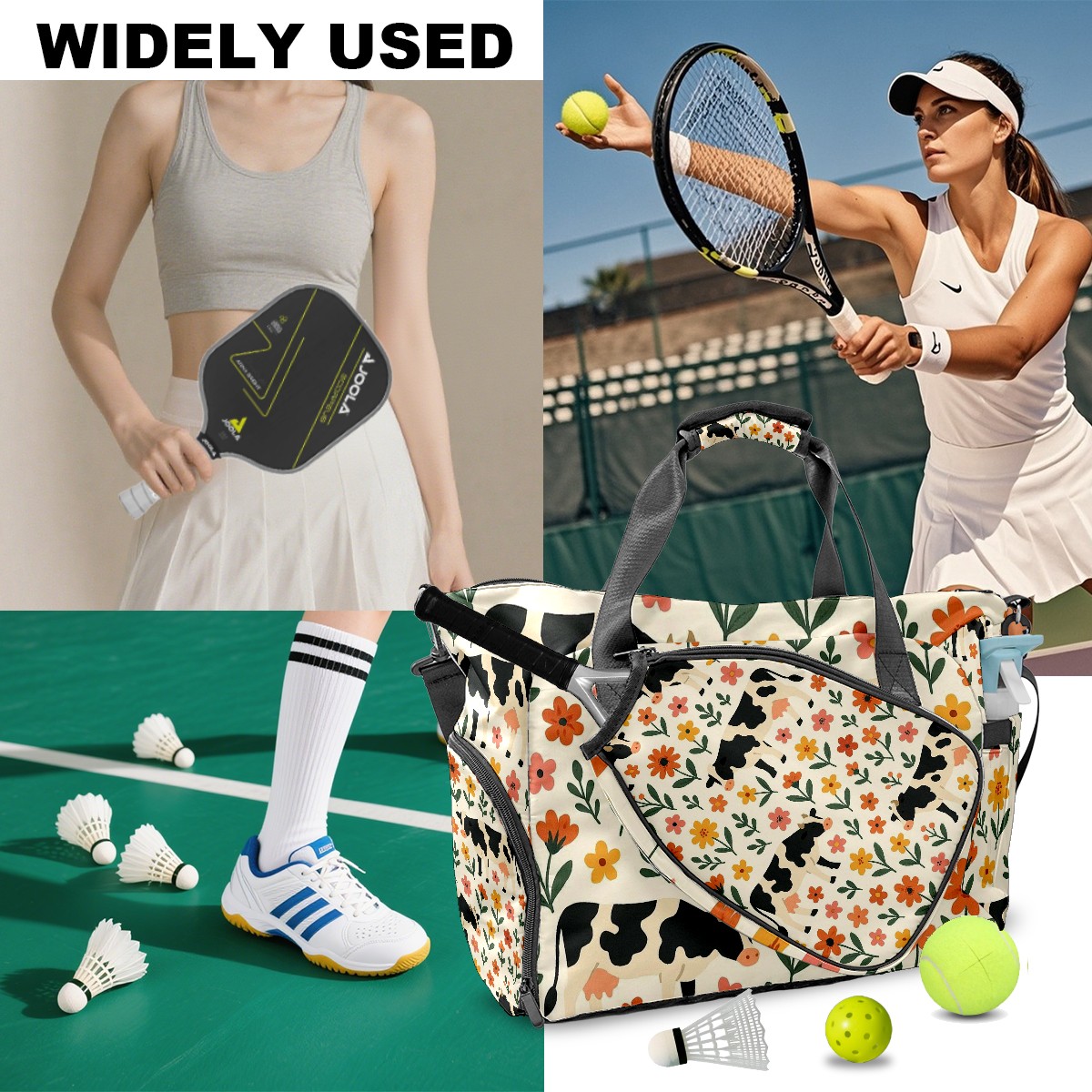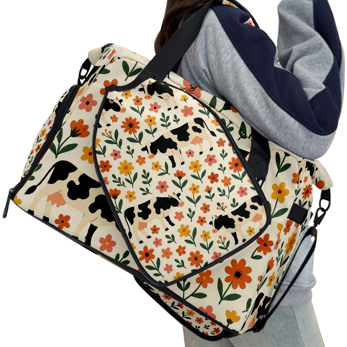 Women's Tennis Bag Large Capacity - Ventilated Shoe Compartment & Waterproof Wet Pocket, Multi-Functional Gym Duffel Bag for Tennis, Yoga, Travel (Warm Flower Cow Beige)