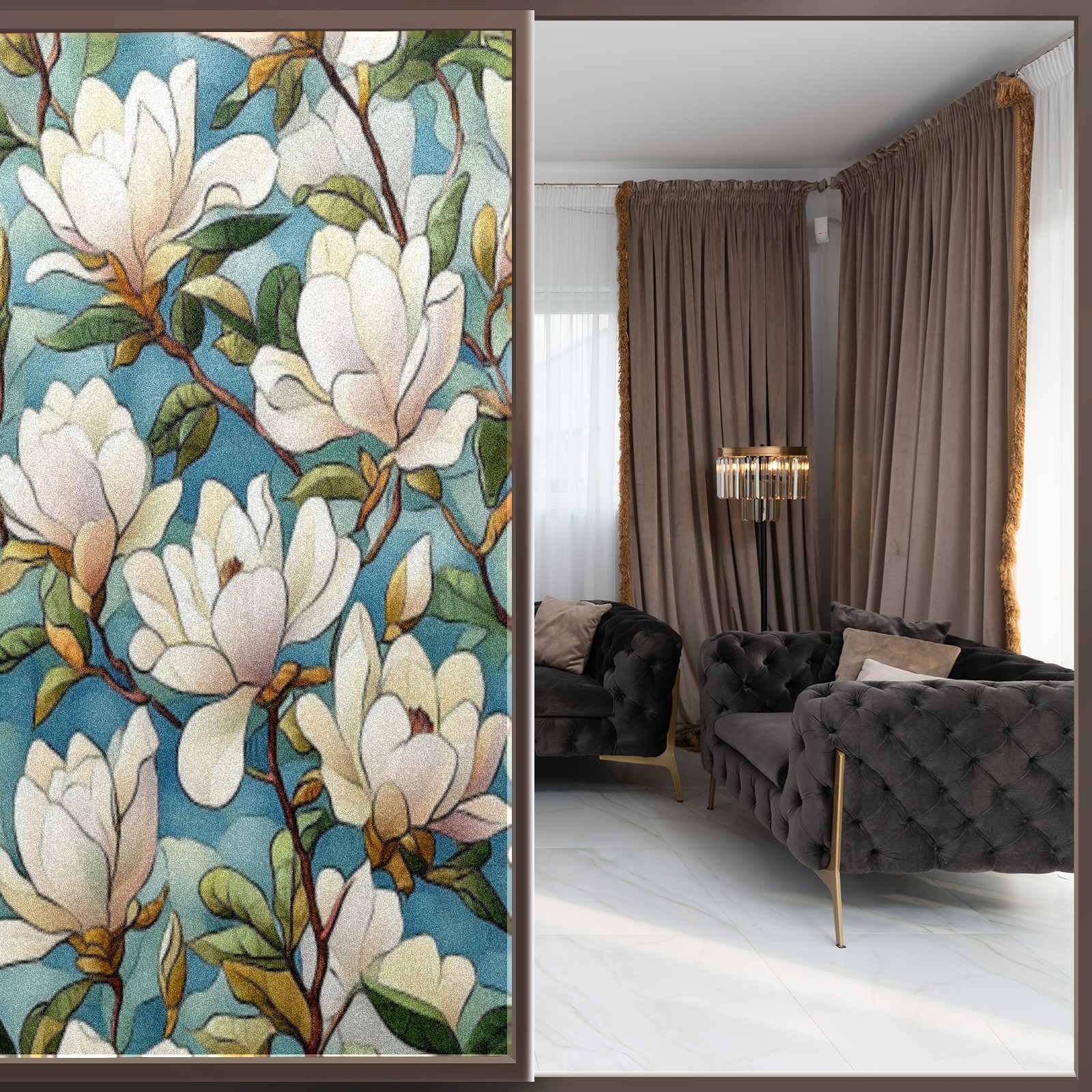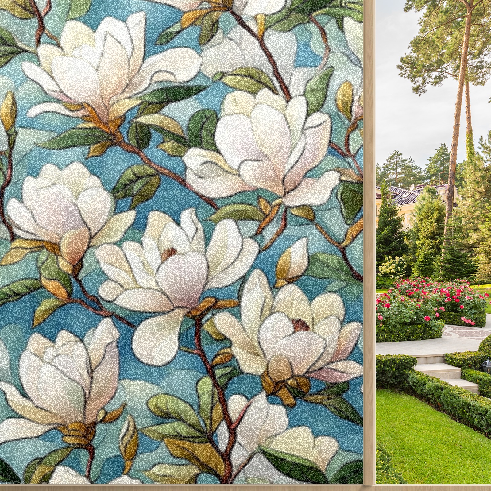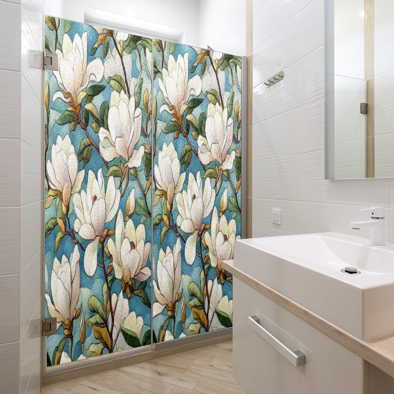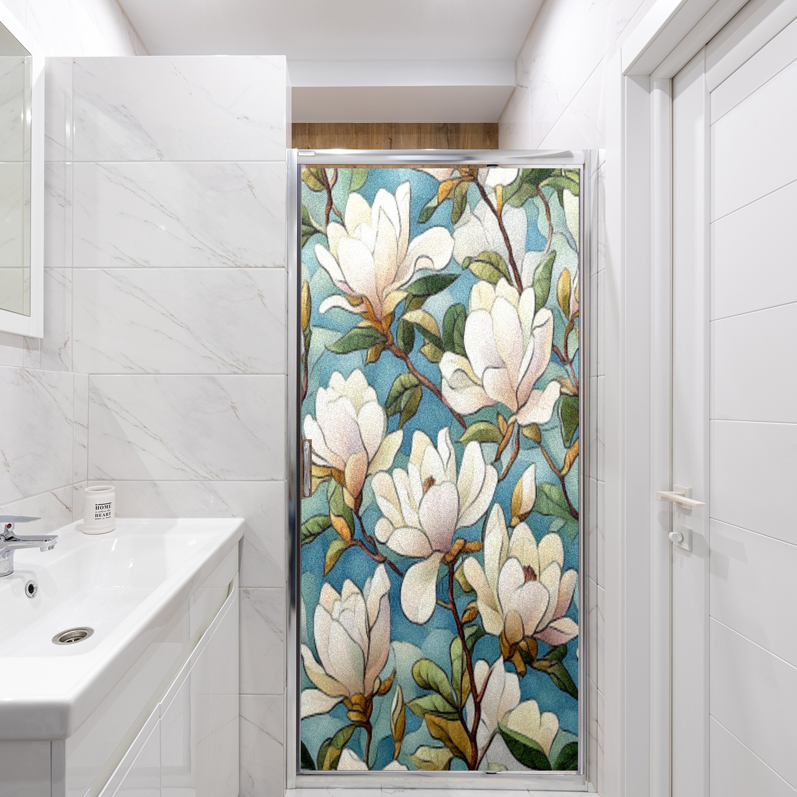 Frosted Glass Window Film Privacy Film Decorative Static Cling Window Film Stained Glass Decals for Bathroom Shower Door Non Adhesive Elegant White Magnolia Glass (17.7x23.6in)