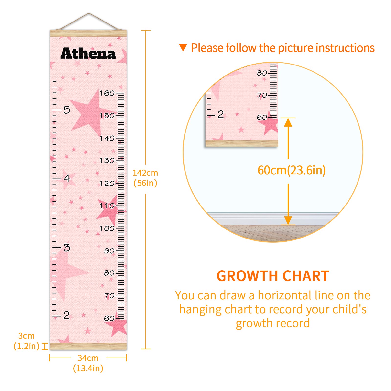 • <p><b>Features:</b></p> <p>Rope for Hanging</p> <p>Material: Linen + Wood</p> <p>Dimensions: 13.4x56 inches</p> <p>Package Included: 1 * Baby Growth Chart</p> <p><b>Baby height growth chart can be used anywhere</b></p> <p>Ideal for kids nursery decoration, kids bedroom, interior walls or windows, playroom, living room, homedecoration.Add name and make the growth chart special!</p> <p><b>Easy to fold and carry</b></p> <p>With rope at the top of the growth chart, it is easy to install and remove.You can fold it and unfold any time any where.</p> <p><b>Perfect Gift Idea for Kids</b></p> <p>Environmental and non-toxic for kids use, it must be a perfect gift for baby, kids, girls, and boys.This is a best choice for your friend who have kids or baby as a popular gift.</p> <p><b>Easy to read</b></p> <p>Measurement accrate with 2 scales, Centimeters and feet. The letters are big enough, very easy to read.</p> <p><b>60cm(23.6inch) Over Ground Design</b></p> <p>Not only can protect from dust and other damage, but also will not interfere in floor cleaning.</p>