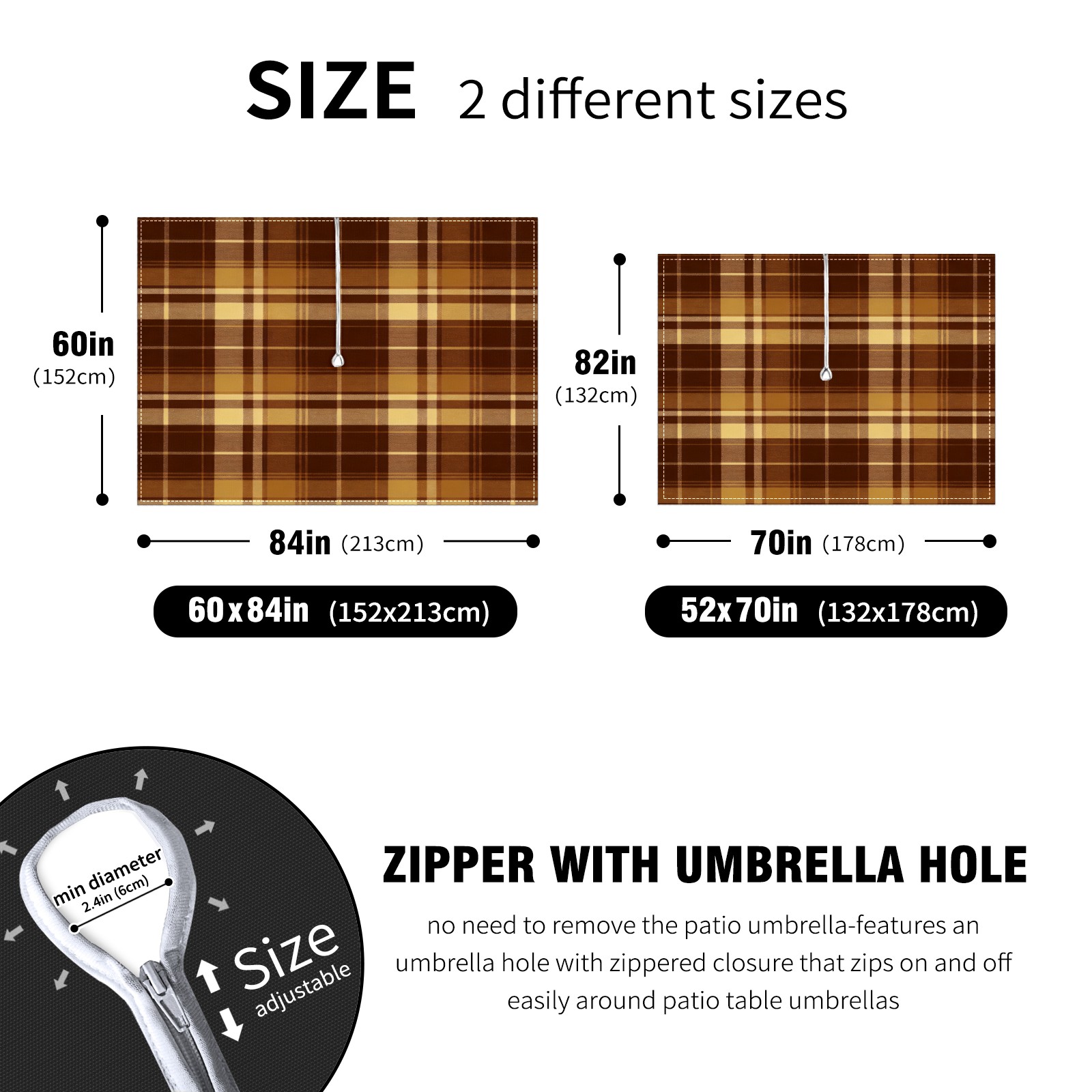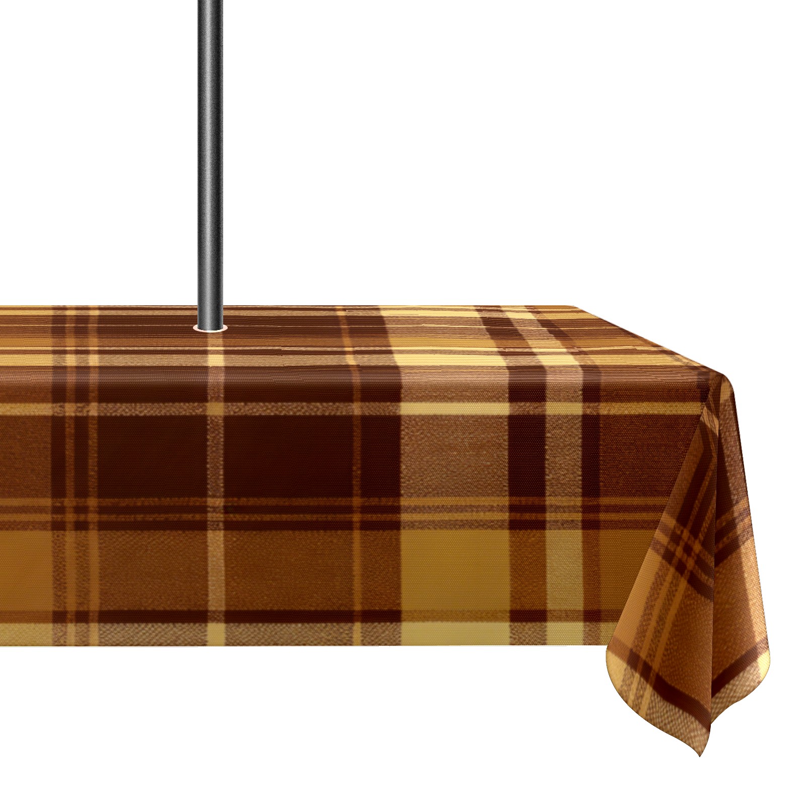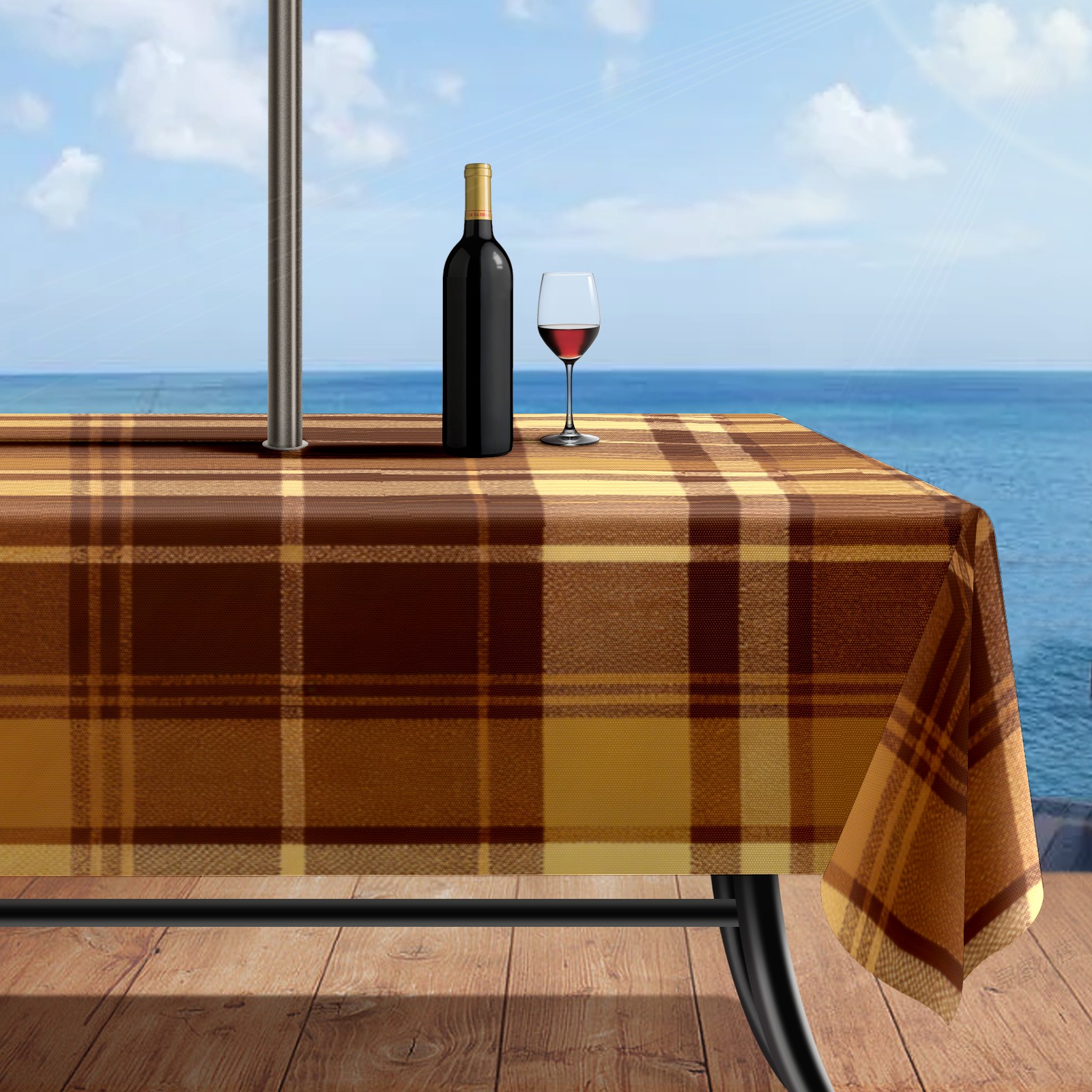 Outdoor Tablecloth with Zipper and Umbrella Eyelets Brown Plaid Ideal Tablecloth for Picnic, Camping, Terrace and Garden Use (52x70in)