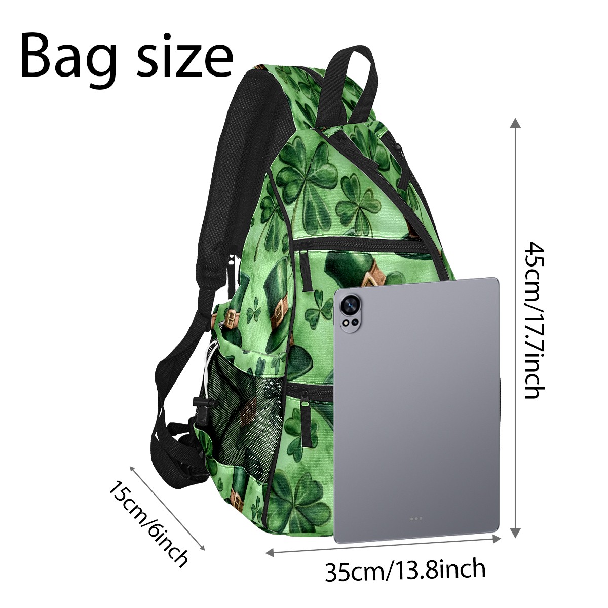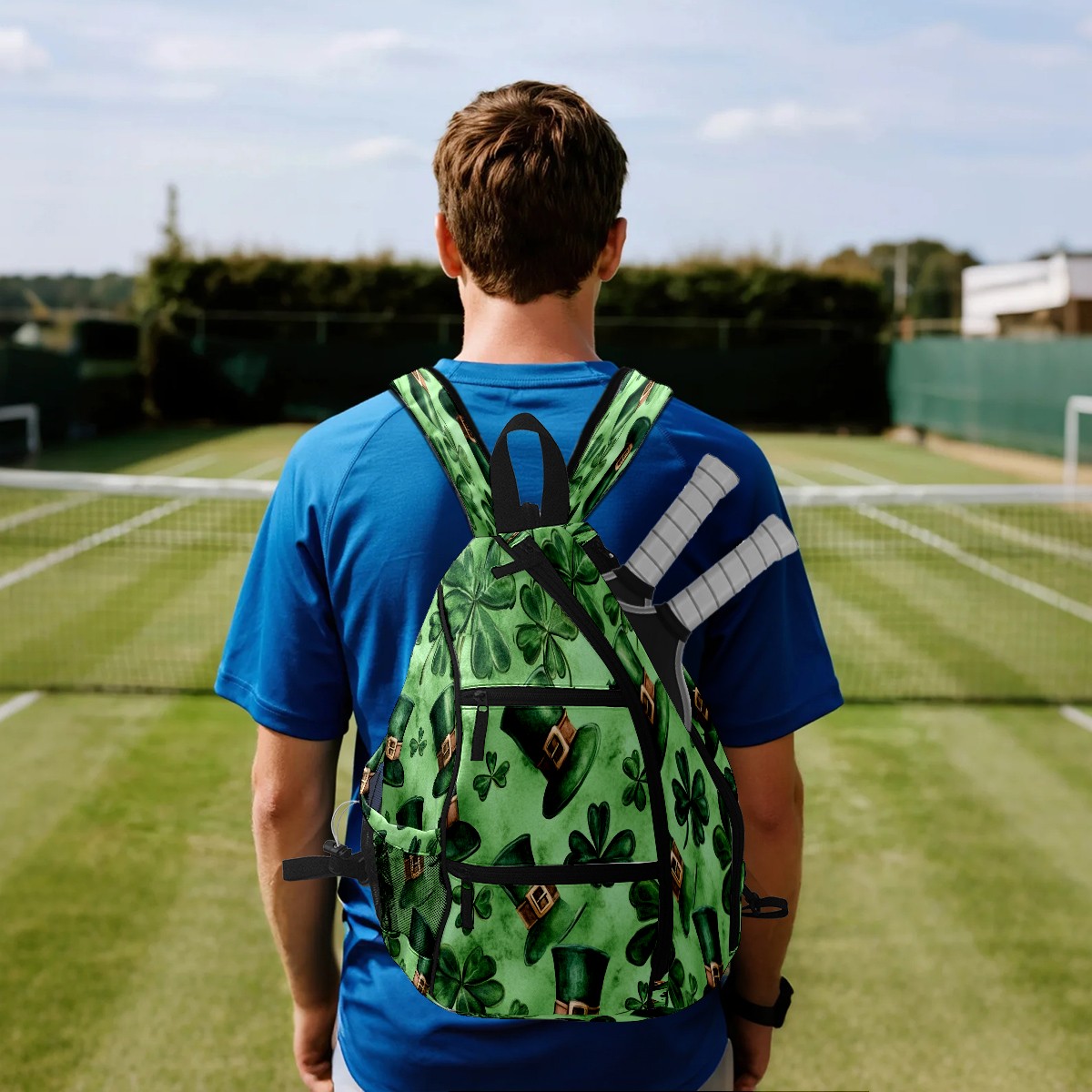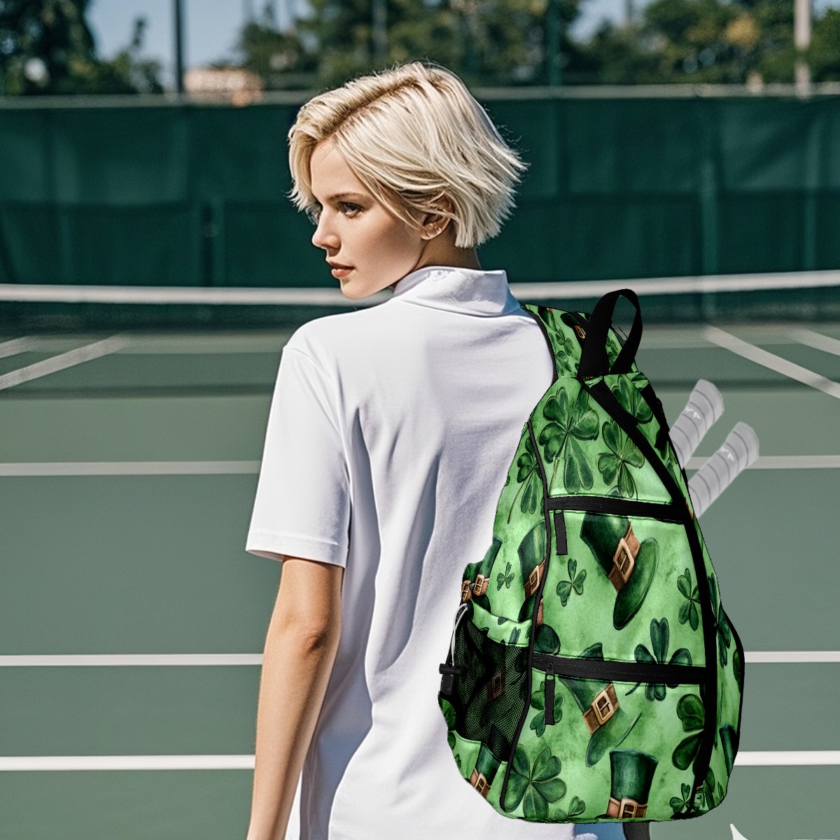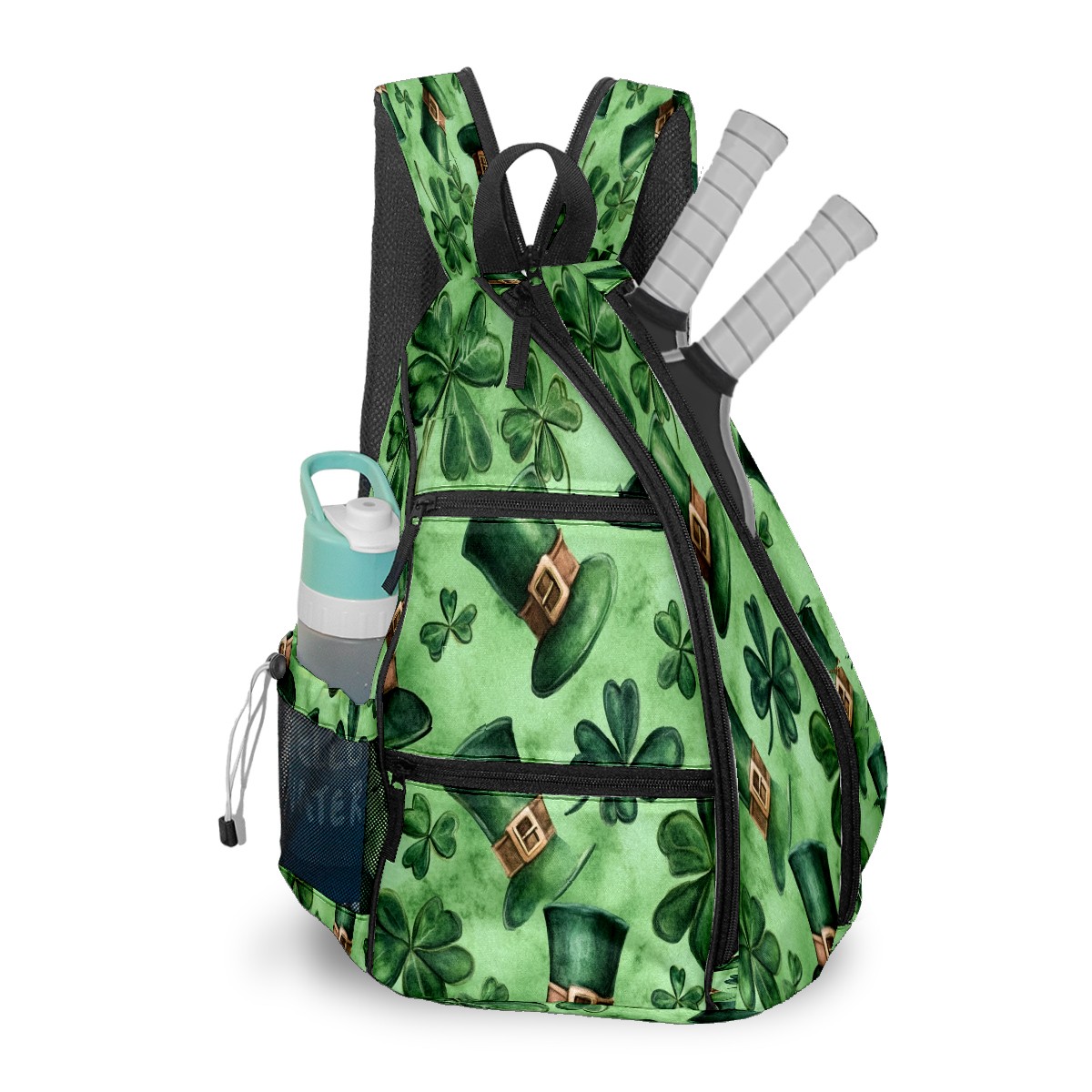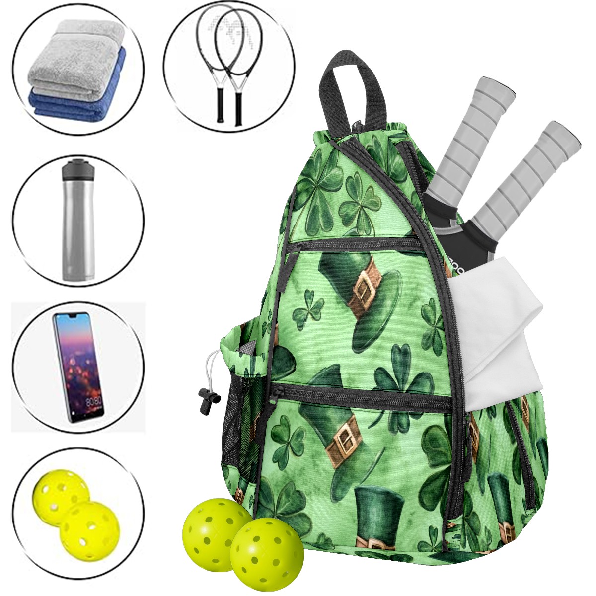 Pickleball Backpack for Women and Men, Adjustable Pickleball Sling Bag for Paddles, Balls & Accessories (Watercolor Shamrock Hats)