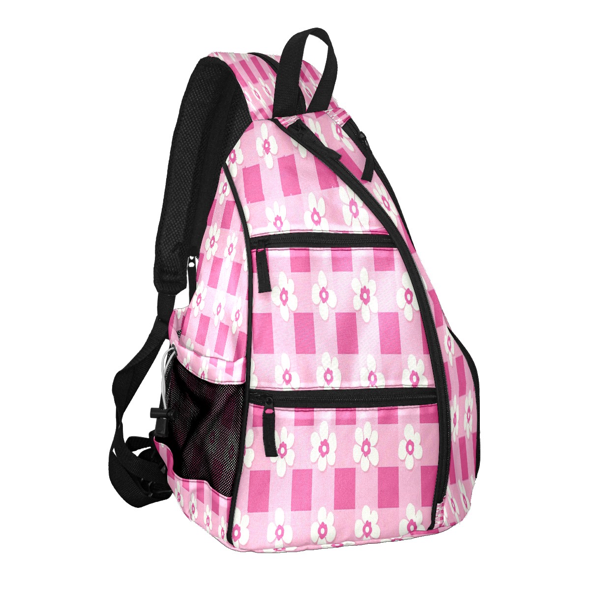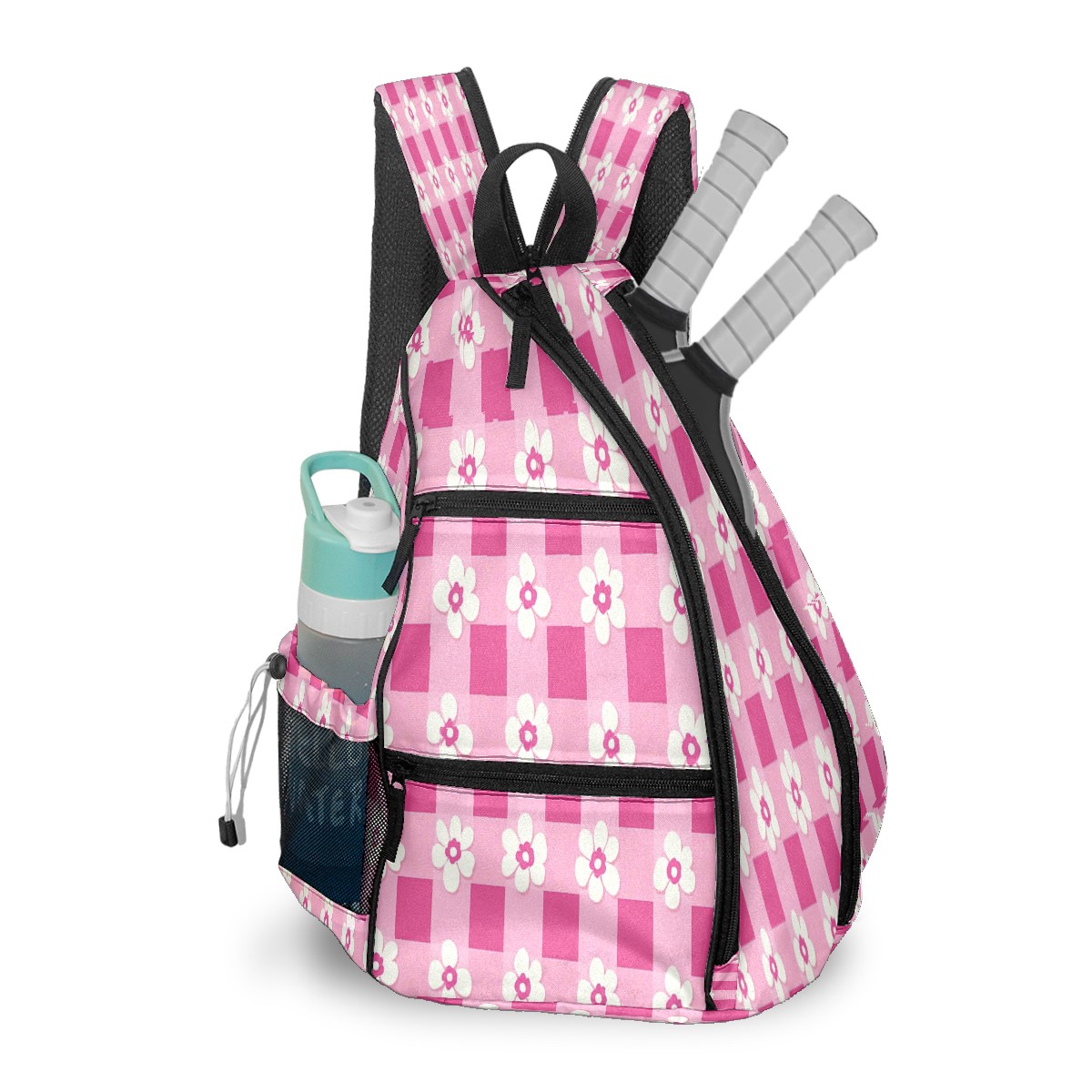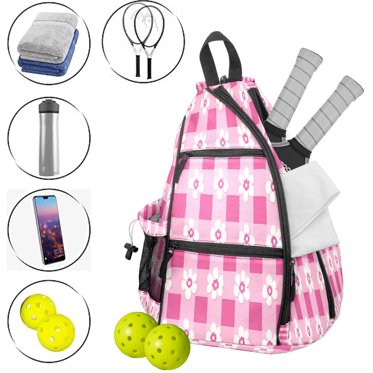 Pickleball Backpack for Women and Men, Adjustable Pickleball Sling Bag for Paddles, Balls & Accessories (Pink Gingham With Flowers)