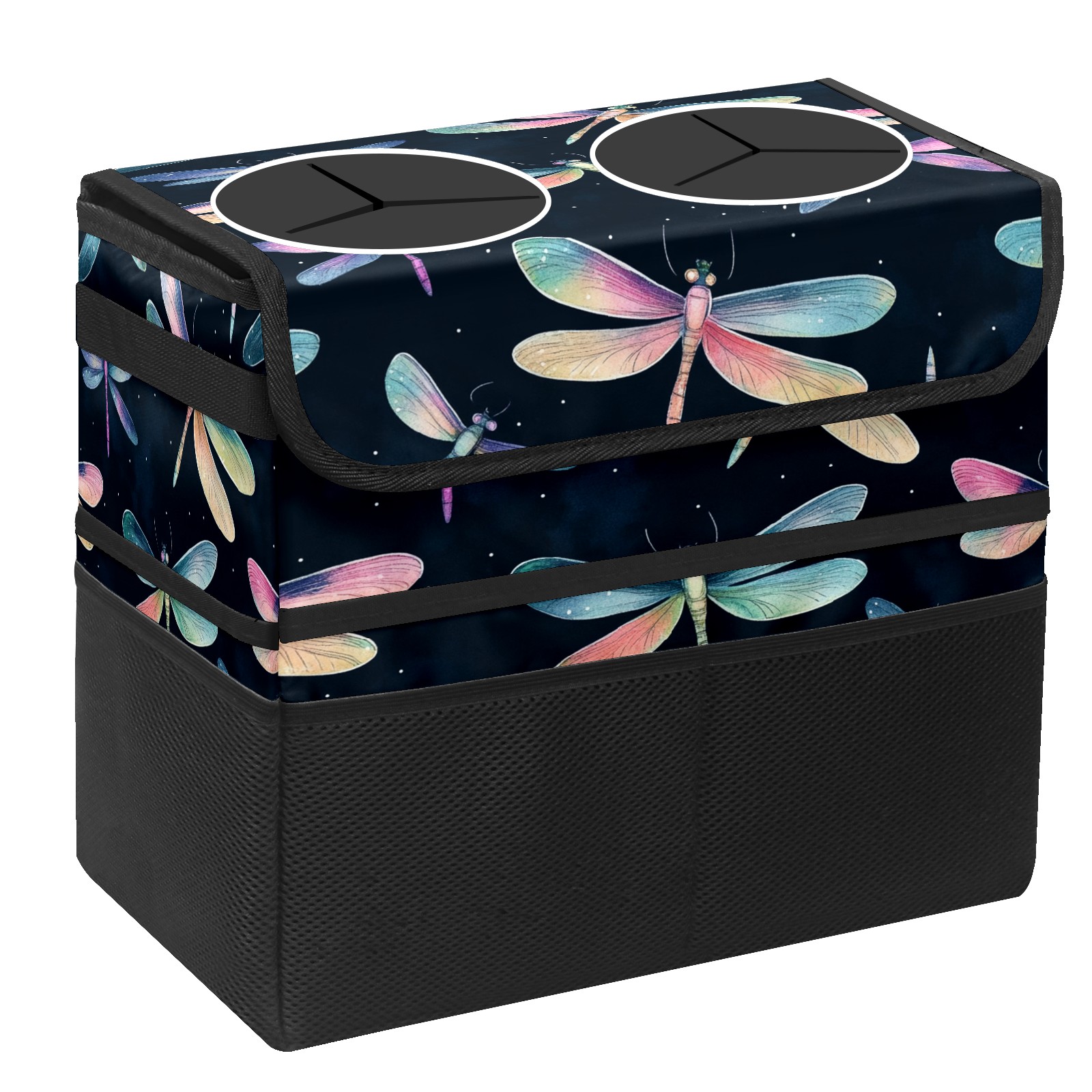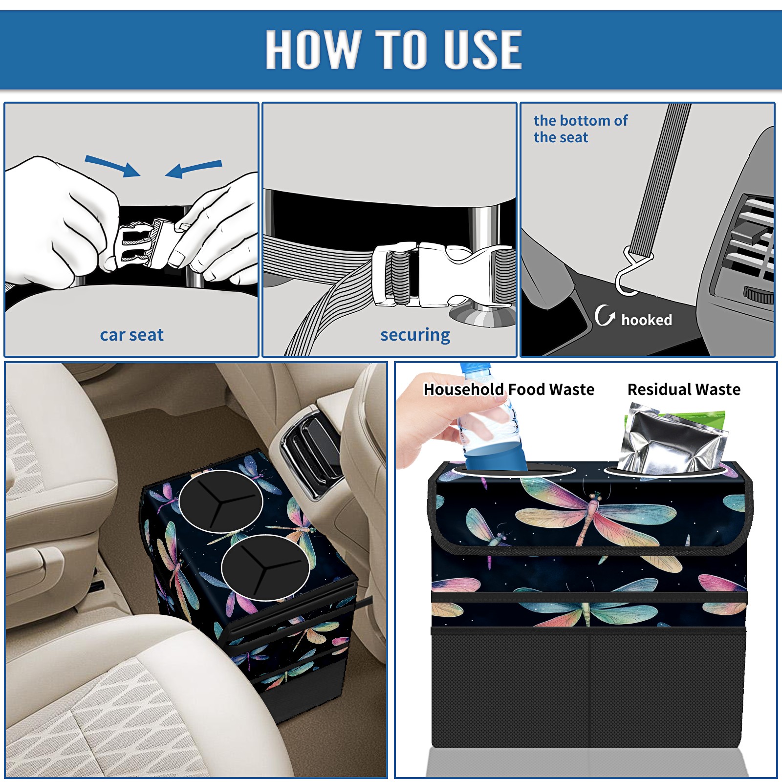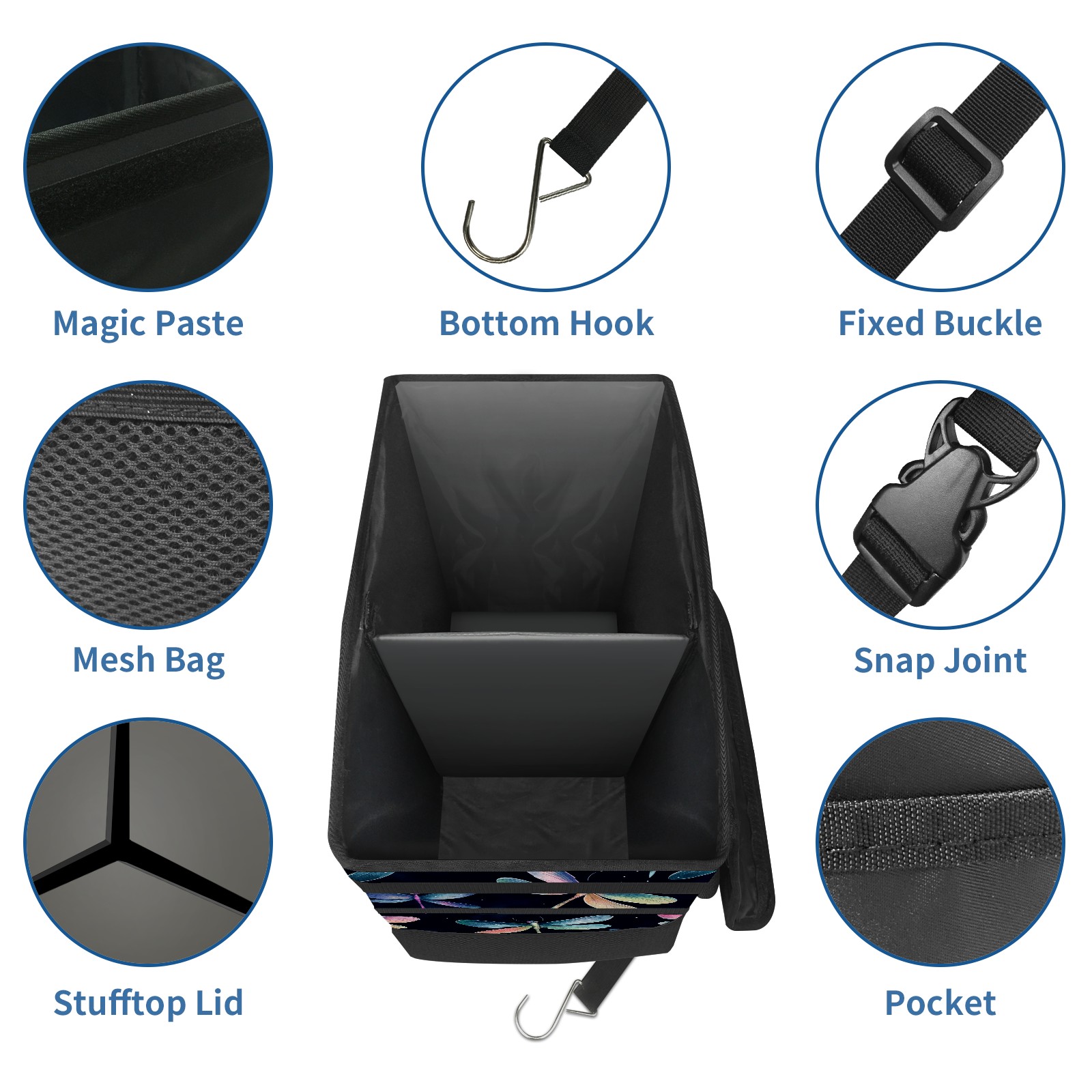 Car Trash Can with Lid, Portable Hanging Automotive Garbage Bin for Vehicles, Leakproof Waste Bag Container for SUV Truck Van Interior Auto Travel Road Trips(Iridescent Dragonflies)