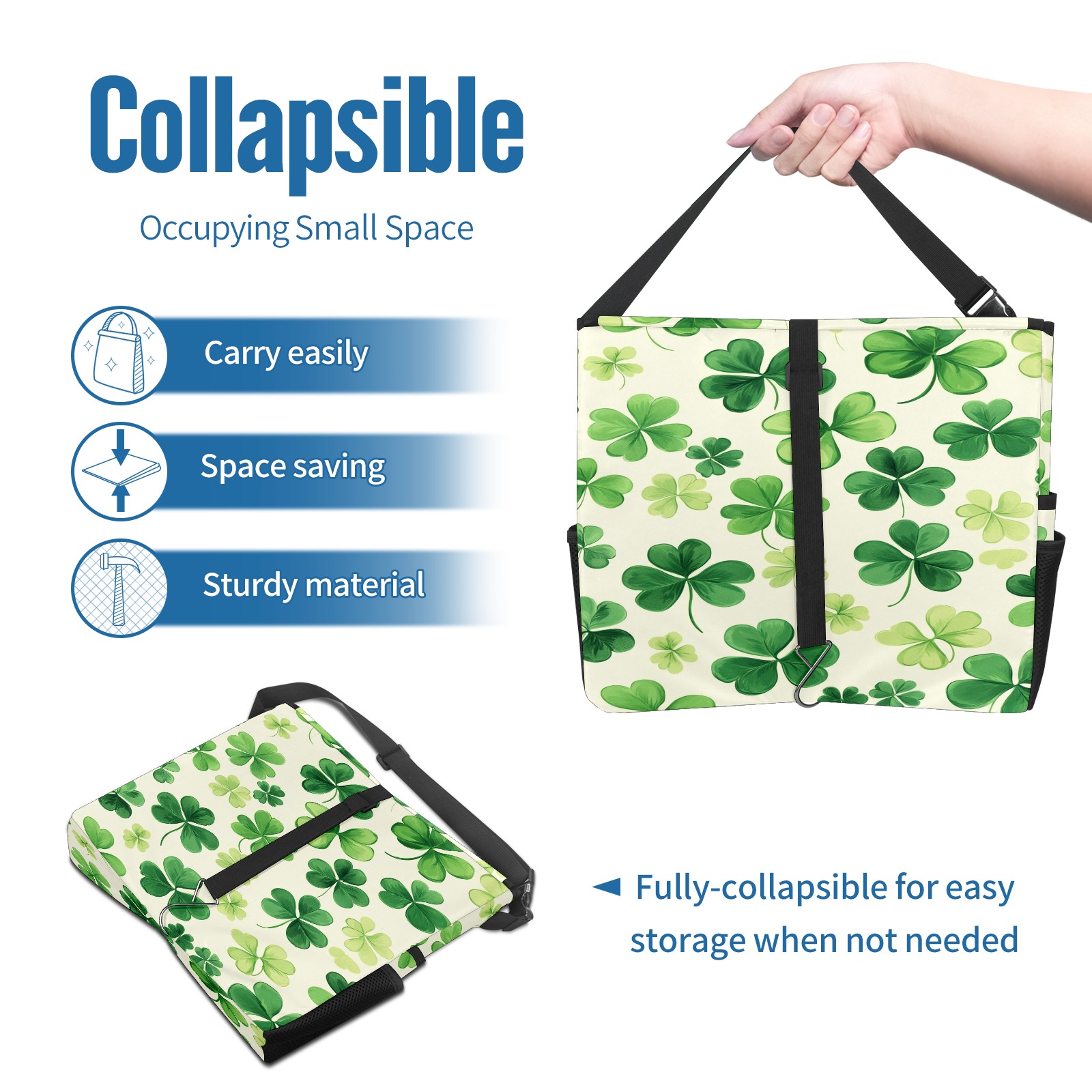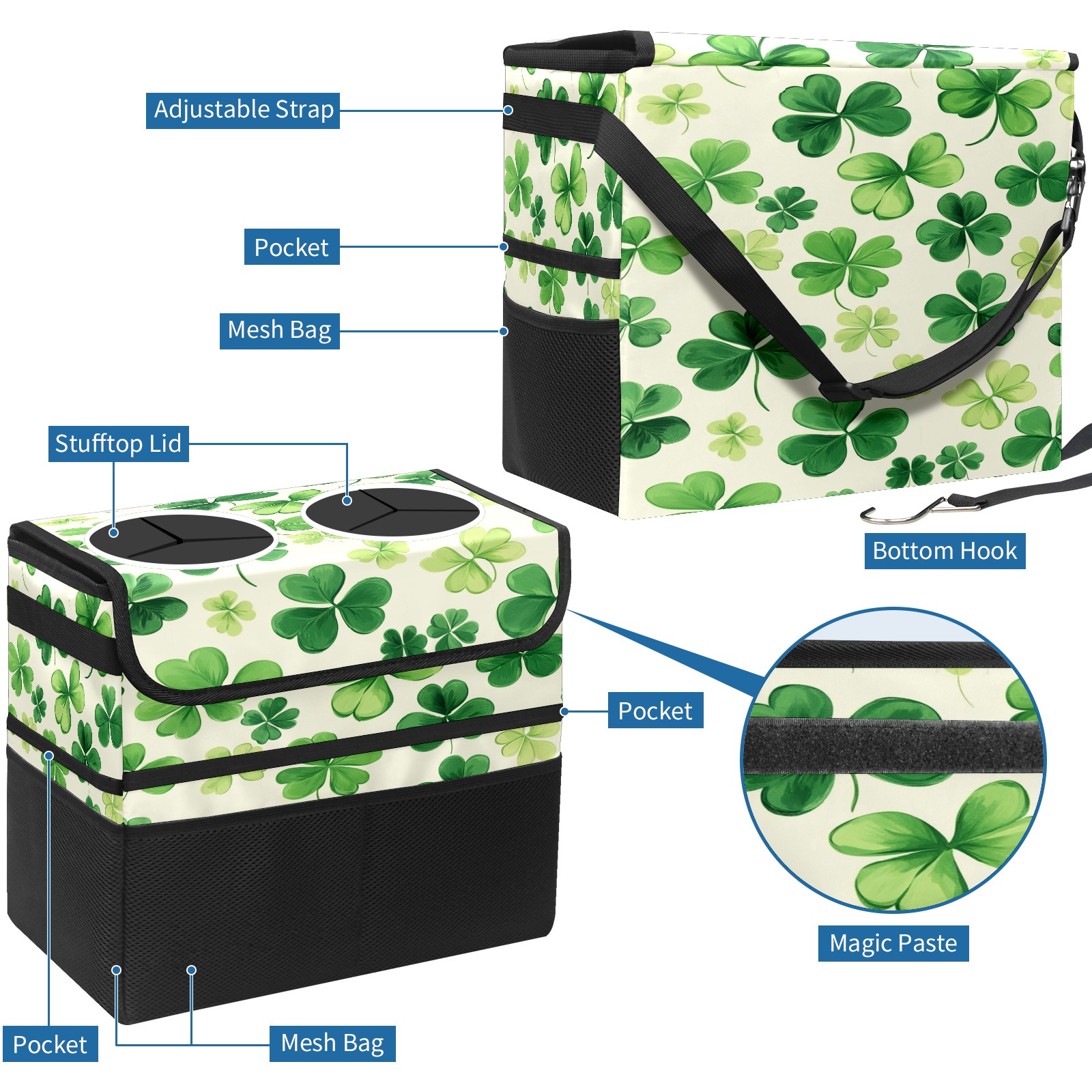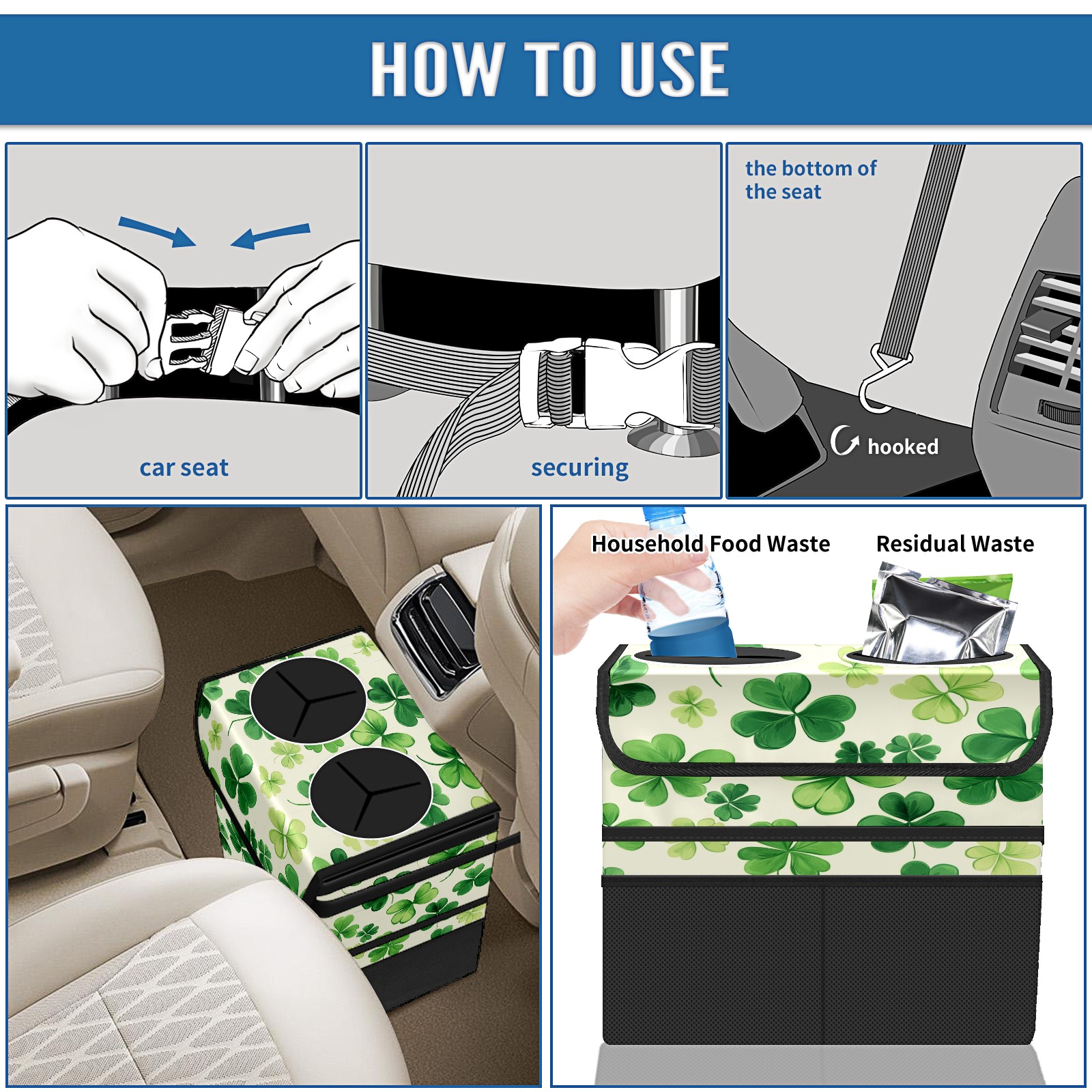 Car Trash Can with Lid, Portable Hanging Automotive Garbage Bin for Vehicles, Leakproof Waste Bag Container for SUV Truck Van Interior Auto Travel Road Trips(Shamrocks)