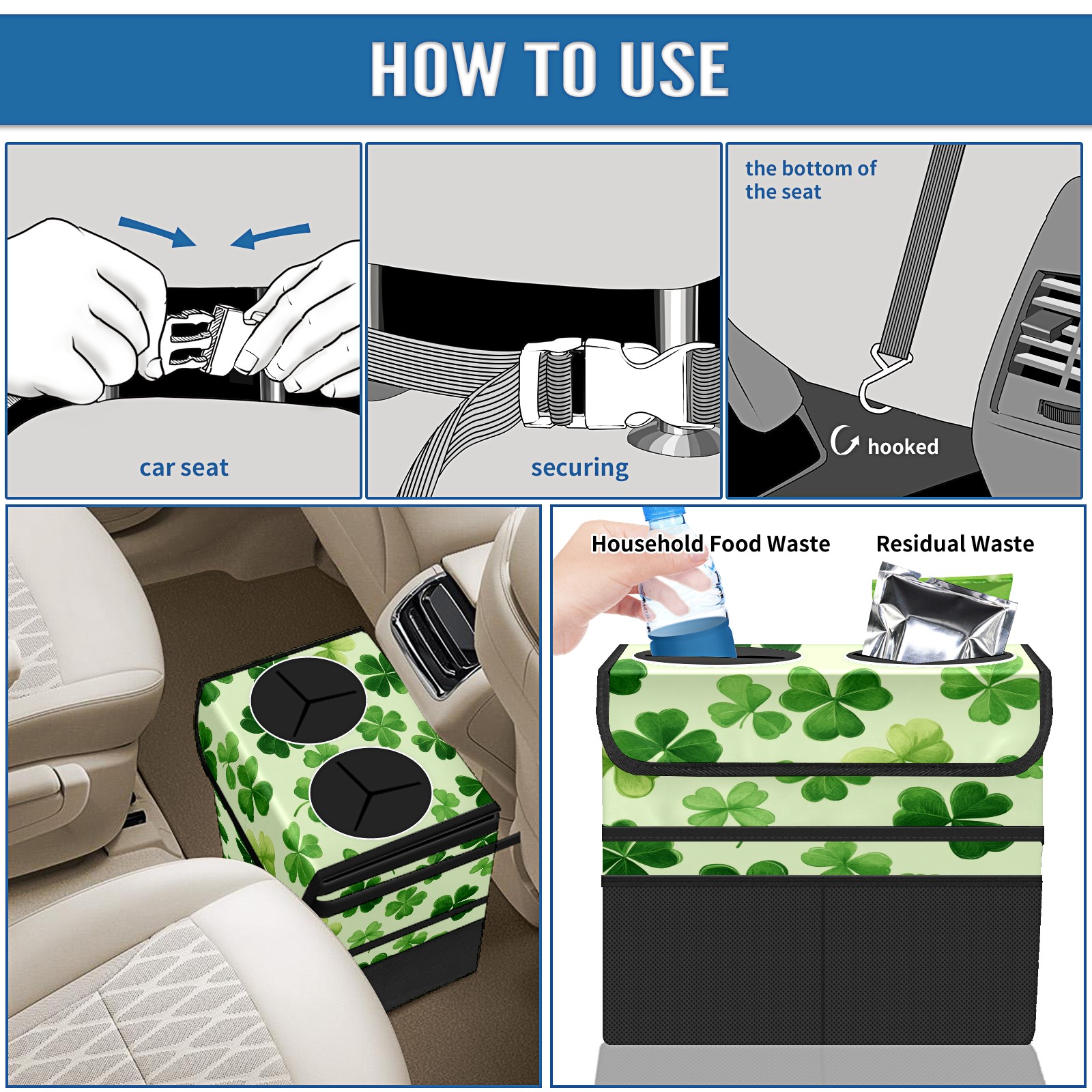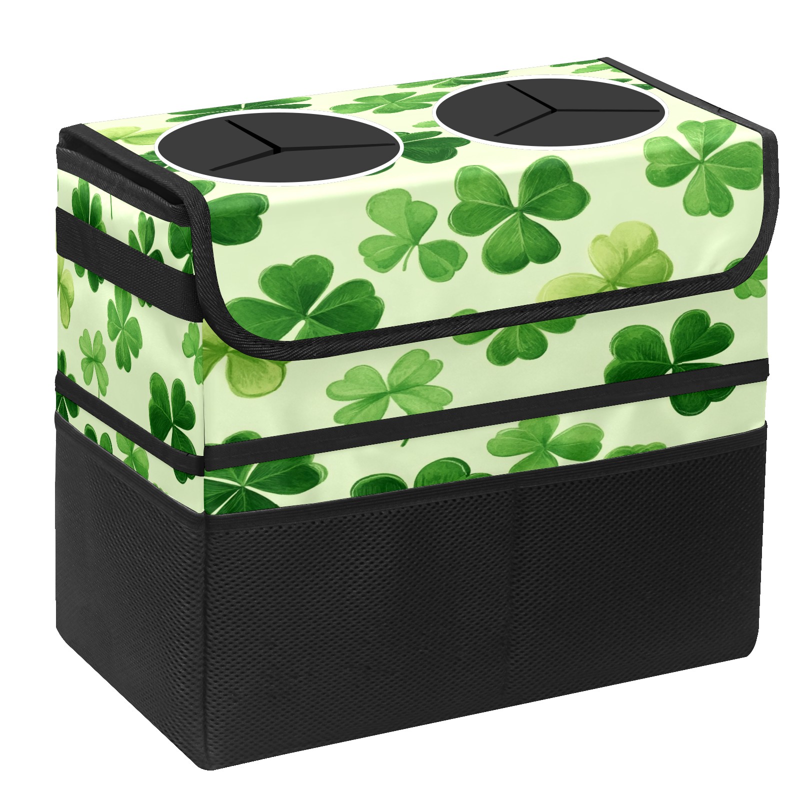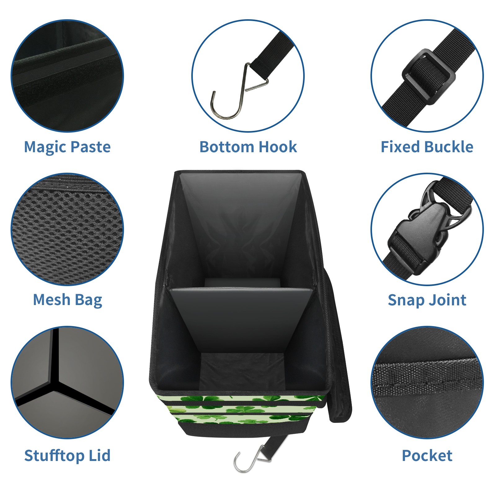 Car Trash Can with Lid, Portable Hanging Automotive Garbage Bin for Vehicles, Leakproof Waste Bag Container for SUV Truck Van Interior Auto Travel Road Trips(Shamrock Leaves)