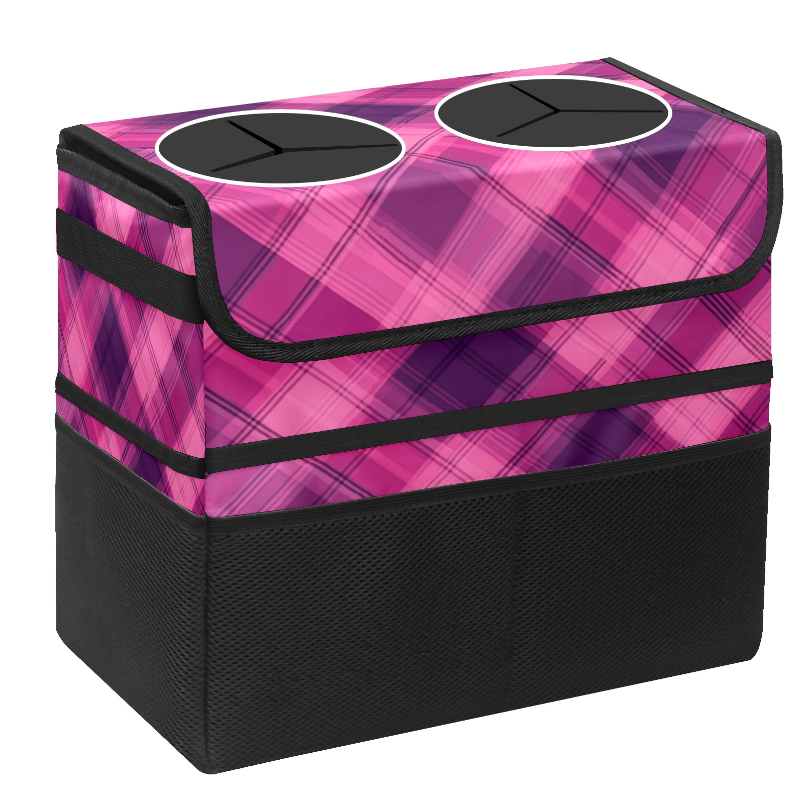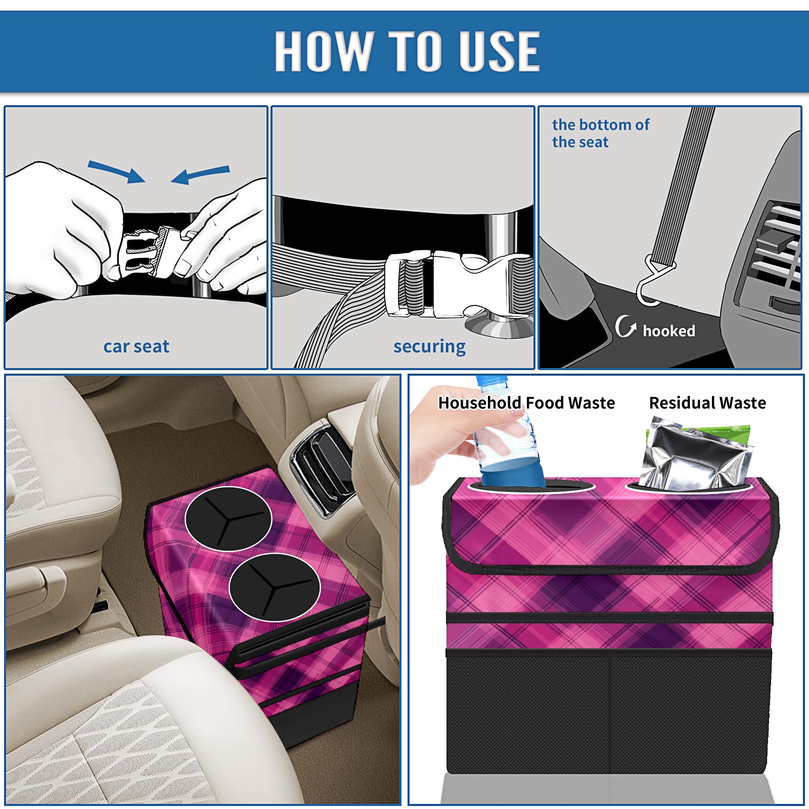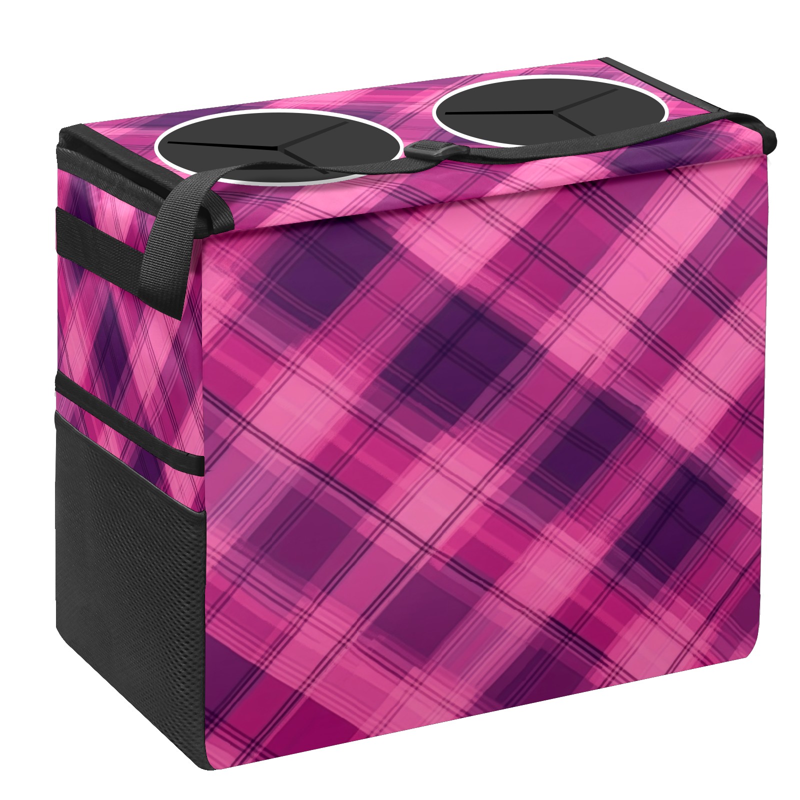 Car Trash Can with Lid, Portable Hanging Automotive Garbage Bin for Vehicles, Leakproof Waste Bag Container for SUV Truck Van Interior Auto Travel Road Trips(Pink And Purple Checkered)
