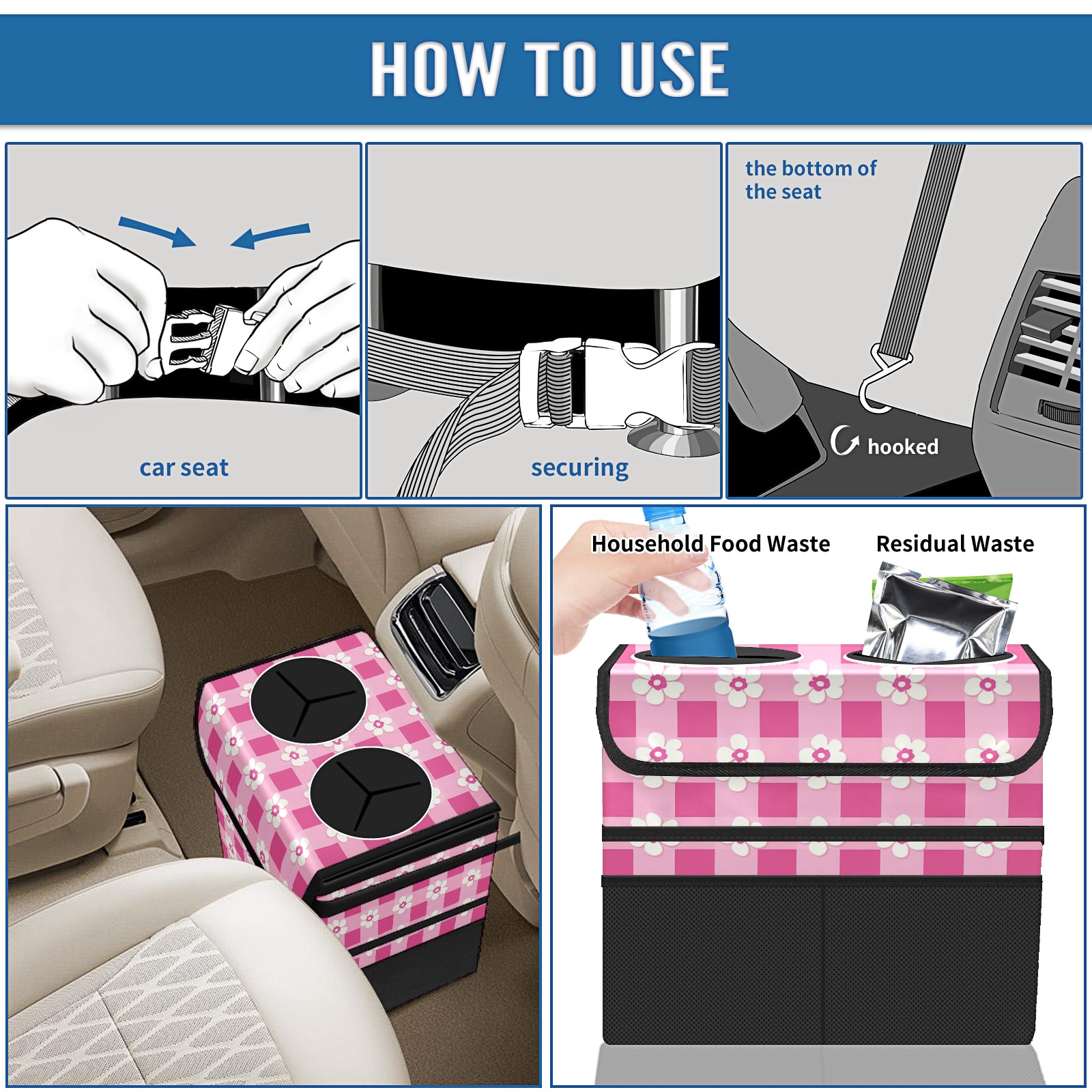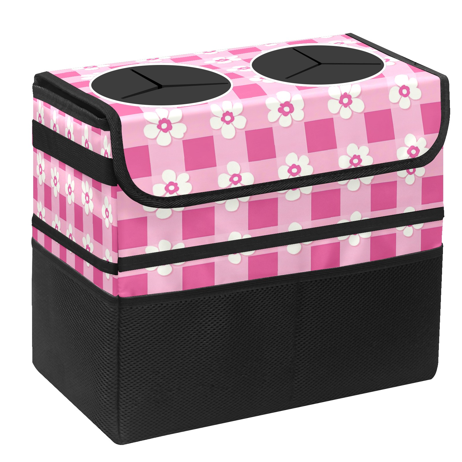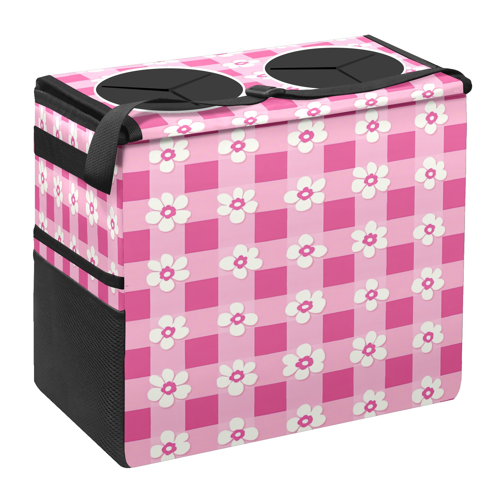 Car Trash Can with Lid, Portable Hanging Automotive Garbage Bin for Vehicles, Leakproof Waste Bag Container for SUV Truck Van Interior Auto Travel Road Trips(Pink Gingham With Flowers)