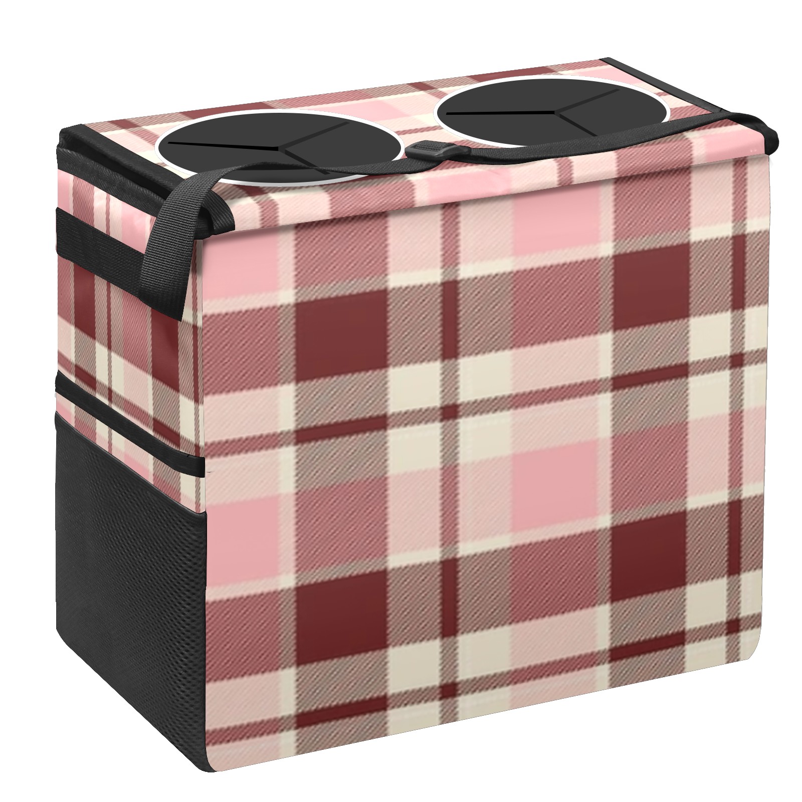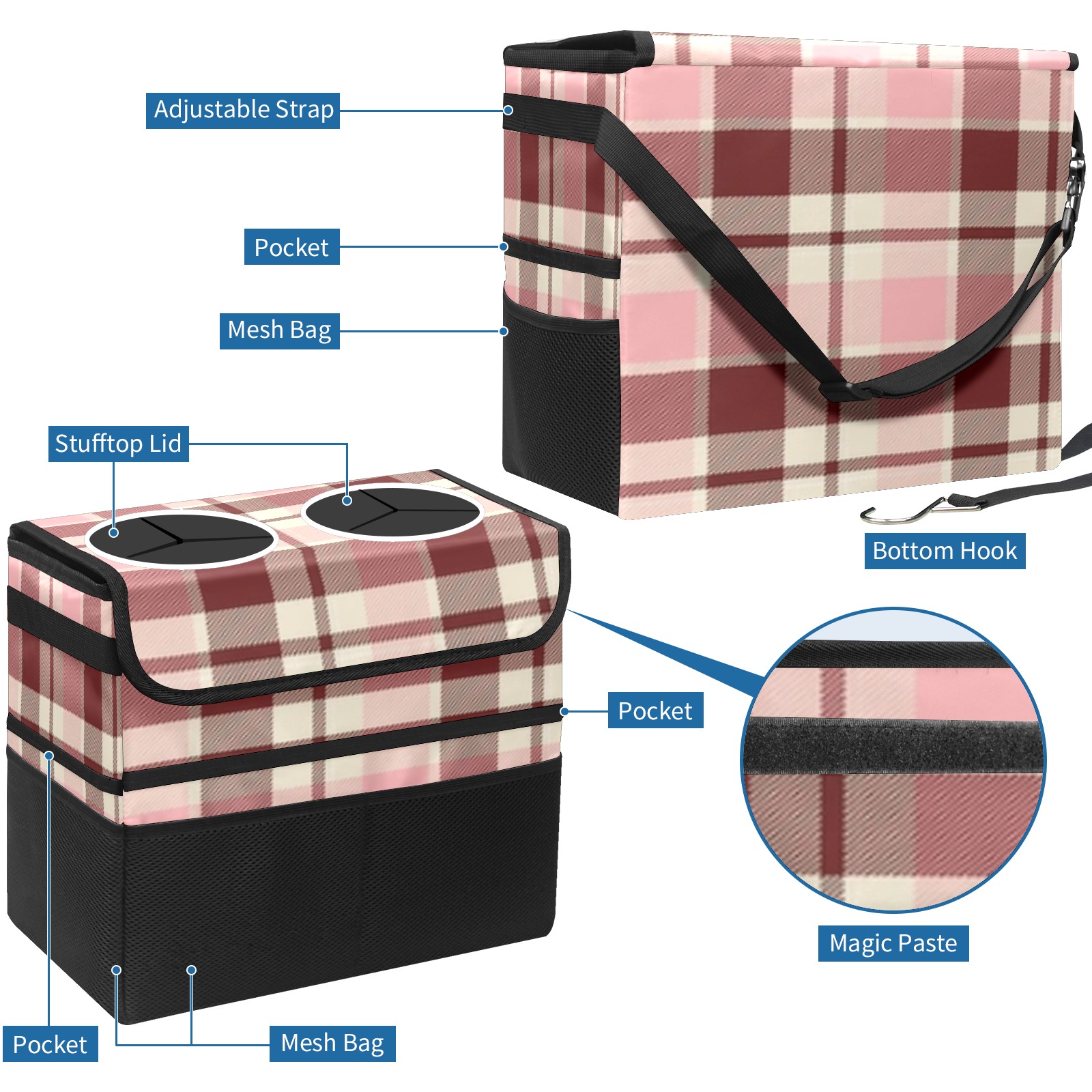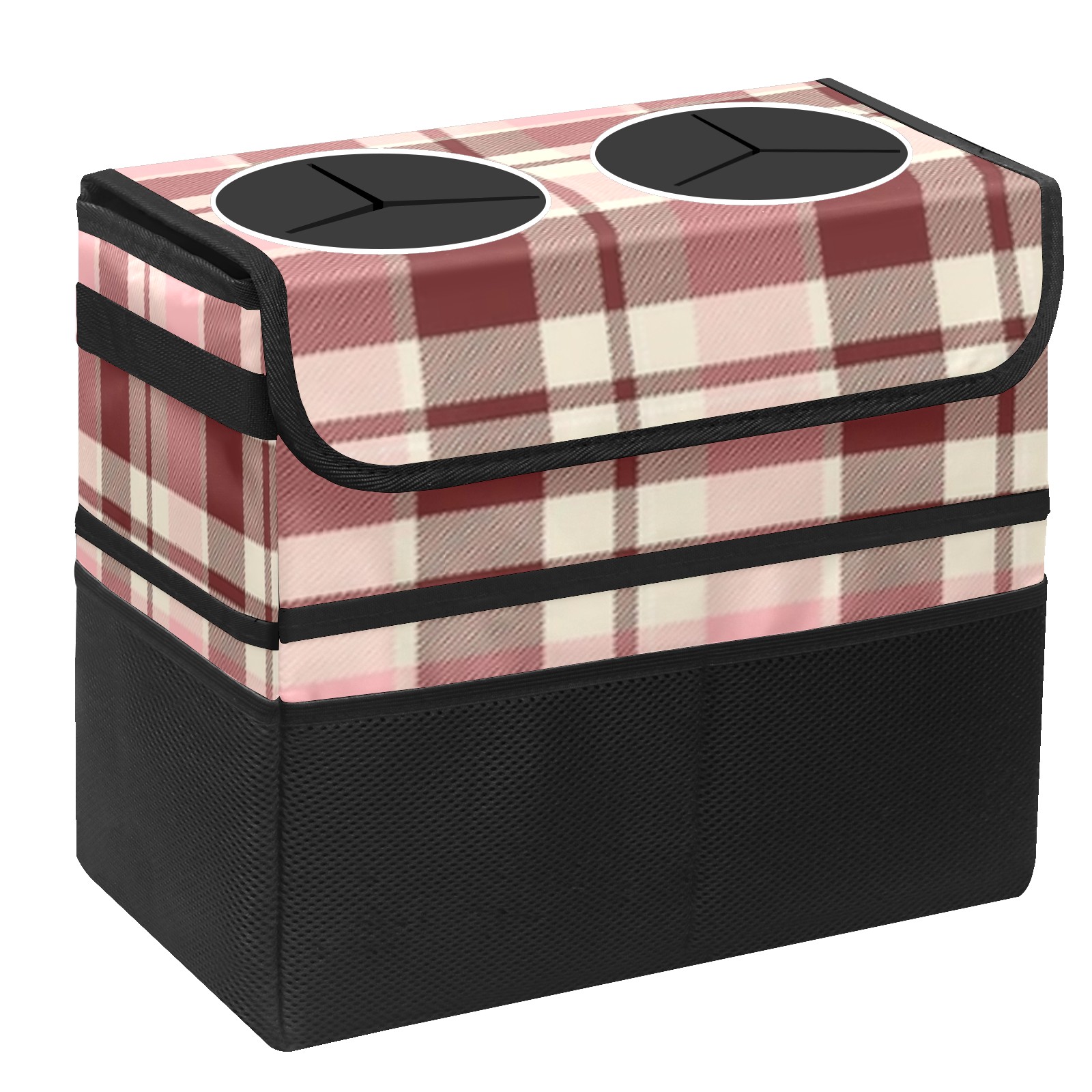 Car Trash Can with Lid, Portable Hanging Automotive Garbage Bin for Vehicles, Leakproof Waste Bag Container for SUV Truck Van Interior Auto Travel Road Trips(Pink And Brown Checkered)